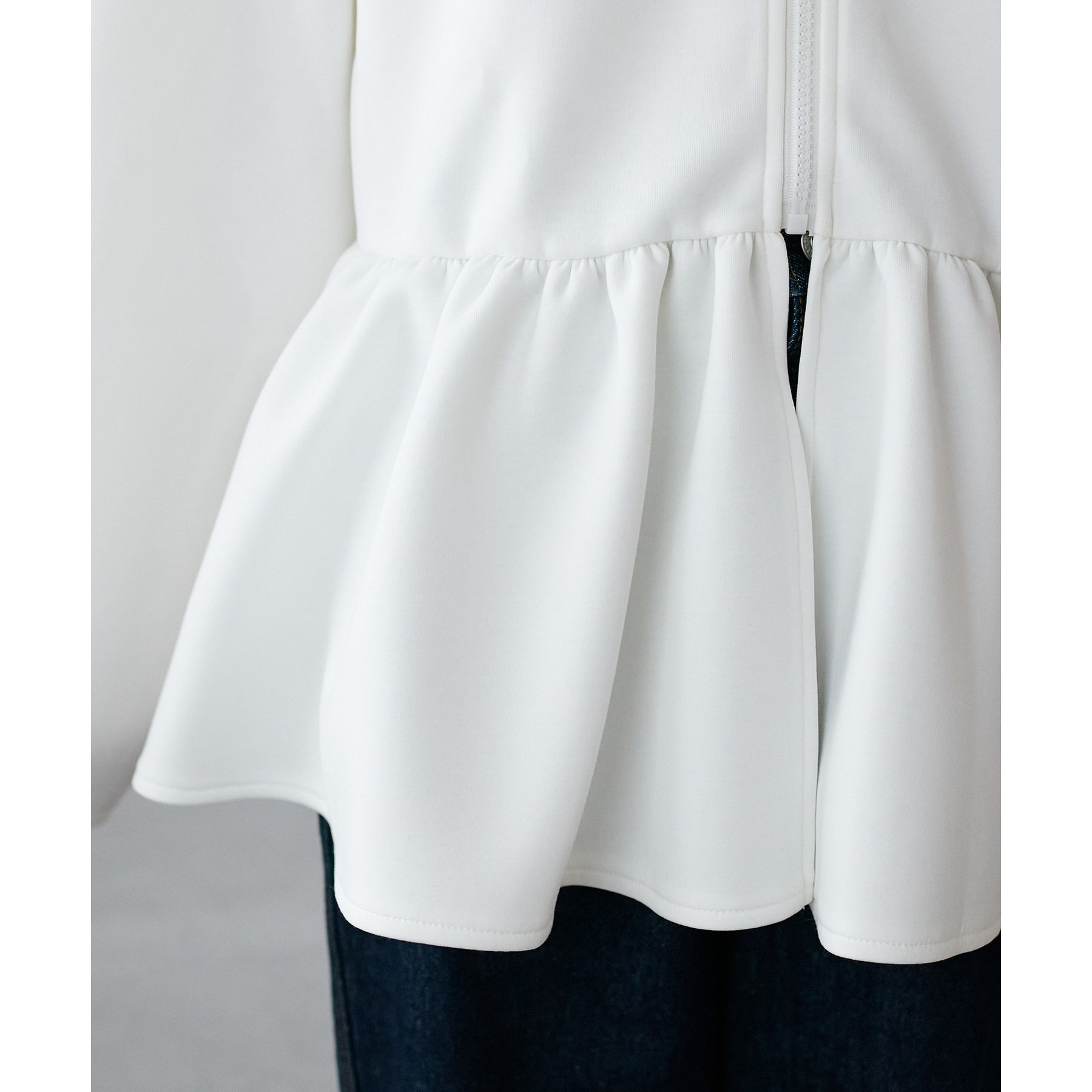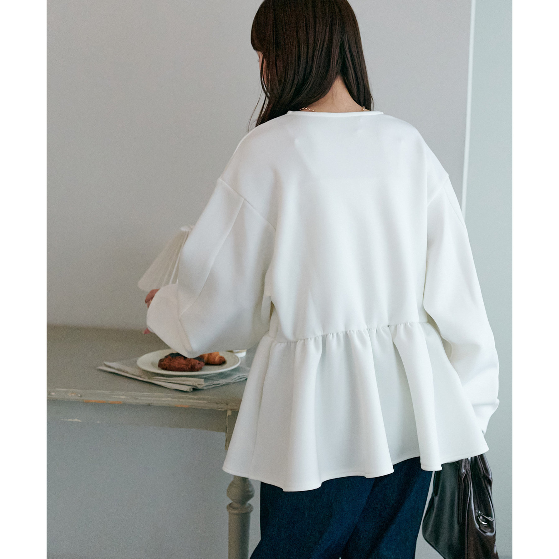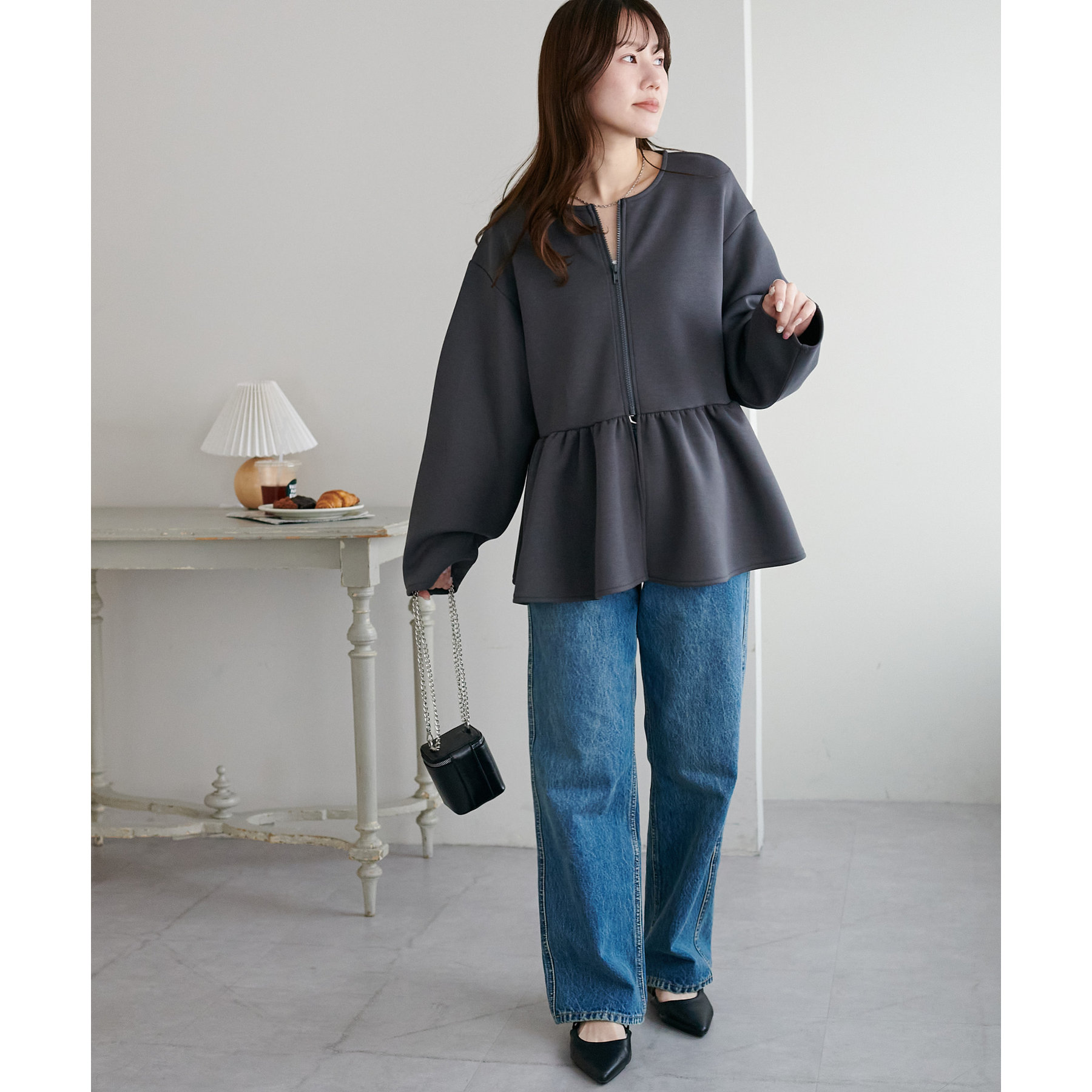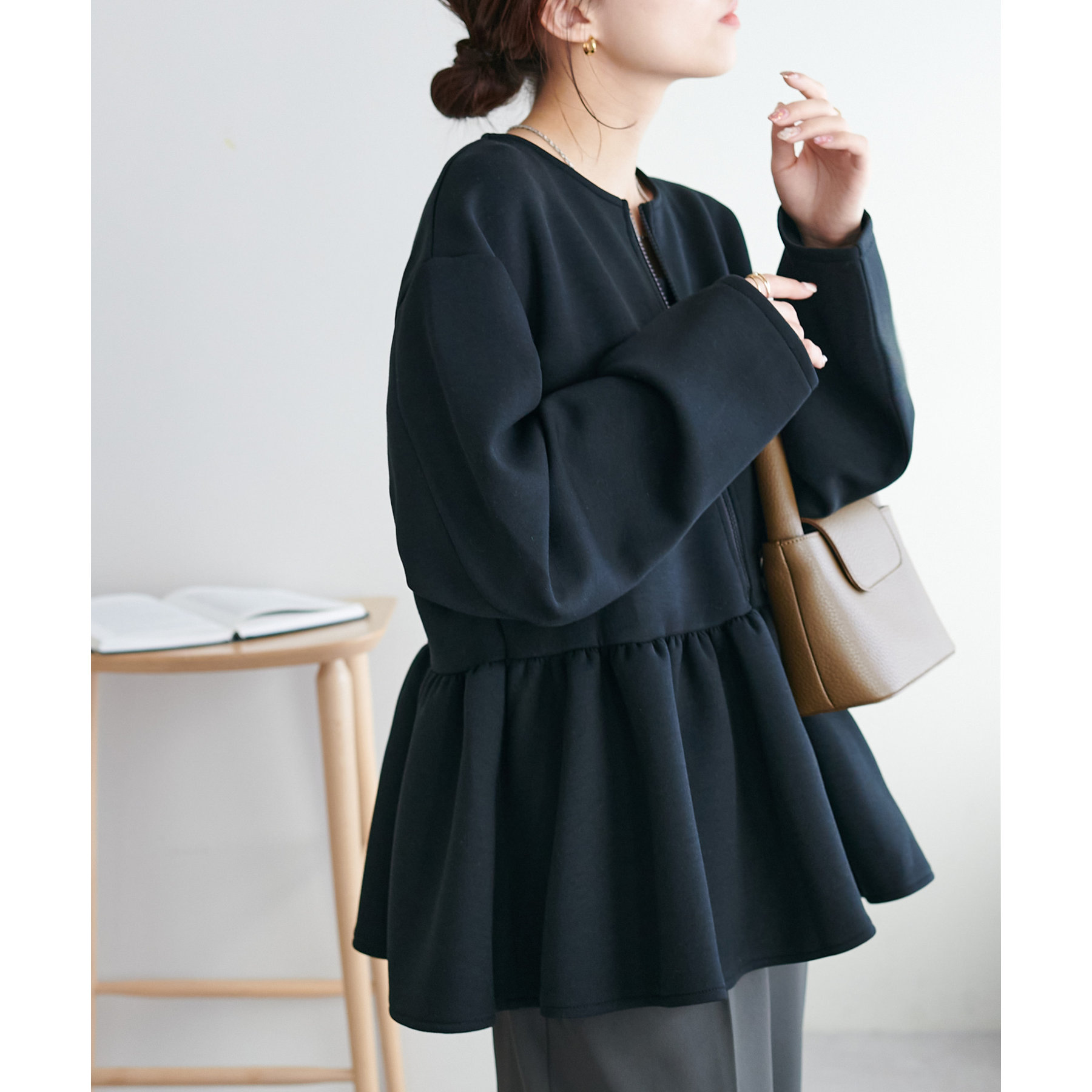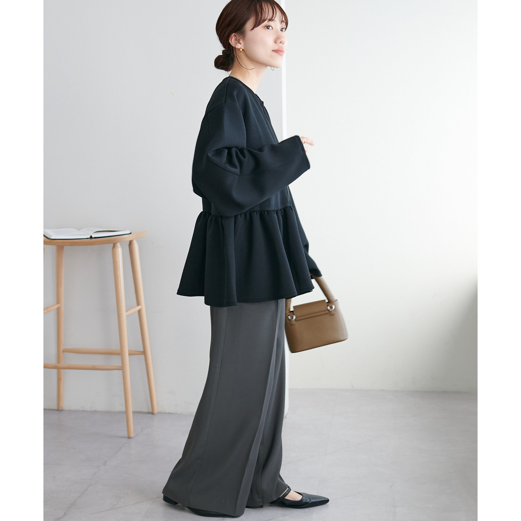 ペプラムの切替えがウエストより上にあることで脚長効果も◎