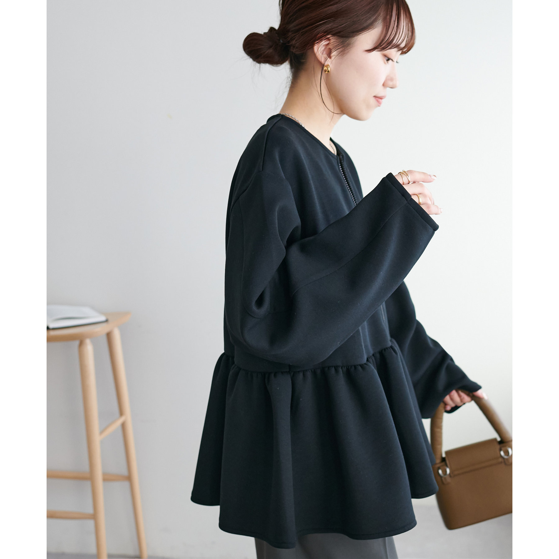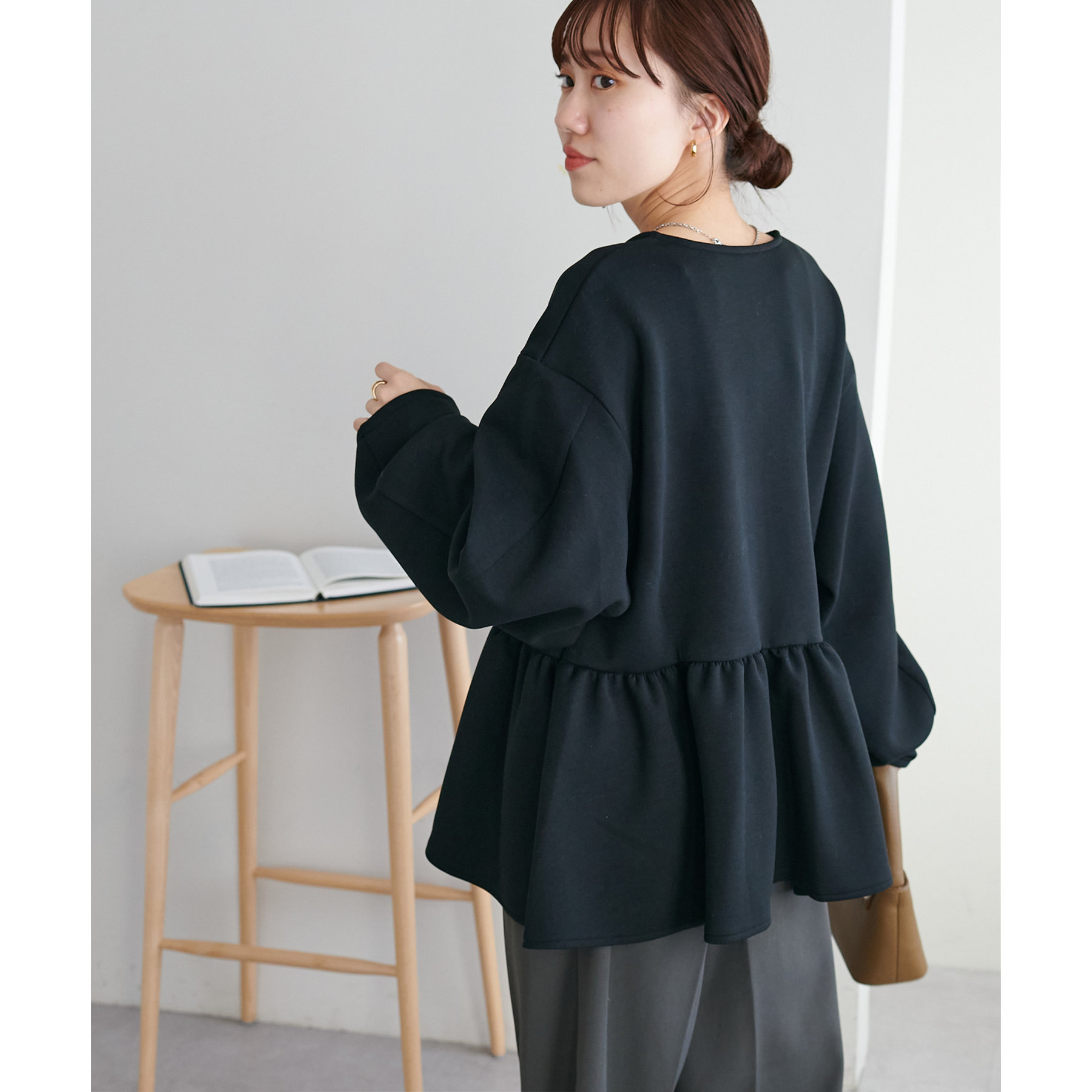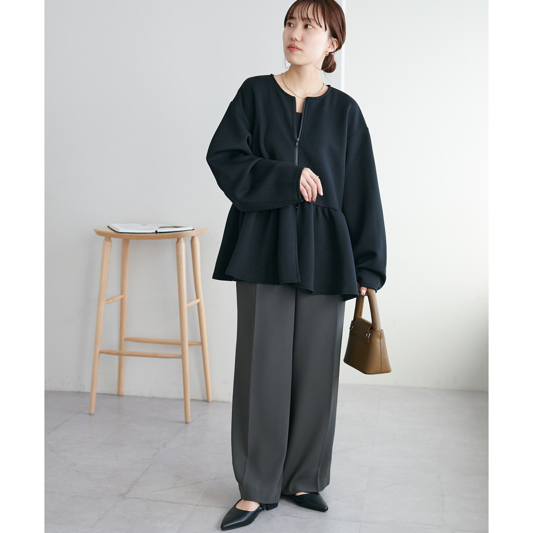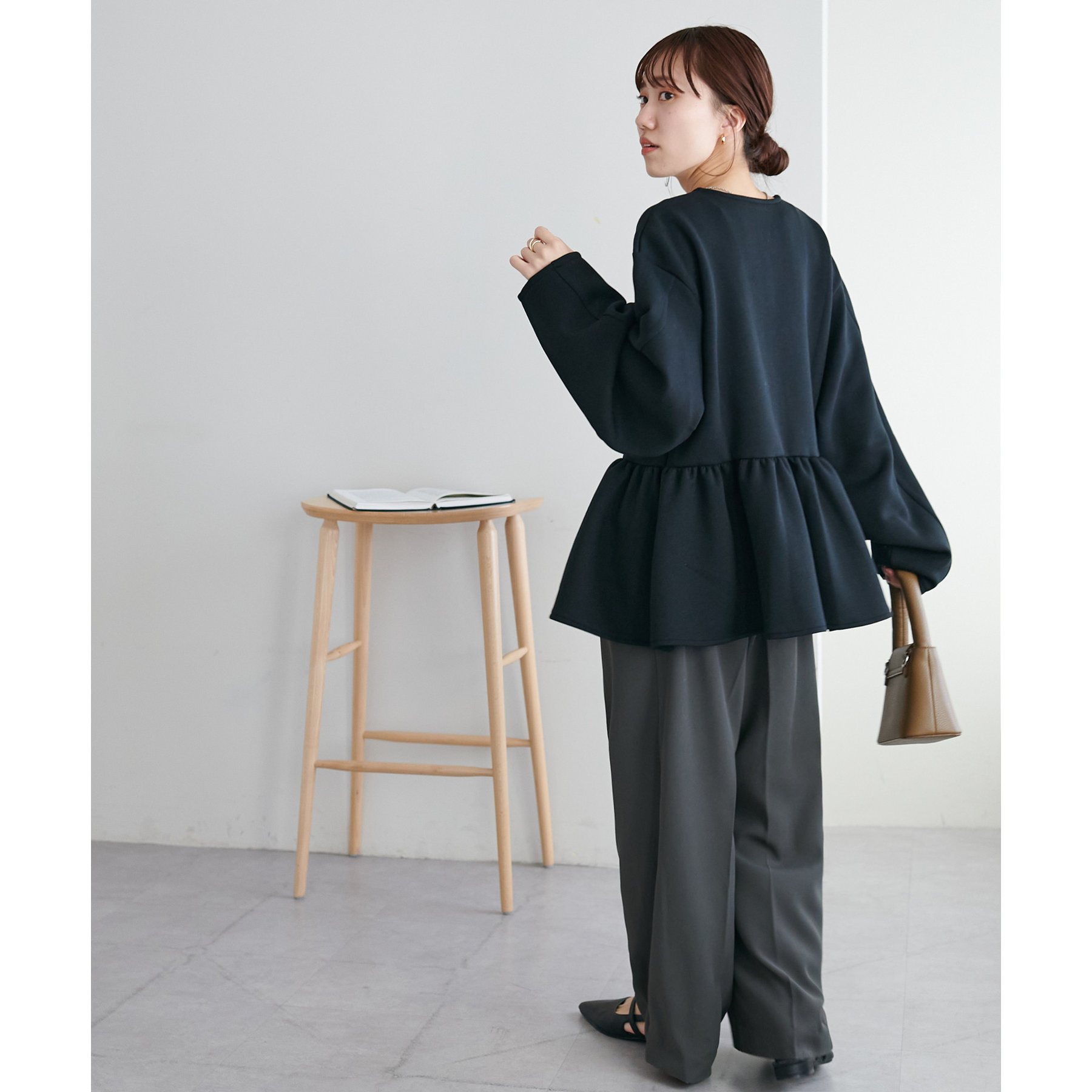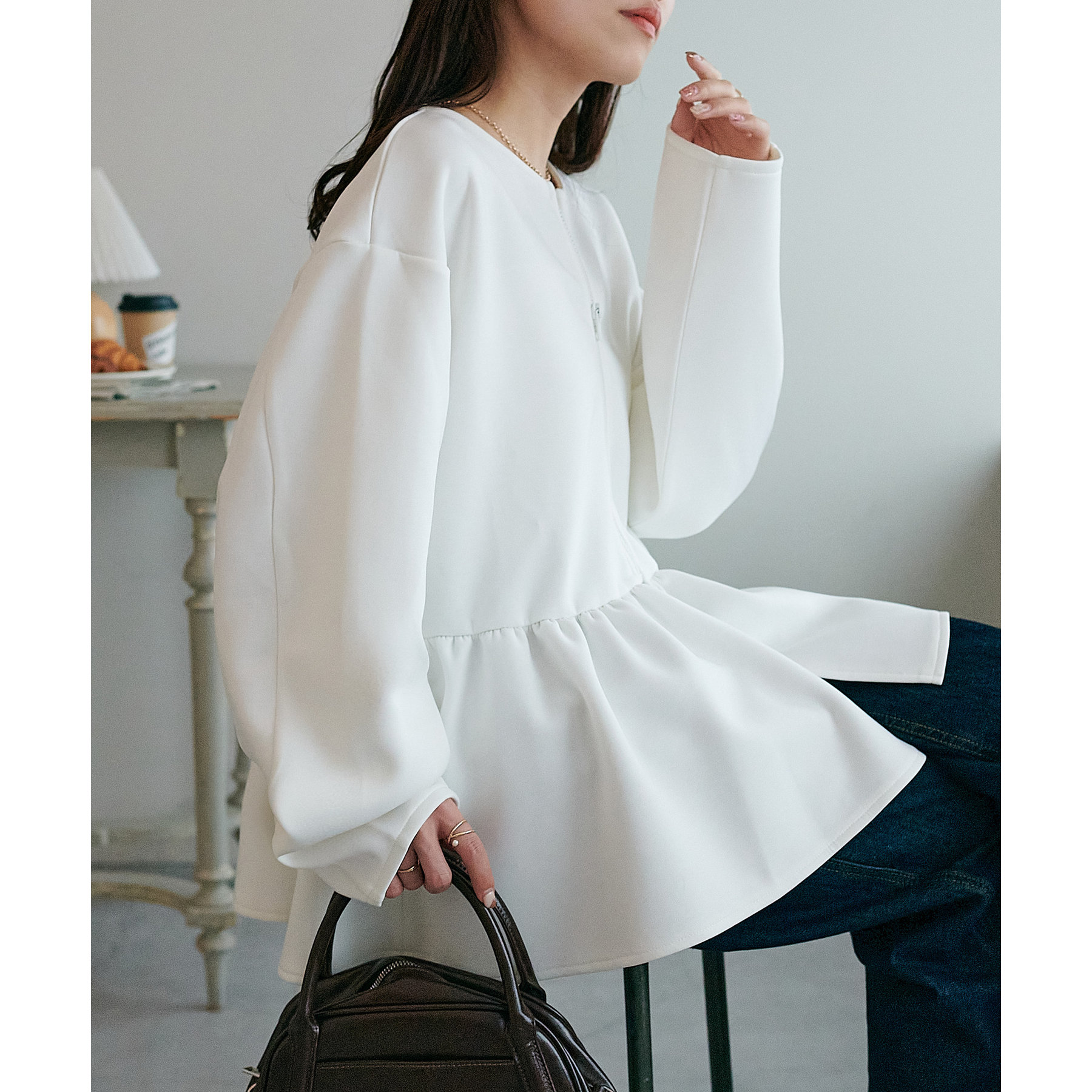 ペプラムの切替えがウエストより上にあることで脚長効果も◎