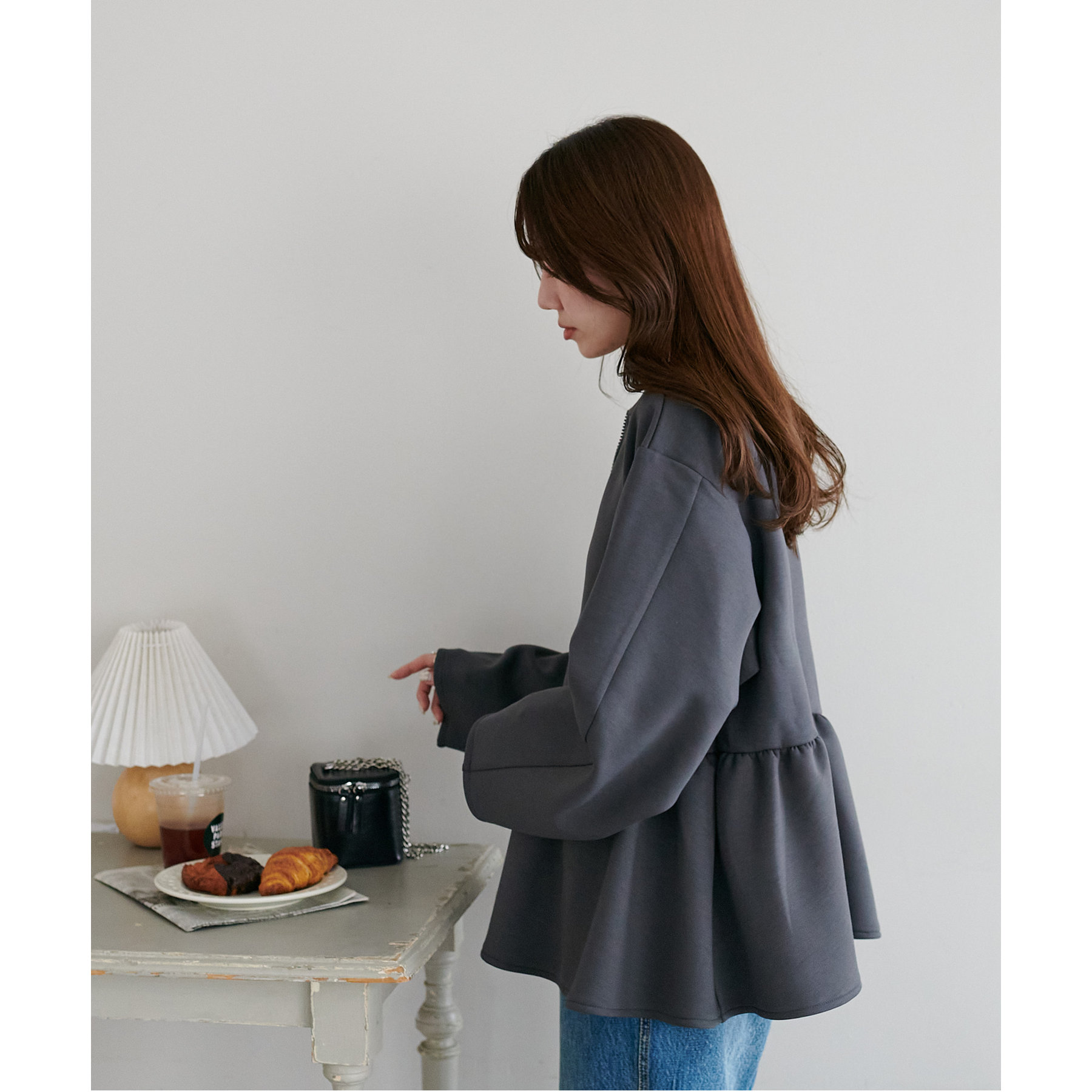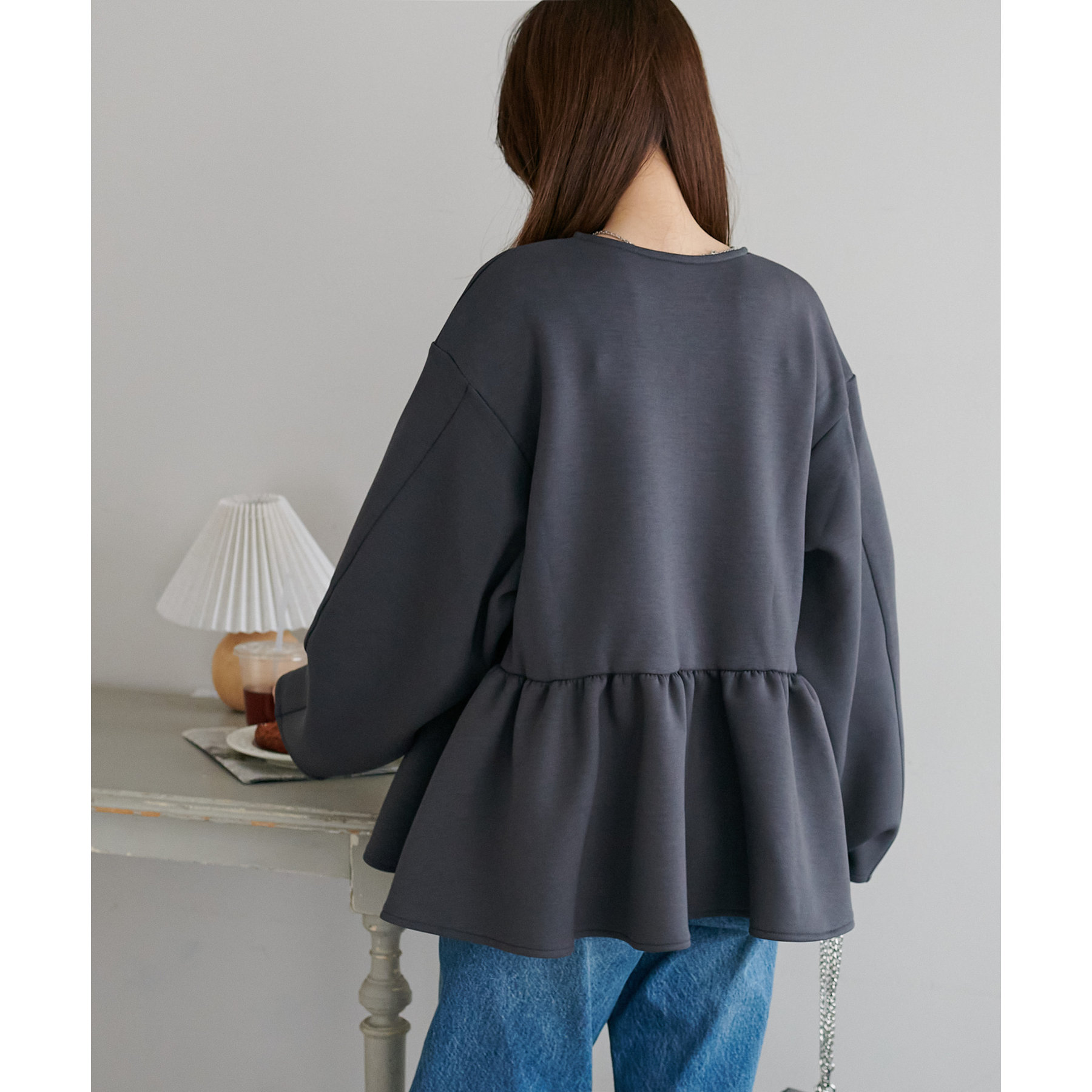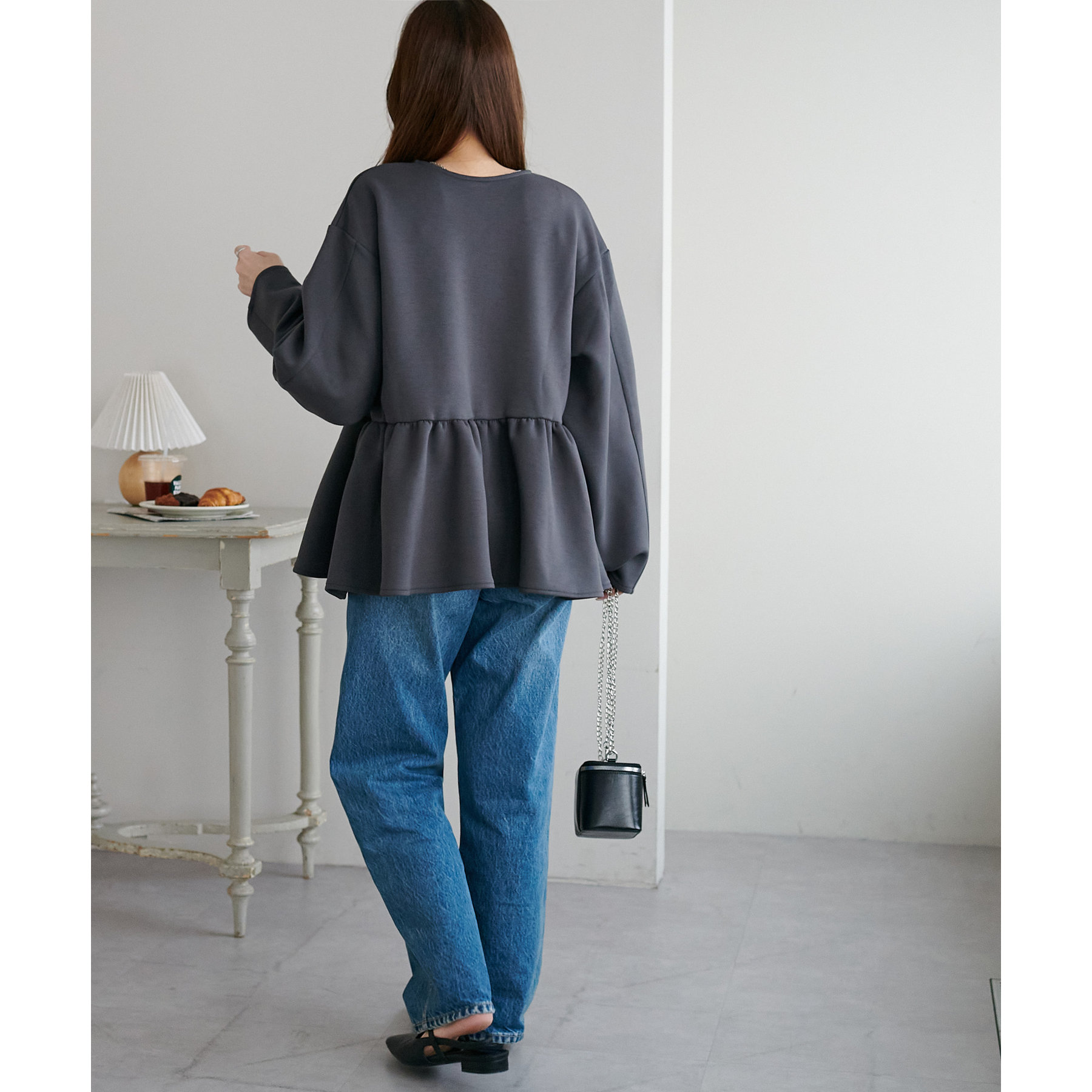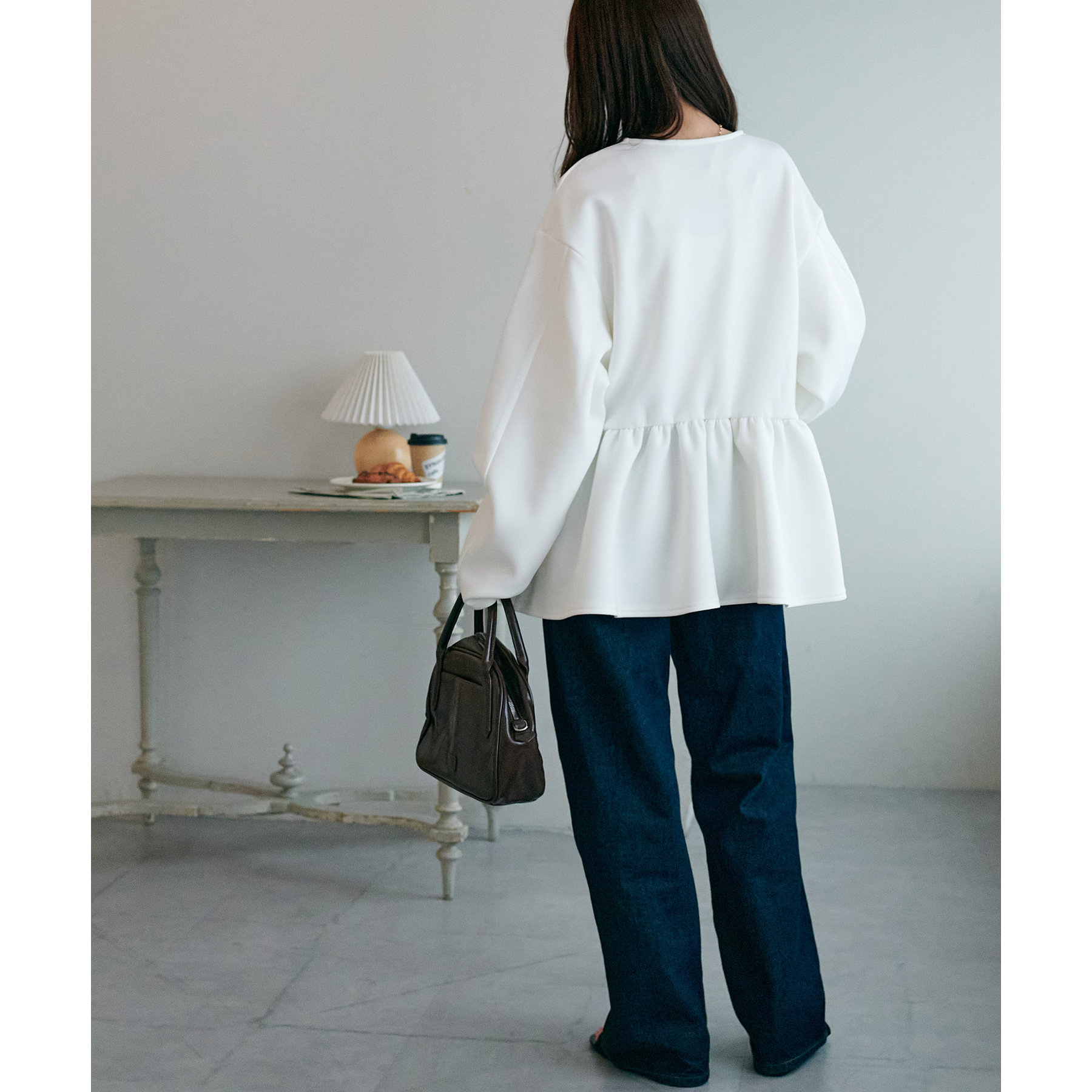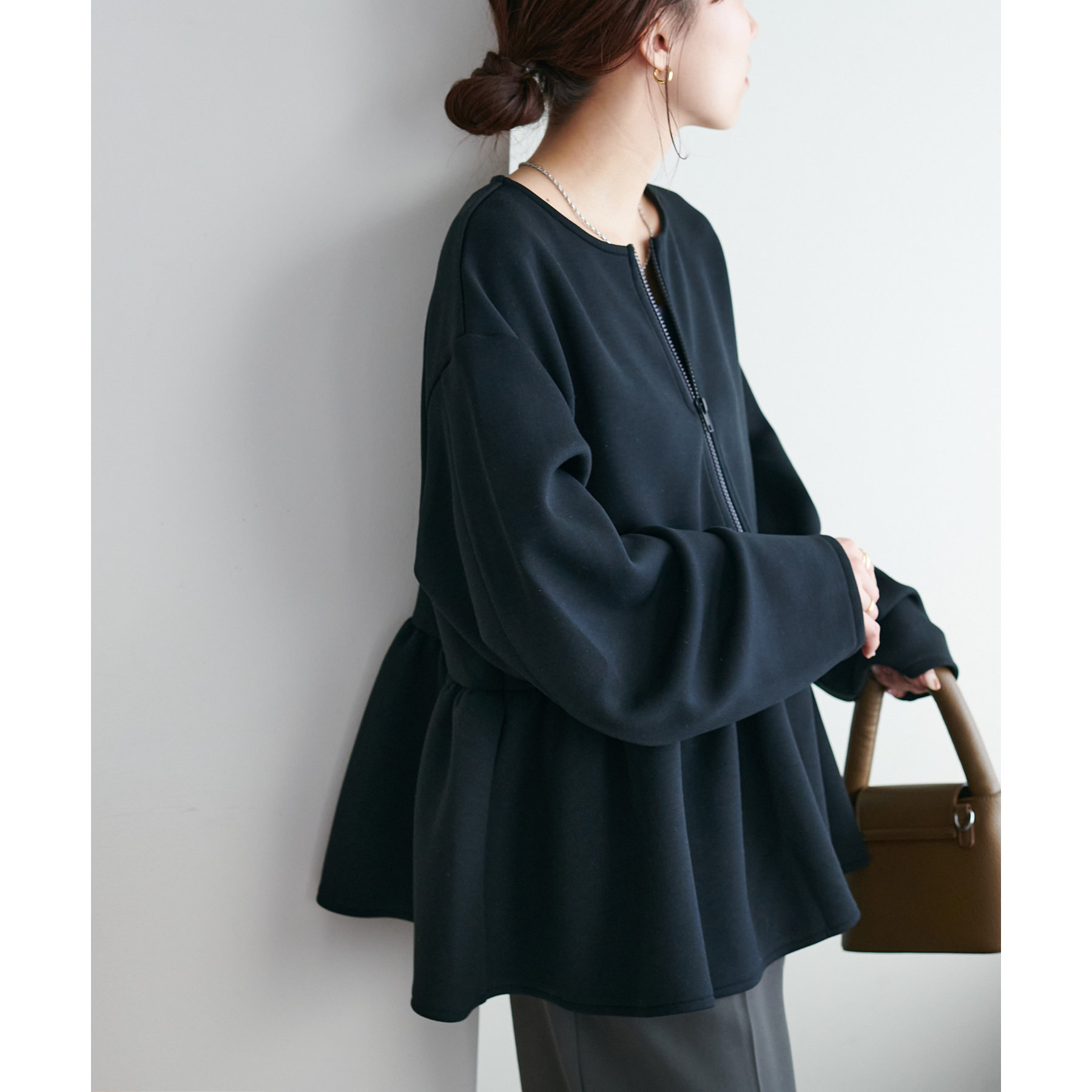 ペプラムの切替えがウエストより上にあることで脚長効果も◎