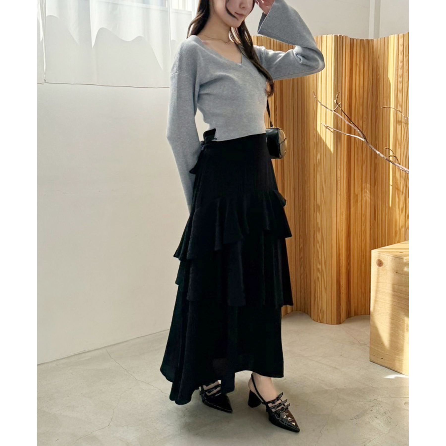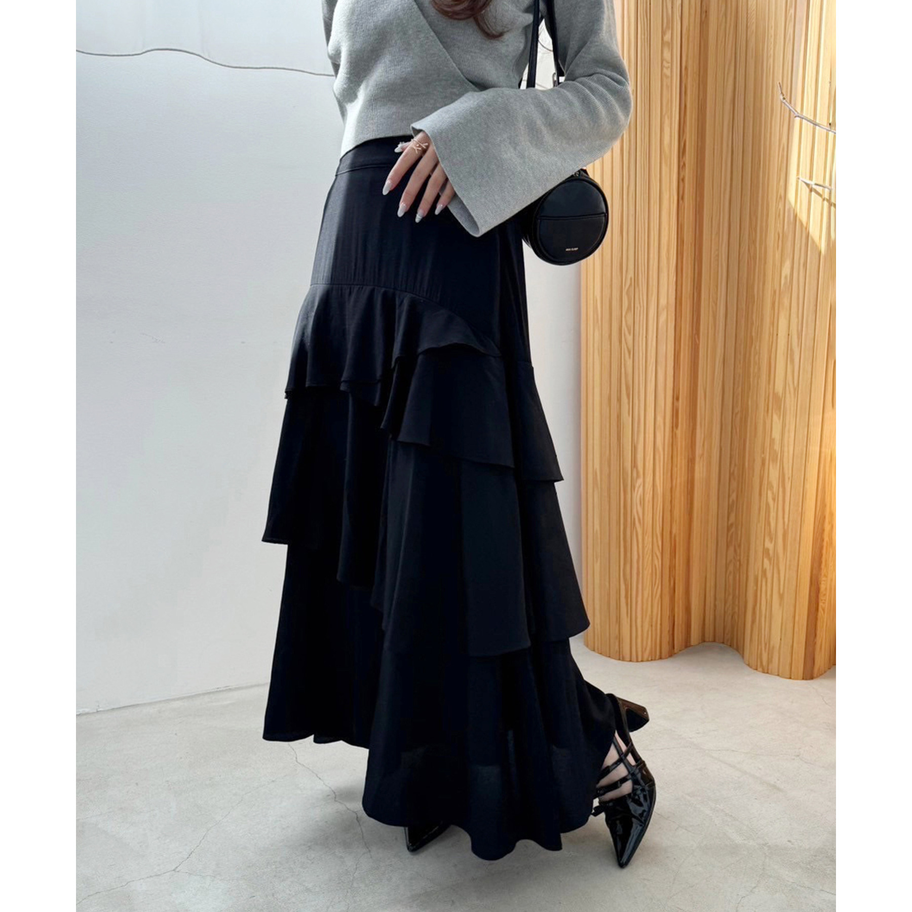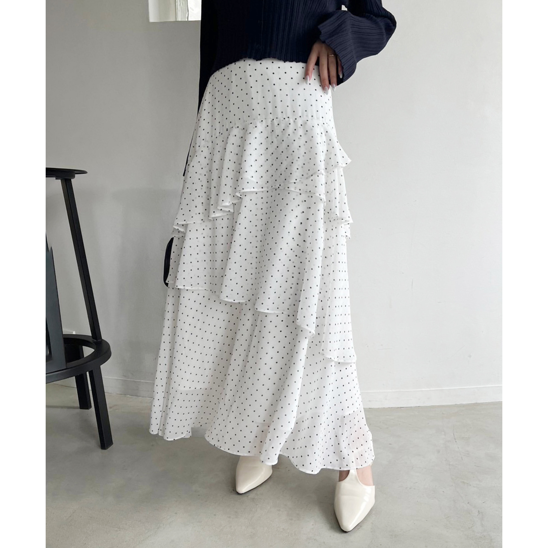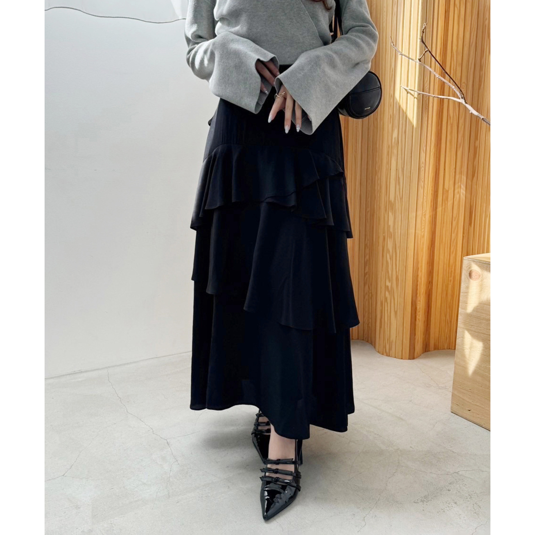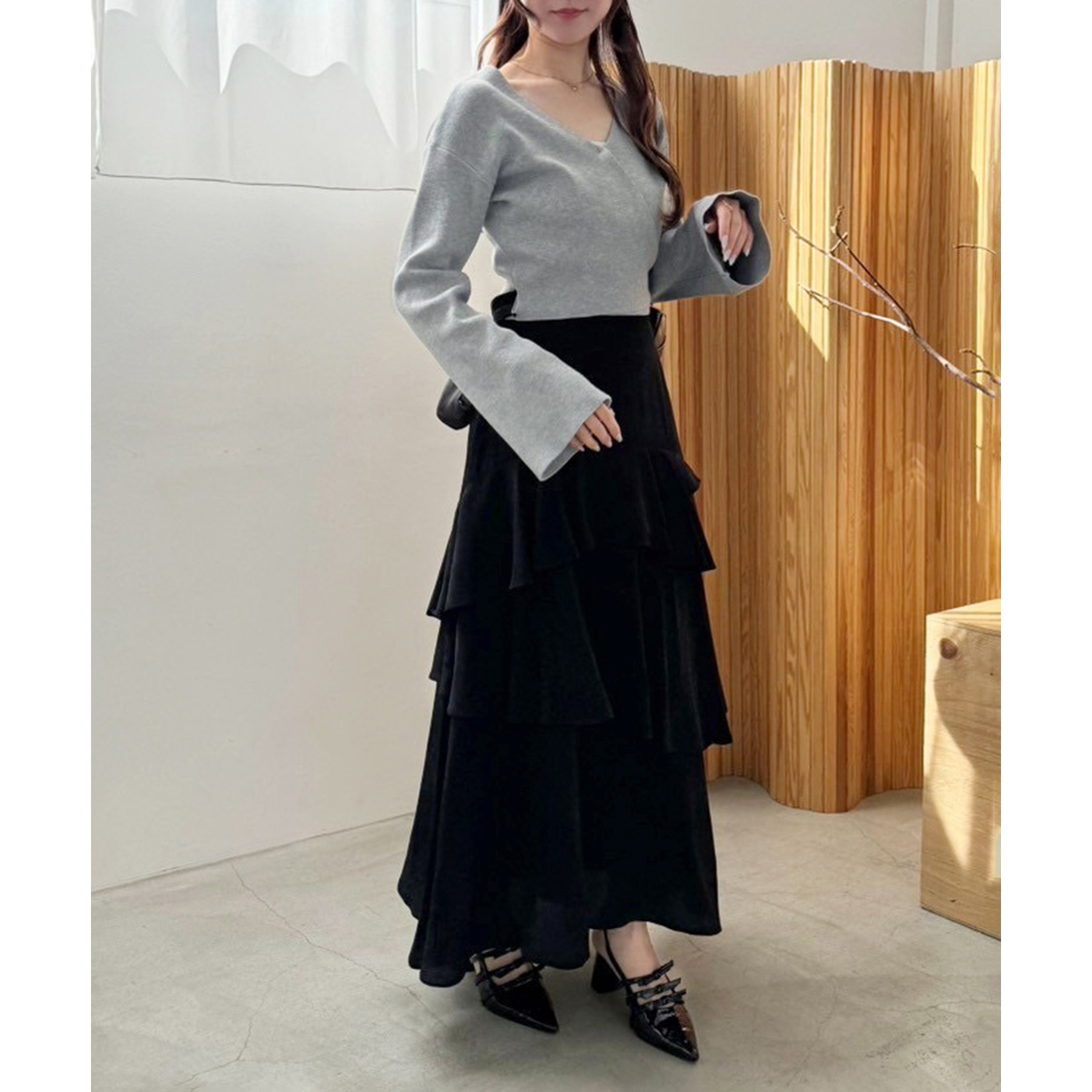 ティアードが目を惹くデザインなので、シンプルめのトップスでも