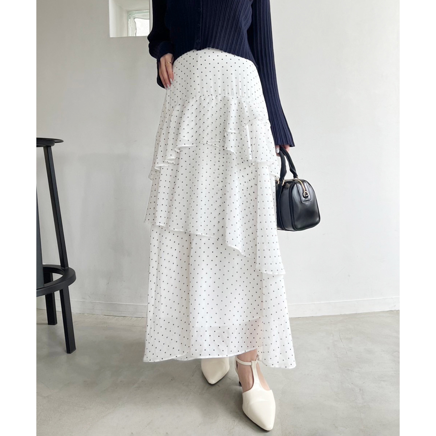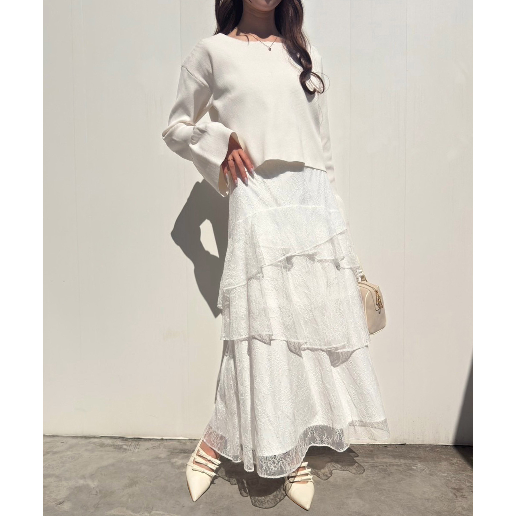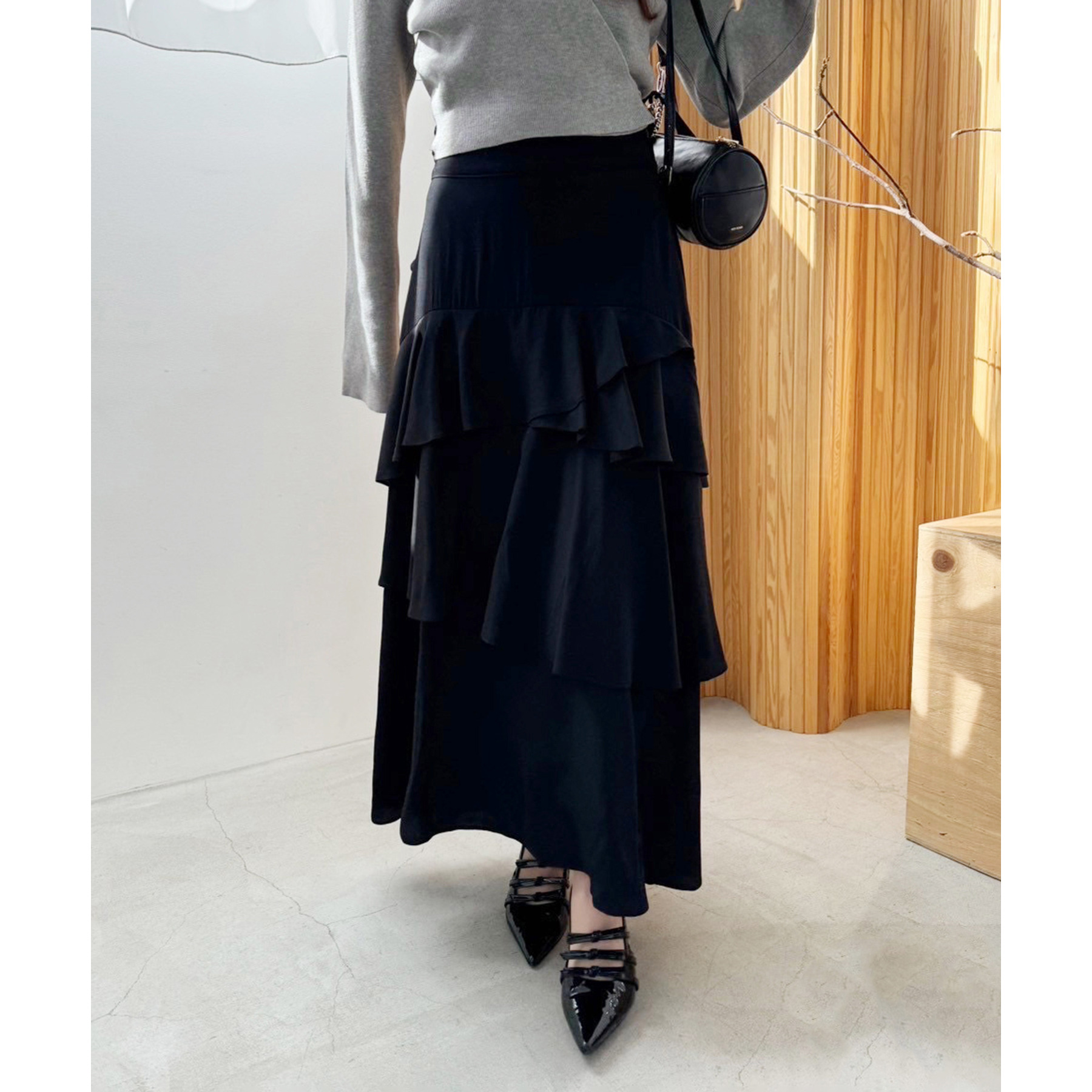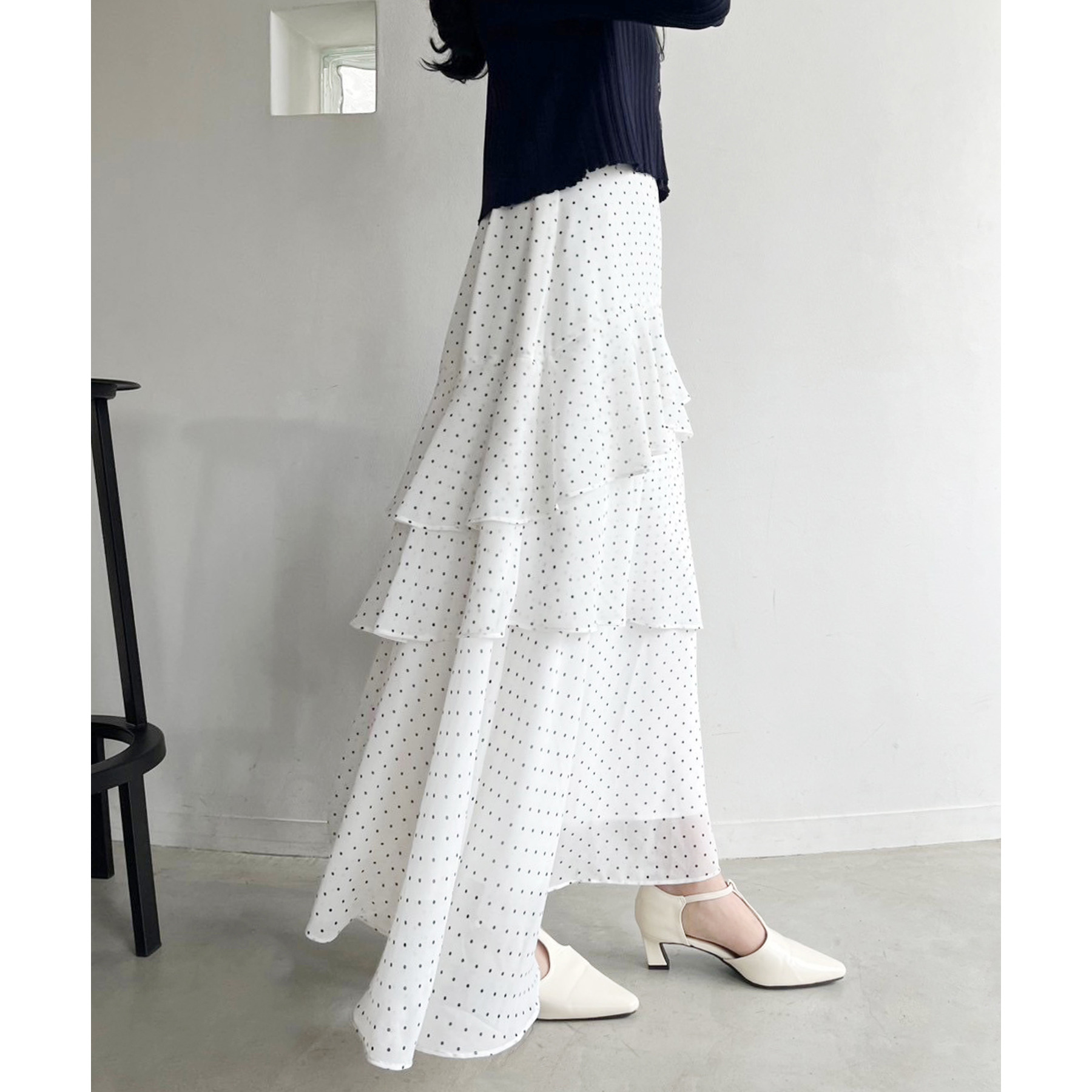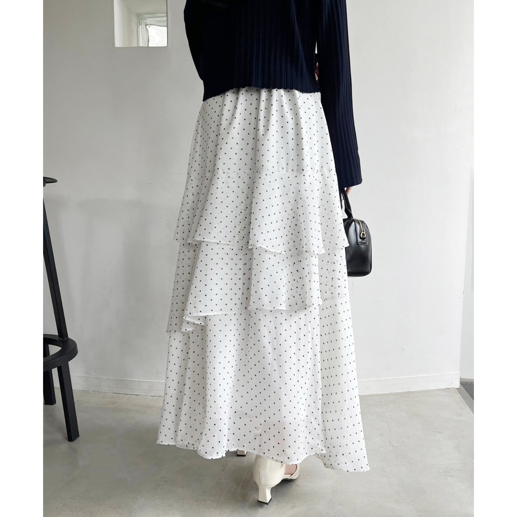 ティアードが目を惹くデザインなので、シンプルめのトップスでも