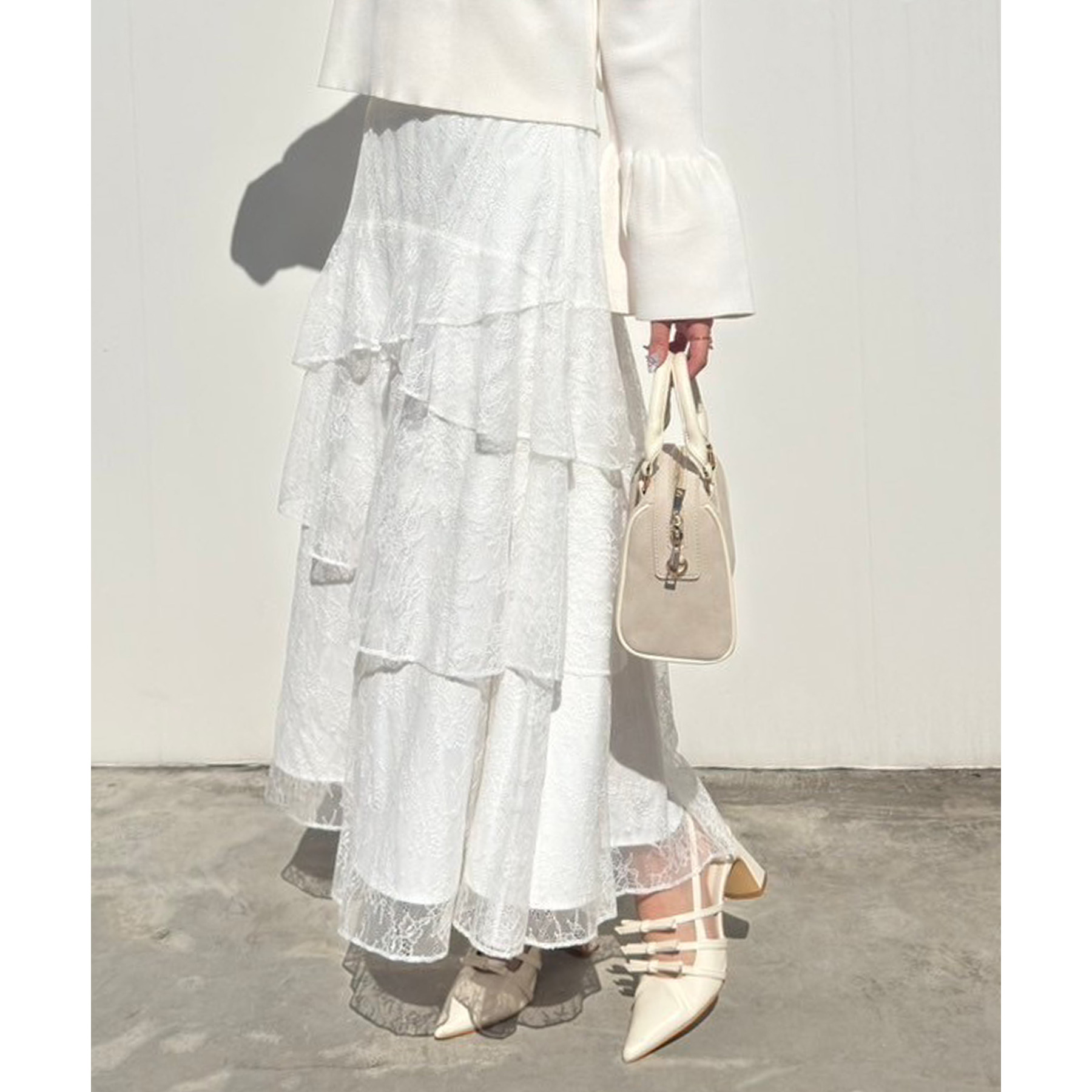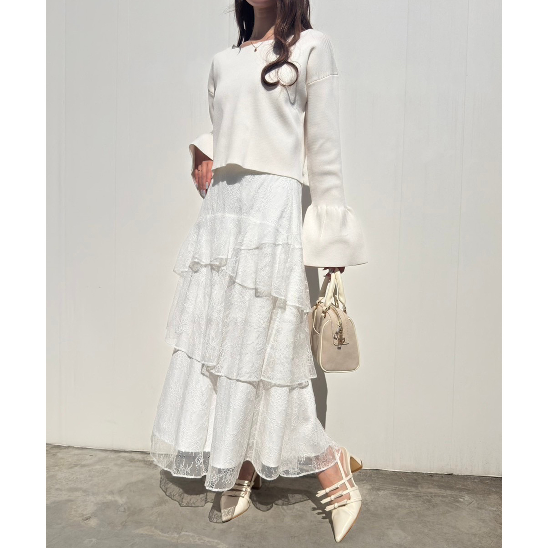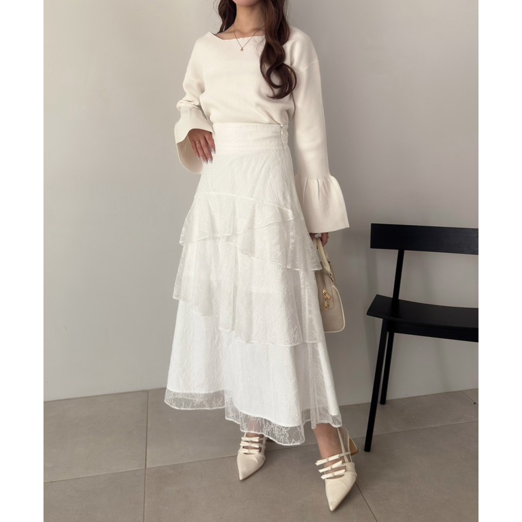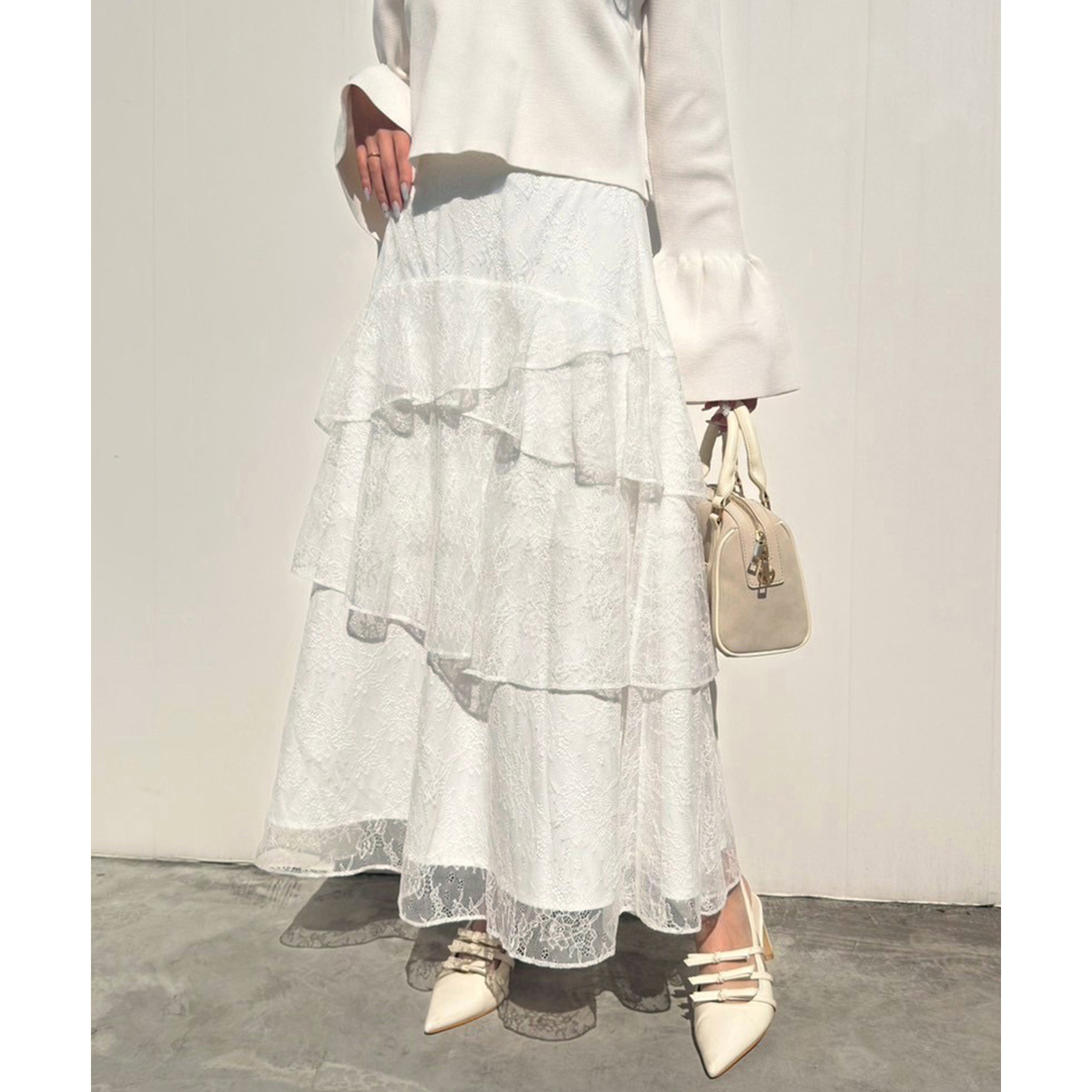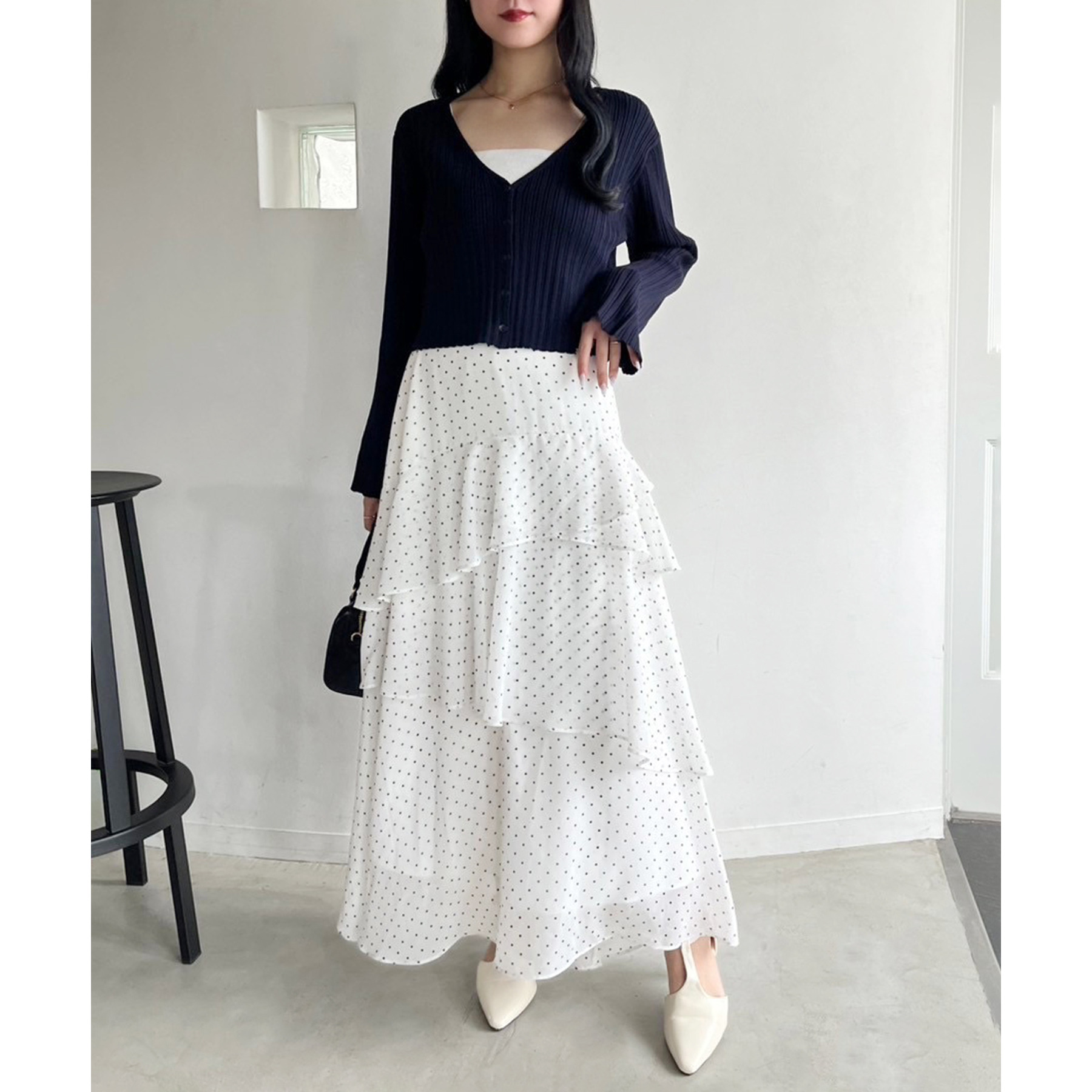 ティアードが目を惹くデザインなので、シンプルめのトップスでも