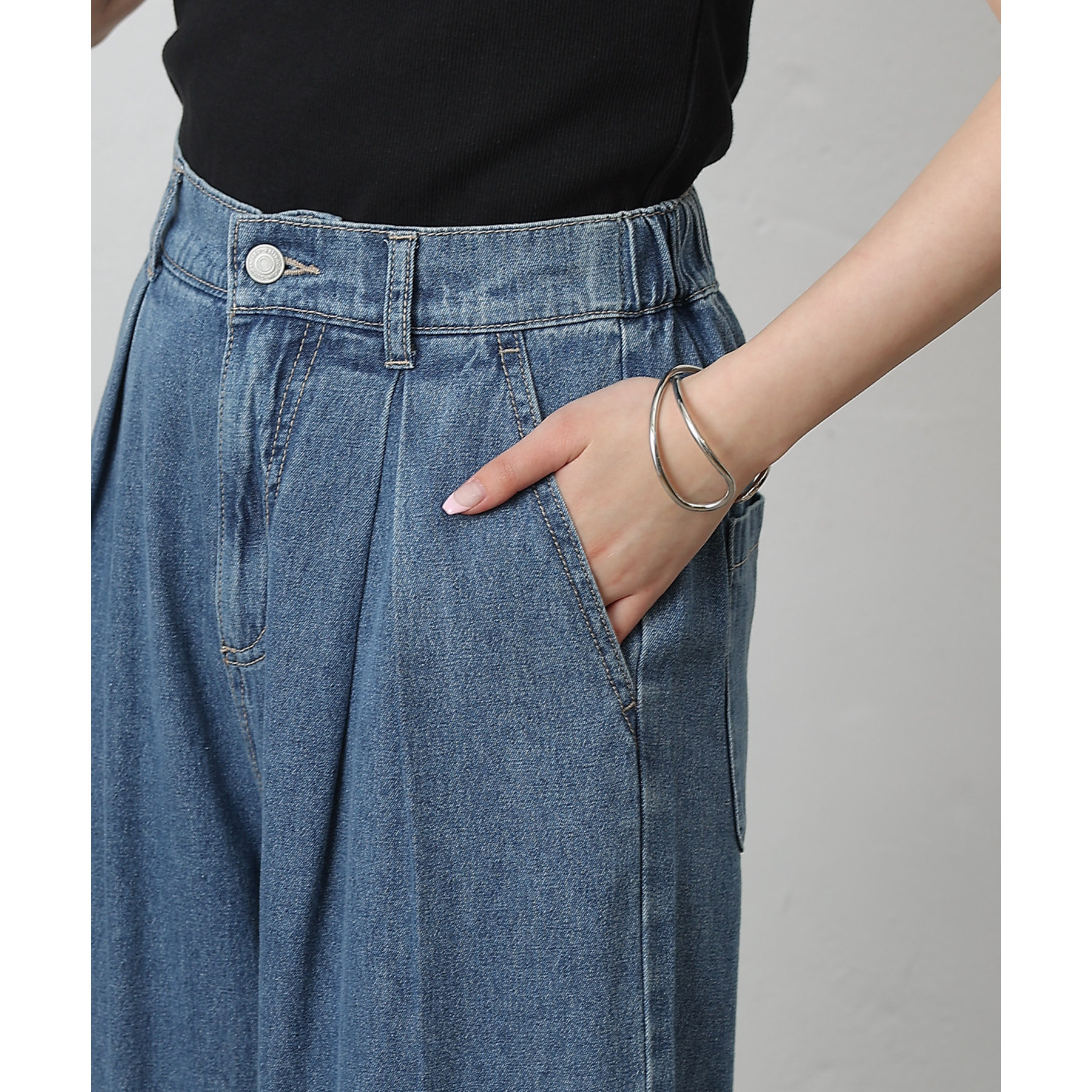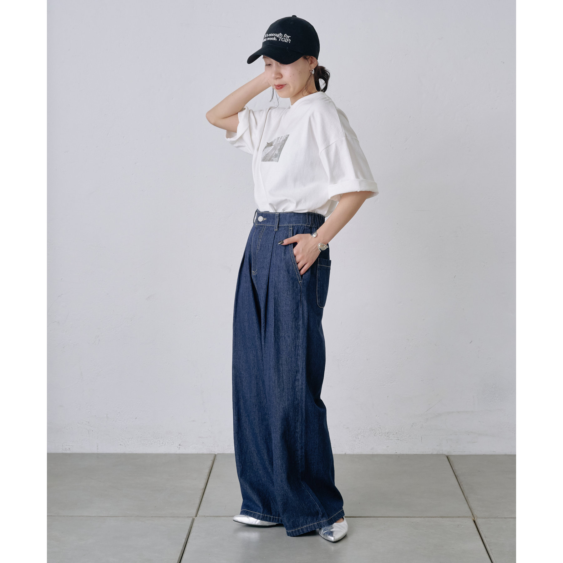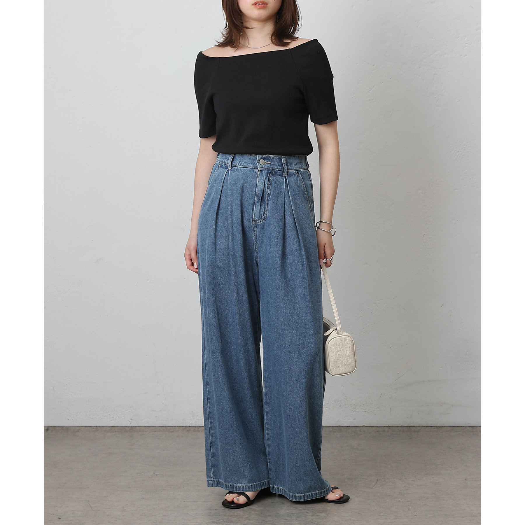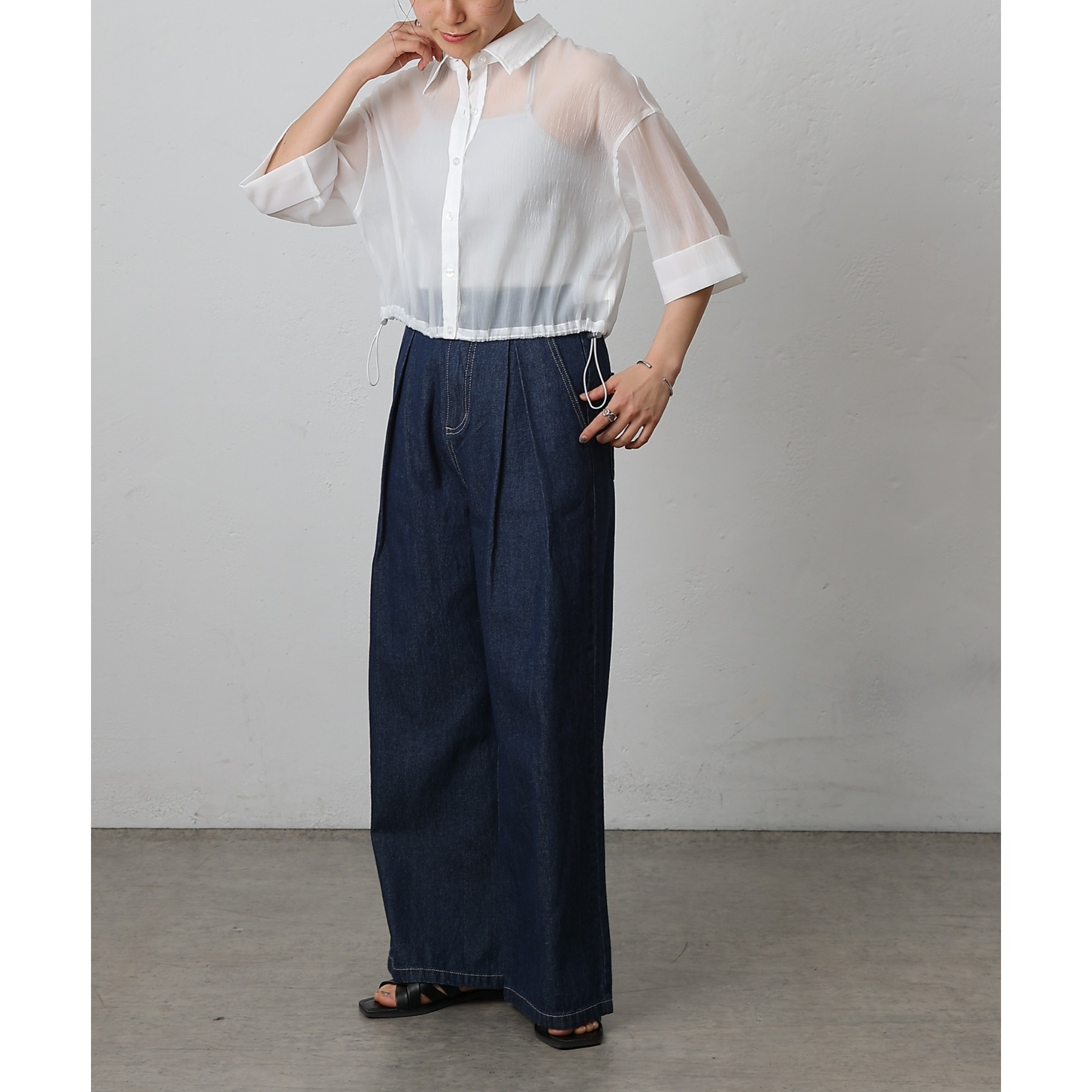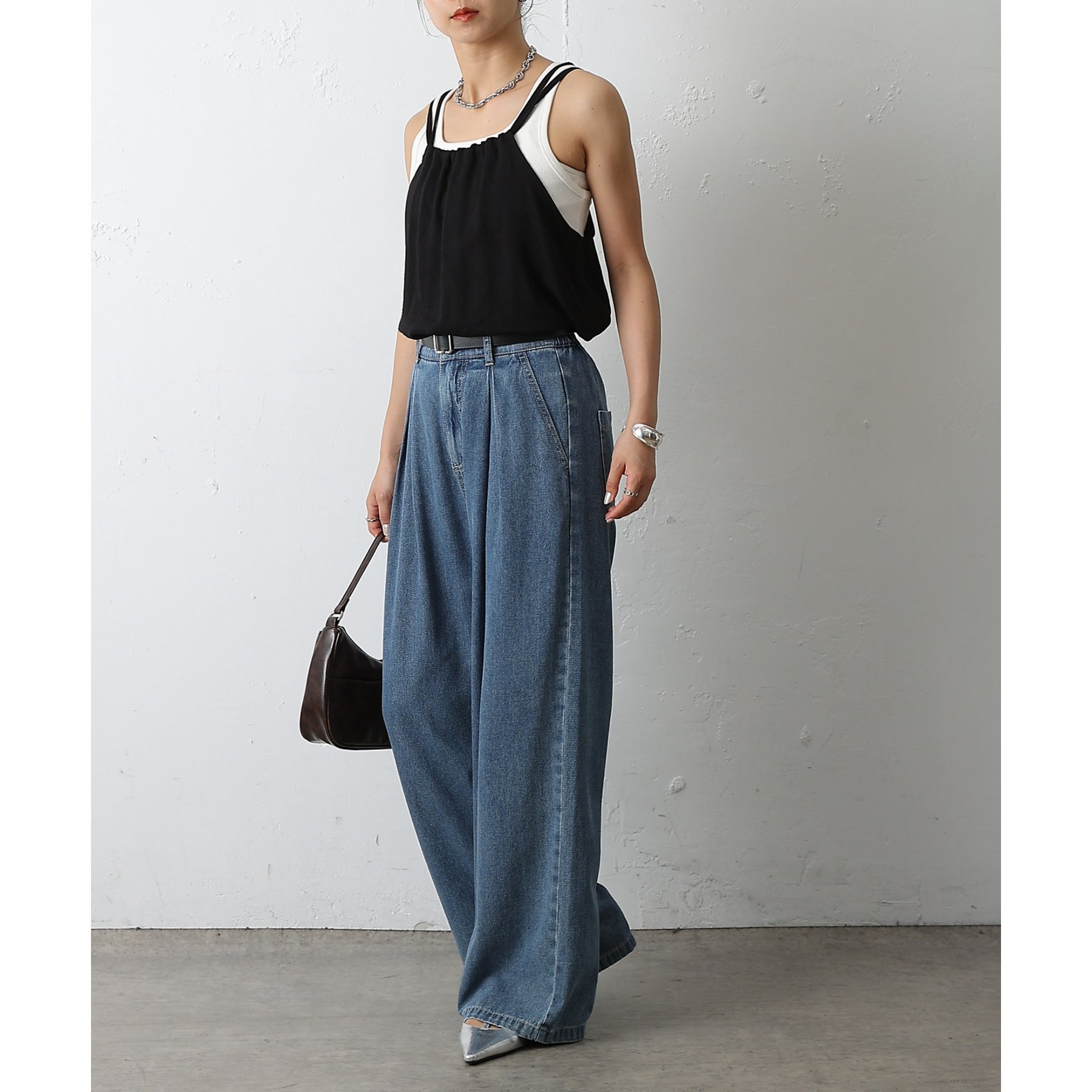 ウエスト周りはすっきりとさせつつも、フロントにボックスタックを施すことで程よいワイド感とスタイルアップを叶えます。