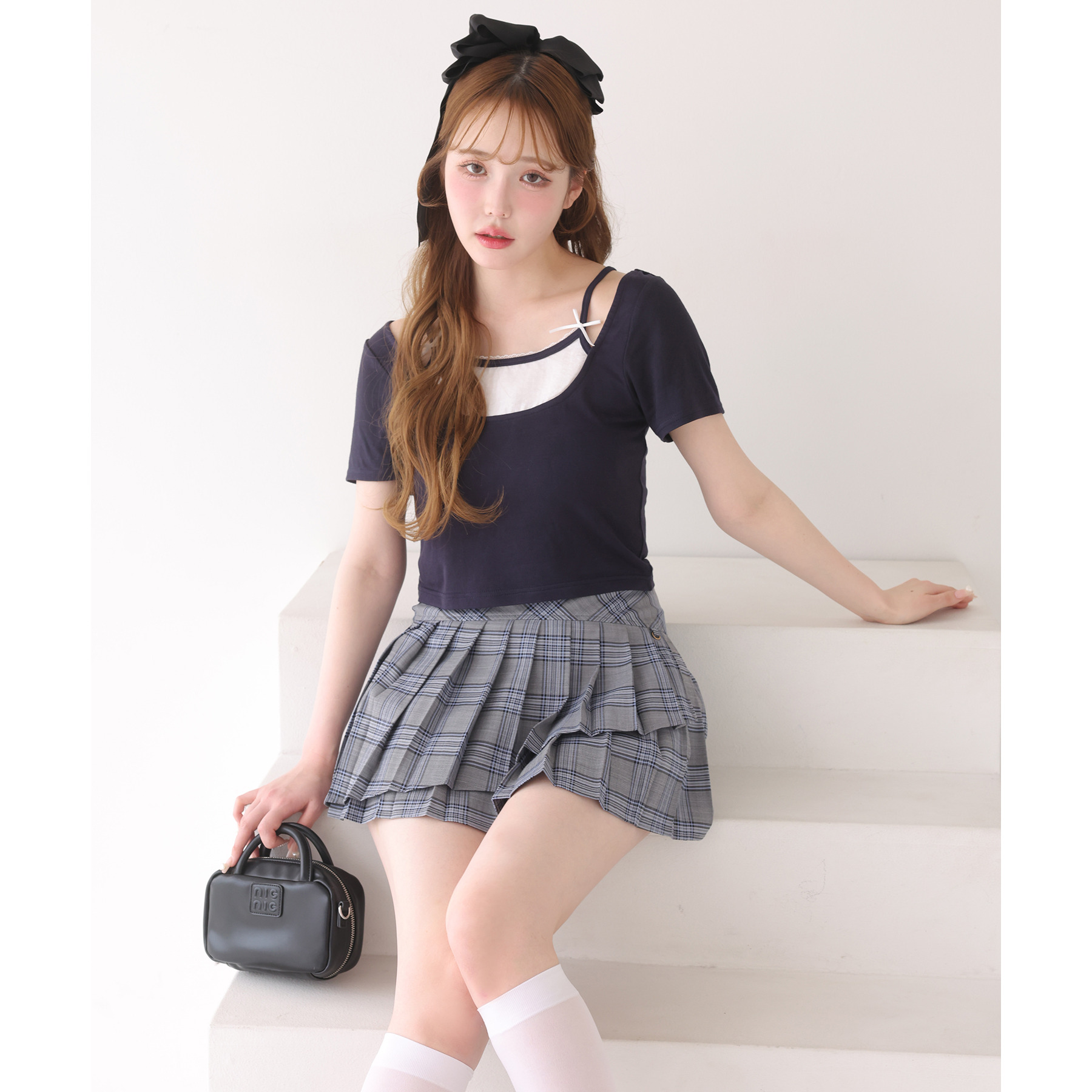 チェックインナーをレイヤードしているようなデザインが特徴の、ガーリーなニット。