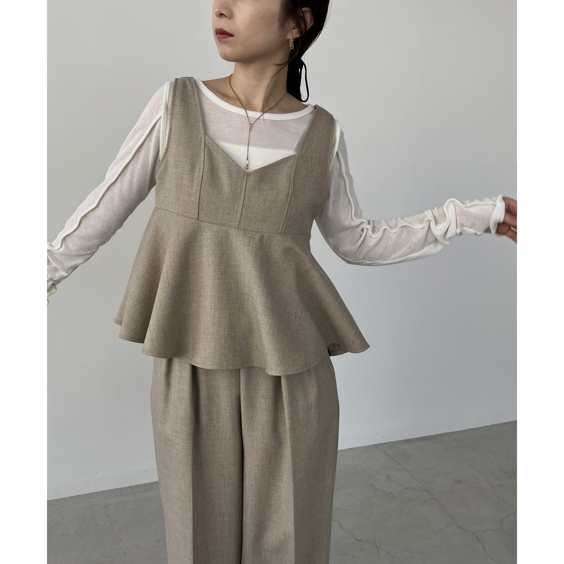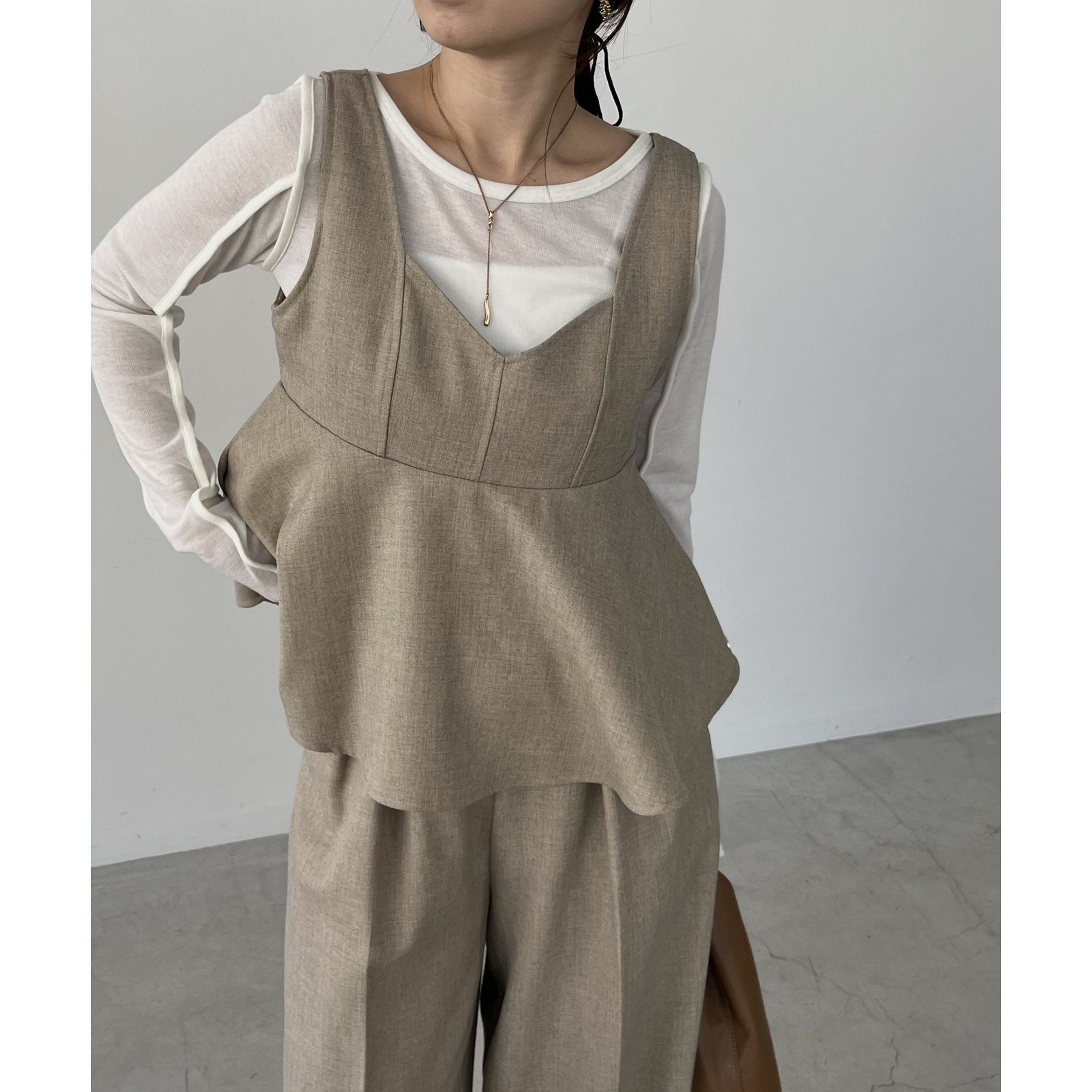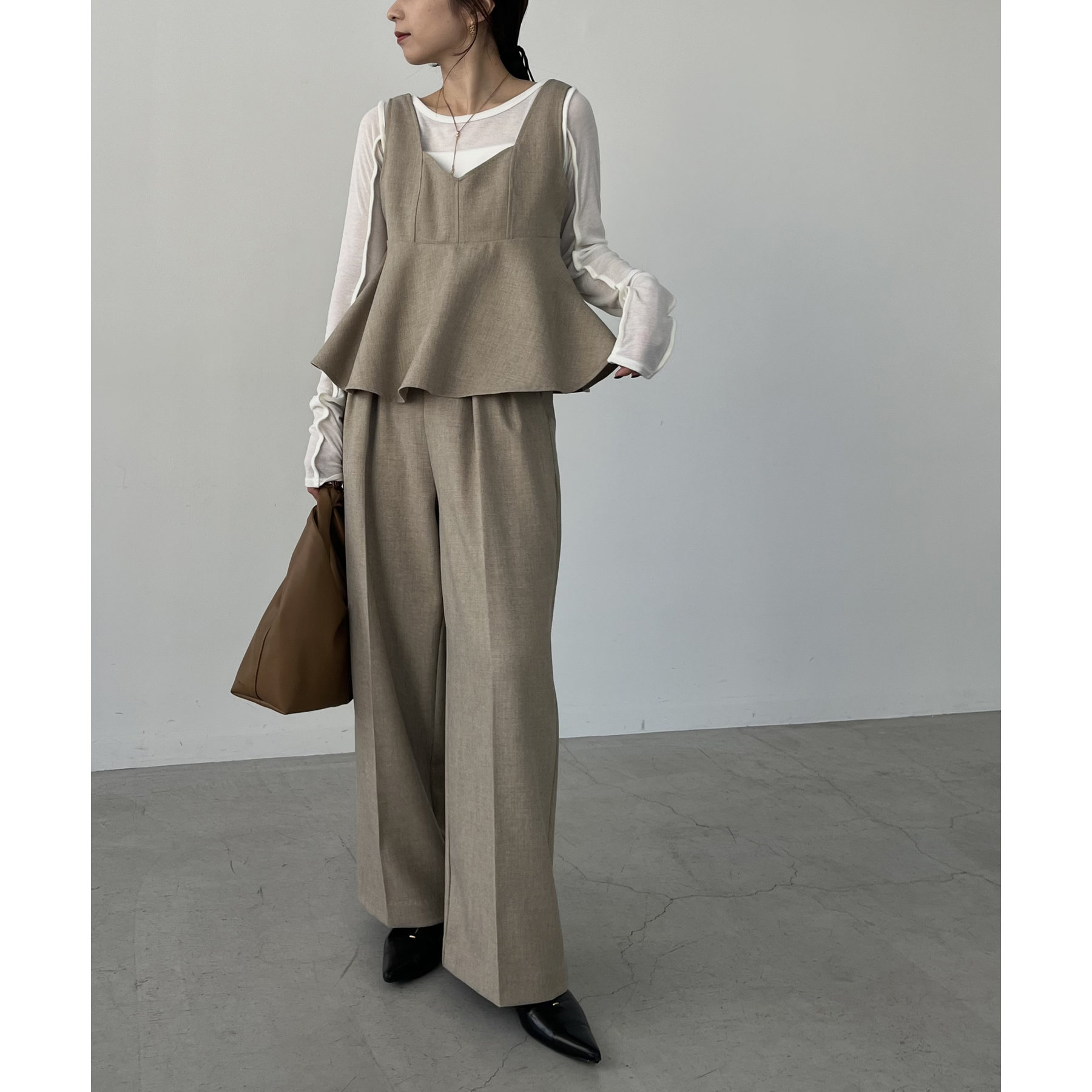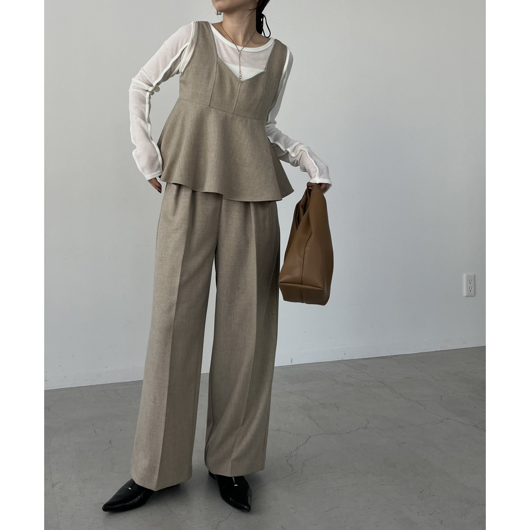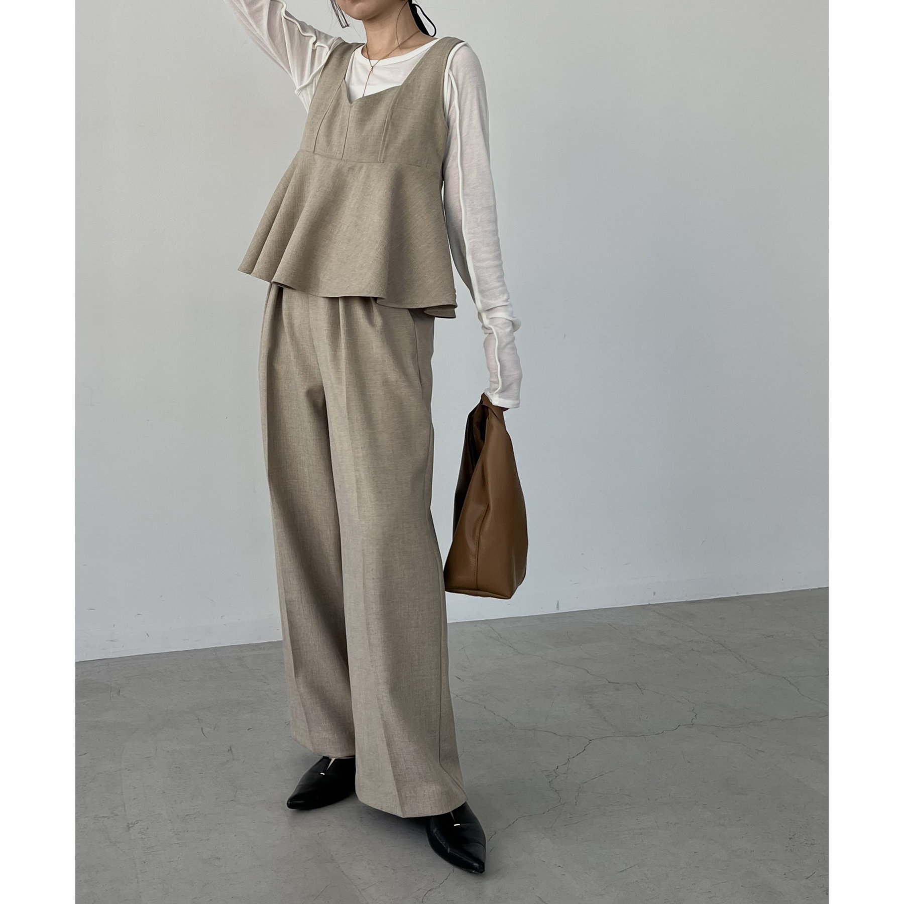 【ベージュ着用アイテム①】トップス:パイピングロンT、ボトムス:マーベルトタックパンツ