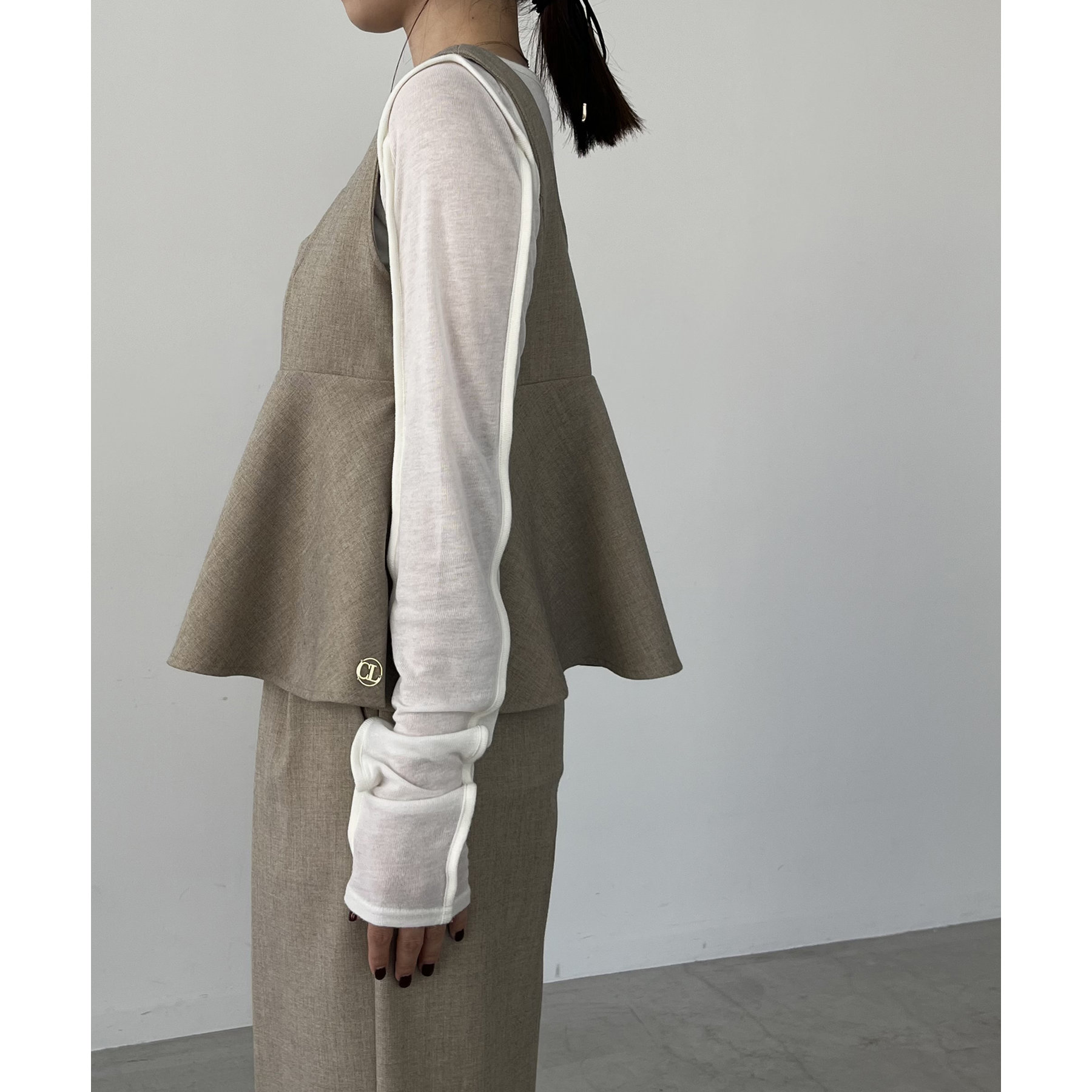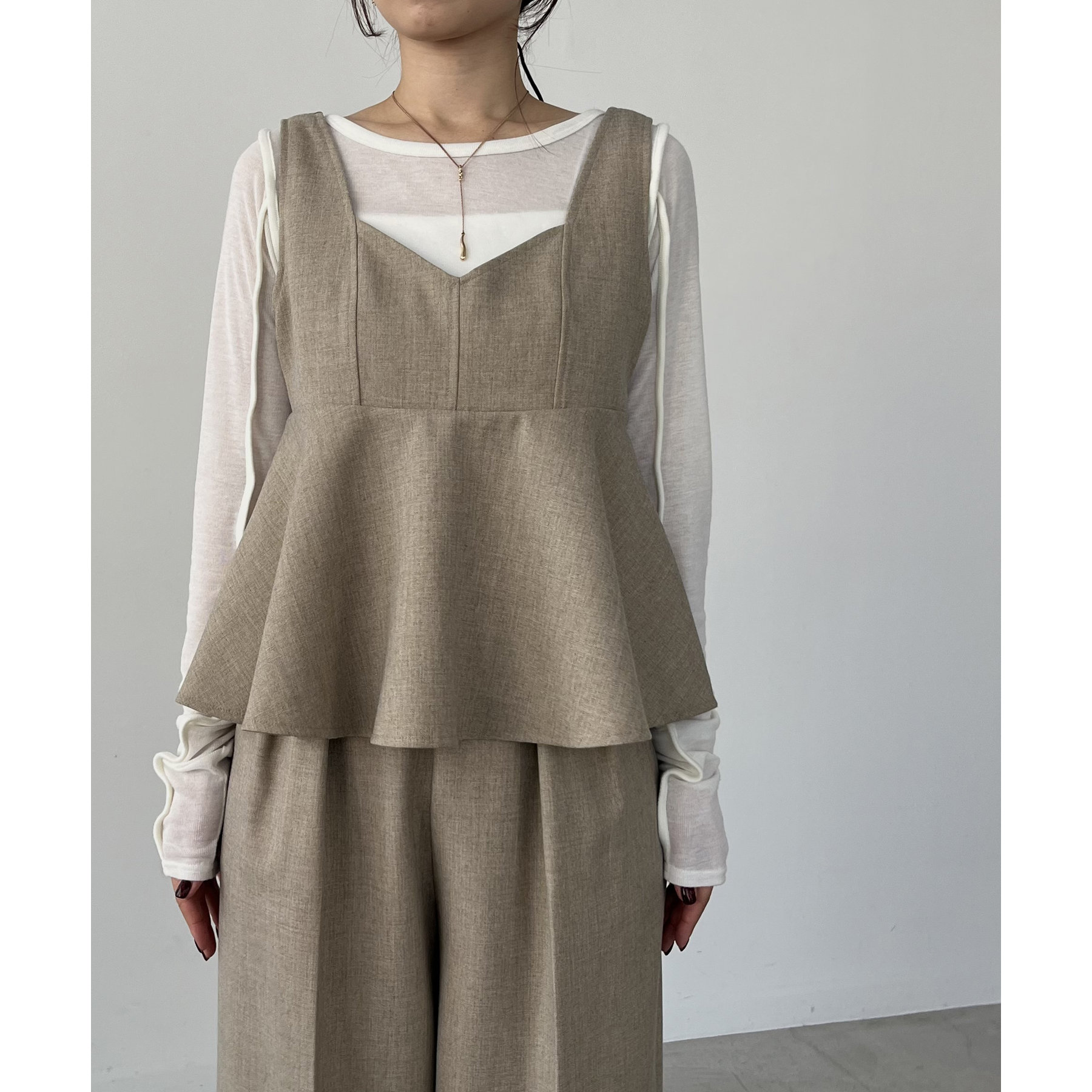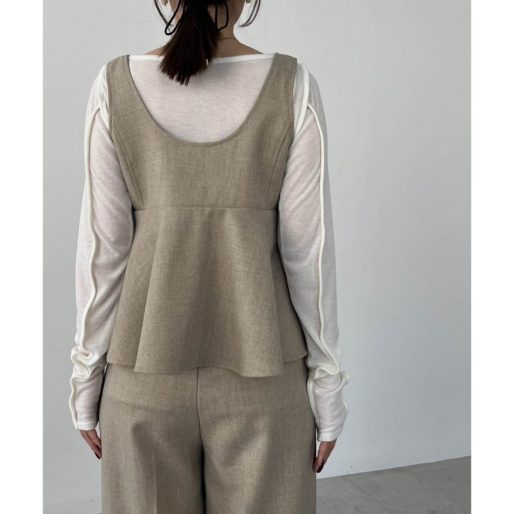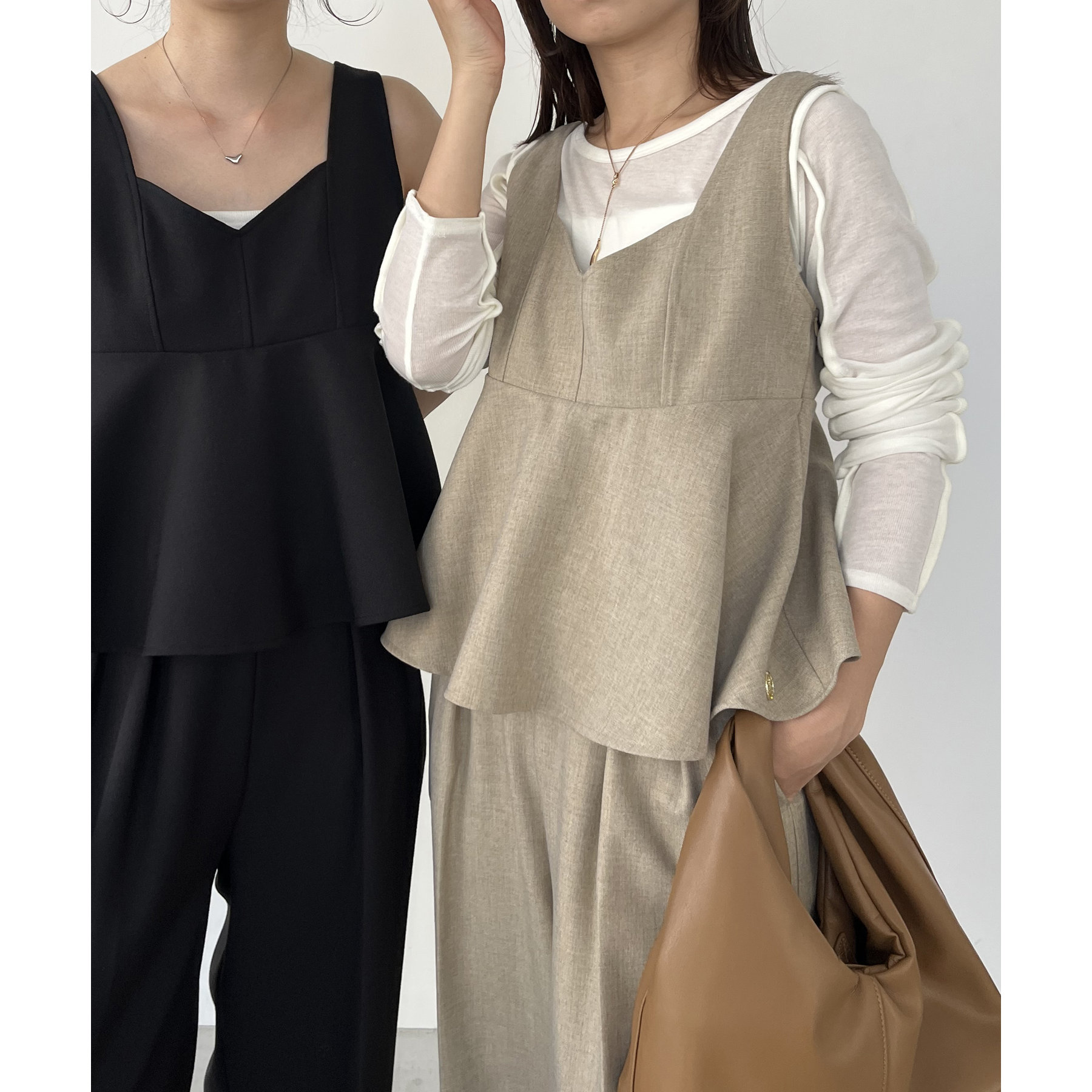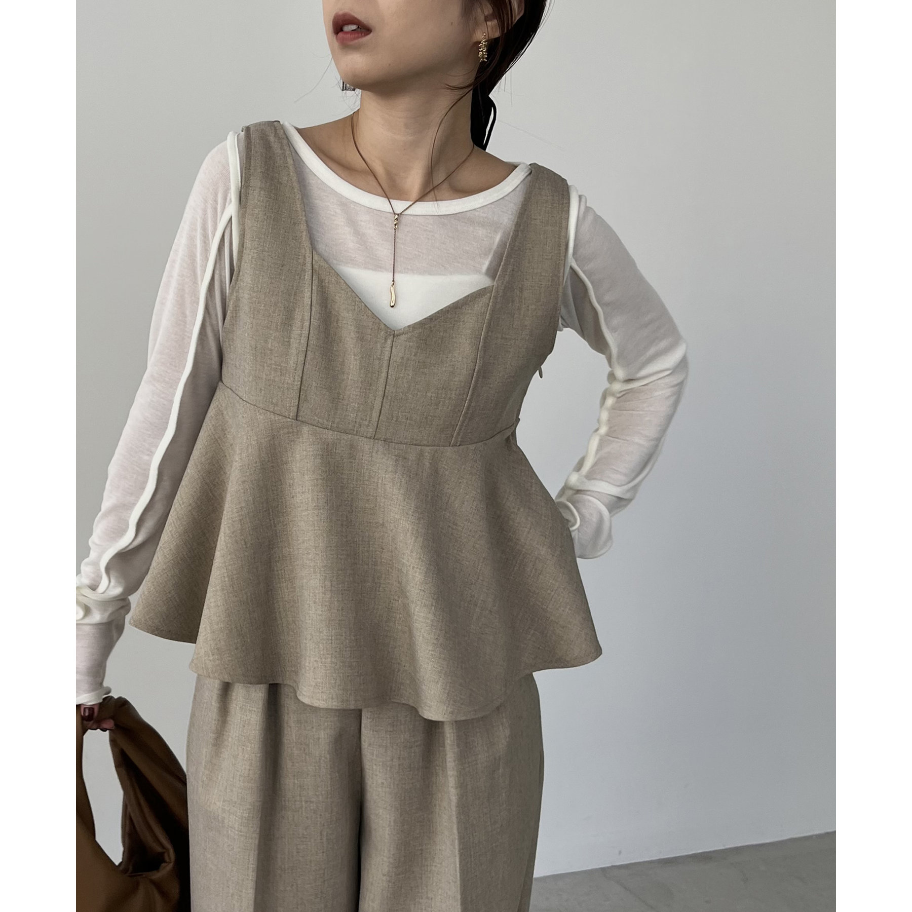 【ベージュ着用アイテム①】トップス:パイピングロンT、ボトムス:マーベルトタックパンツ