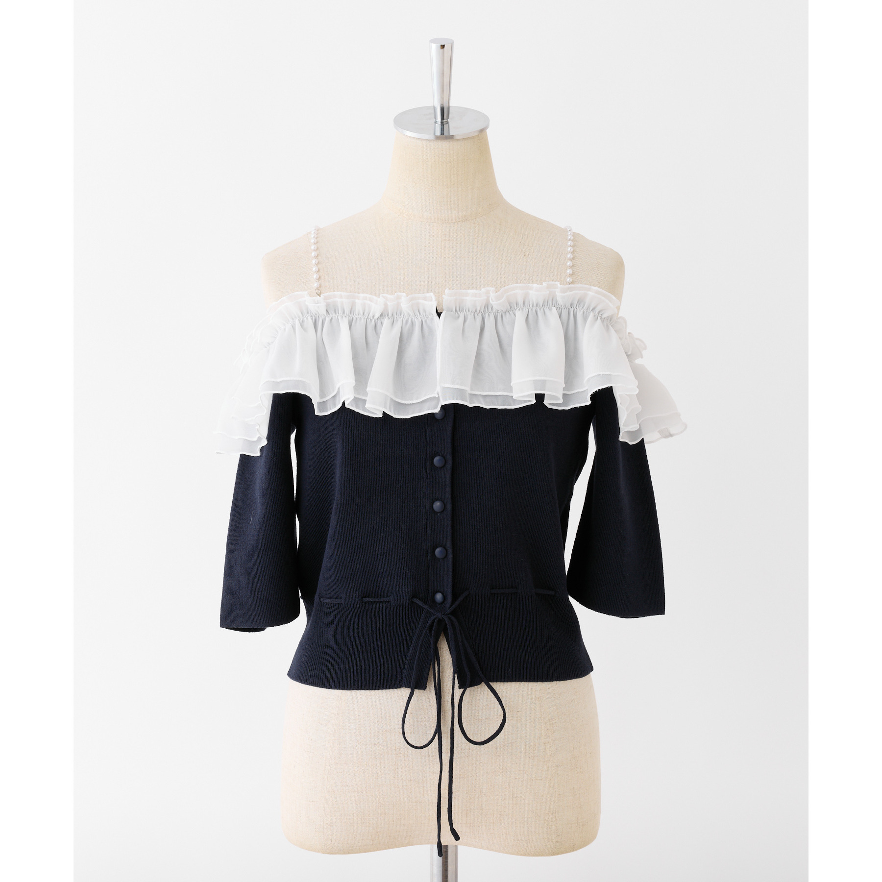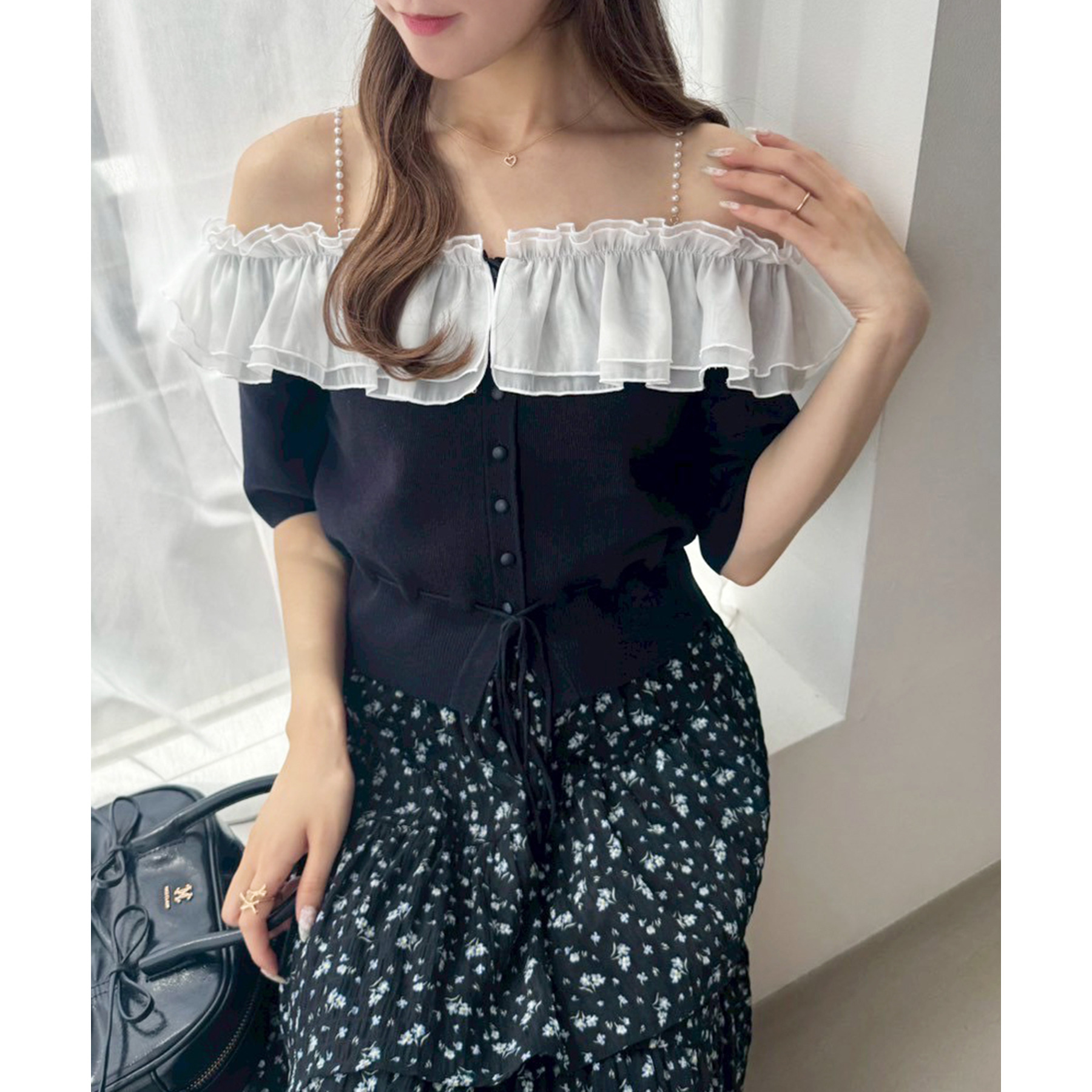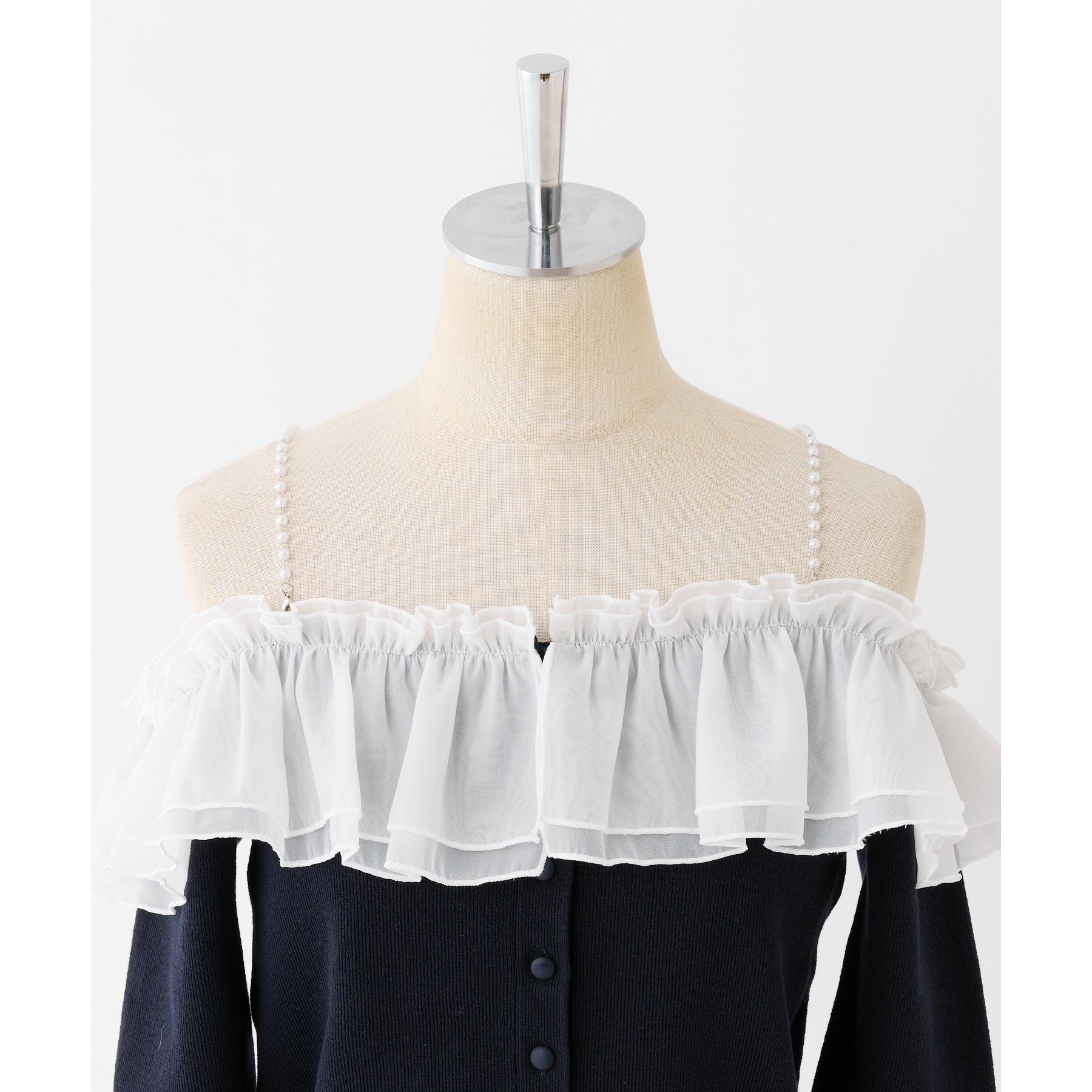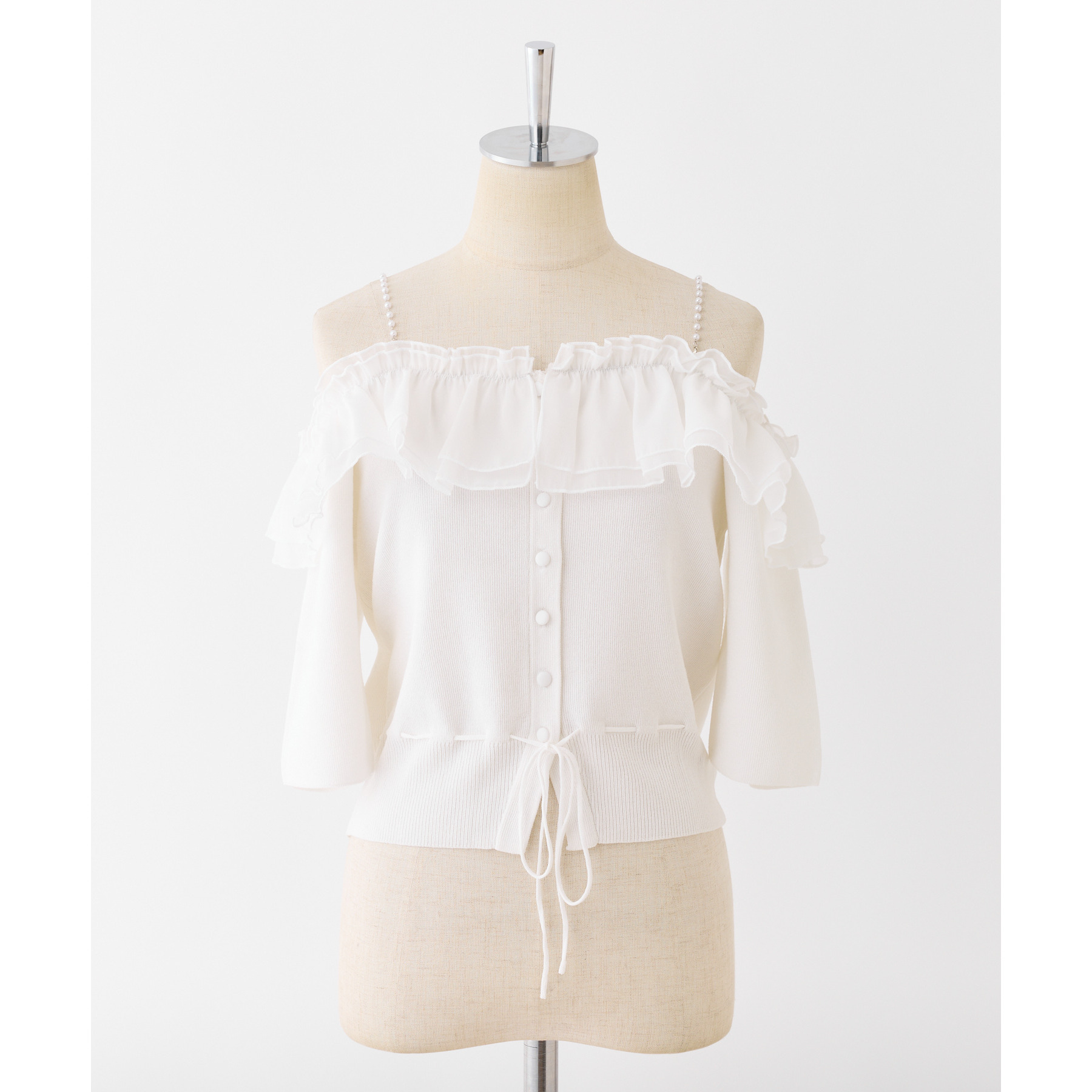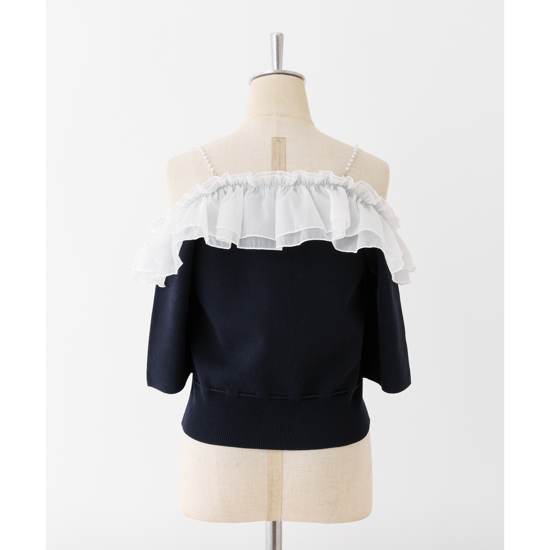 肩紐にパールをあしらった、大人フェミニンなフリルオフショルニット。