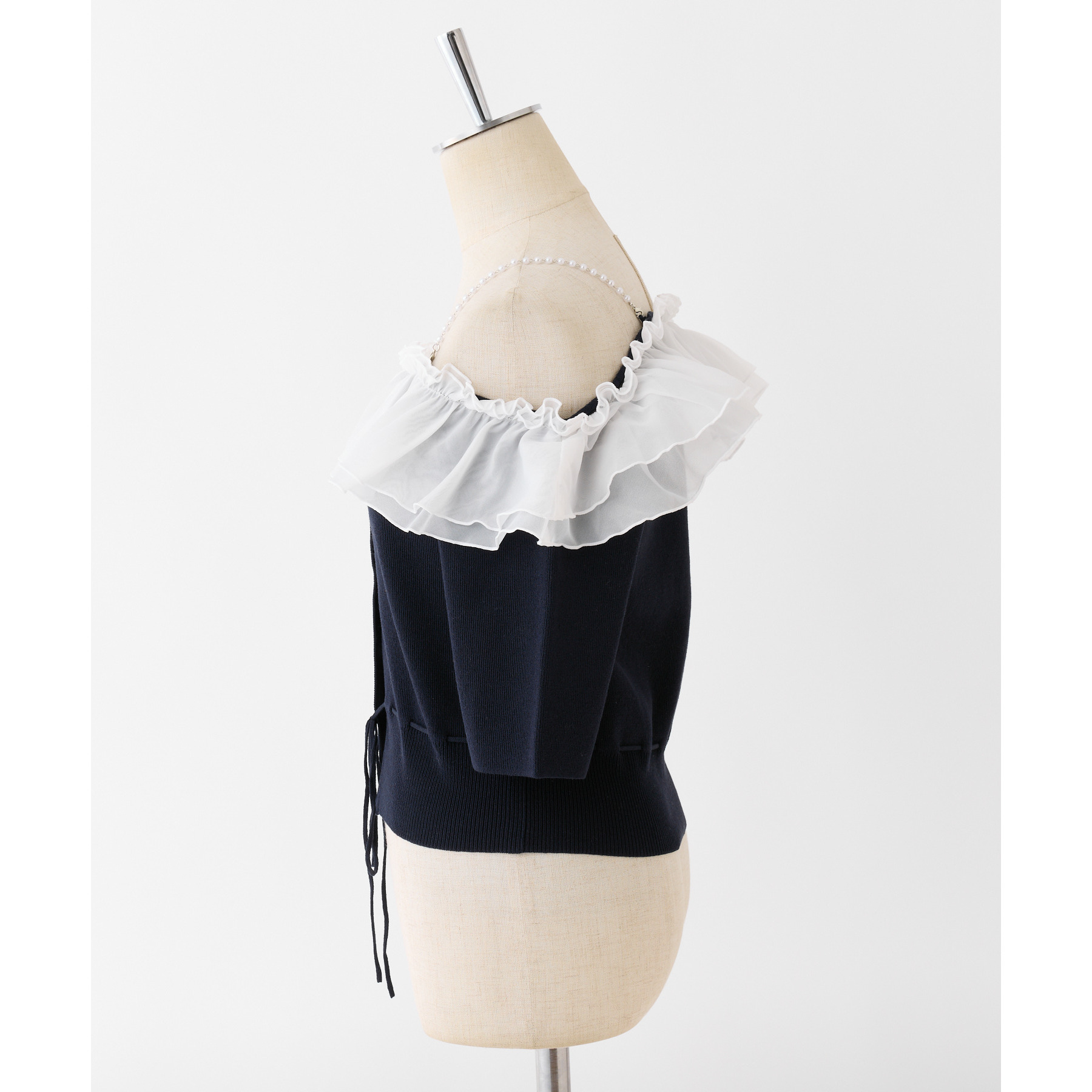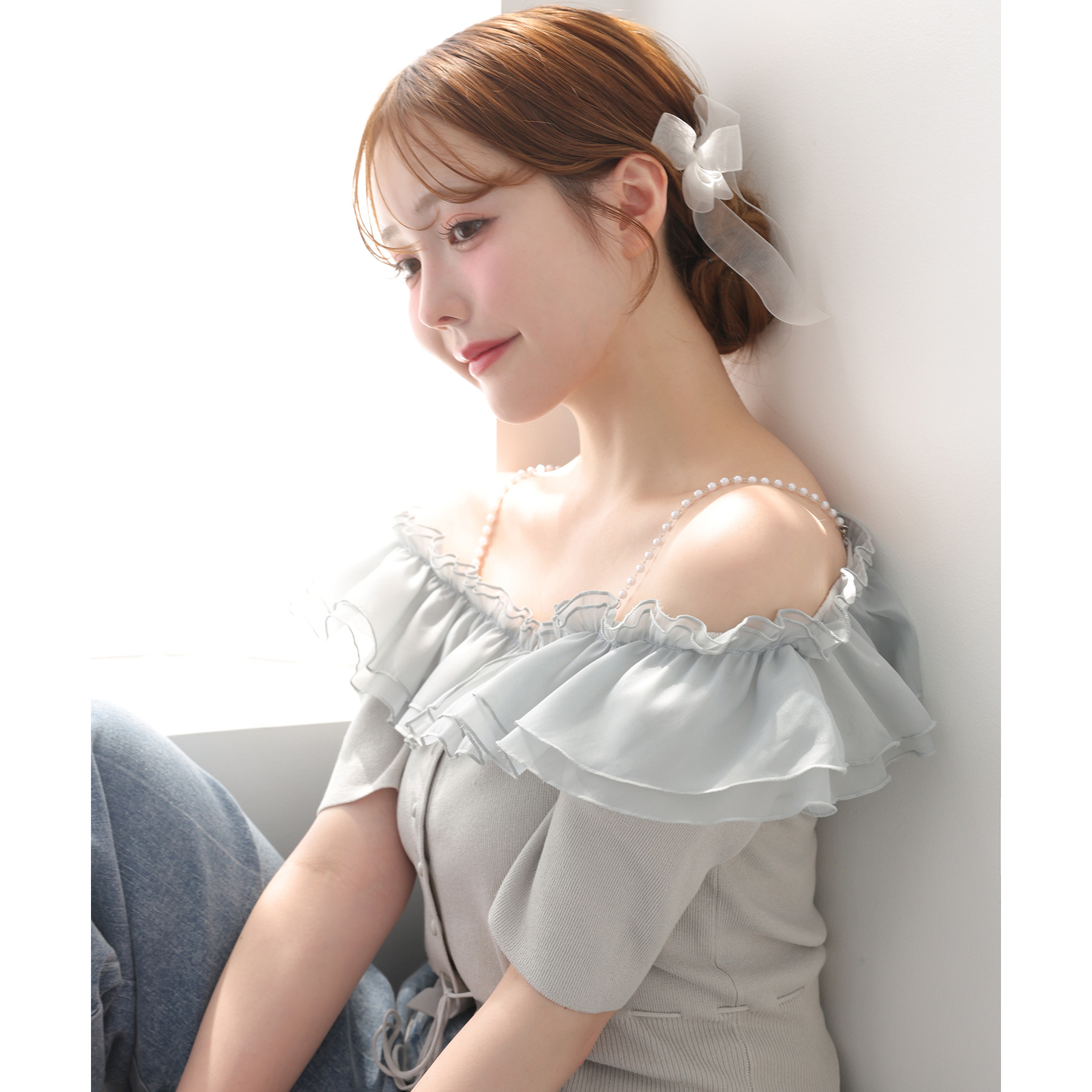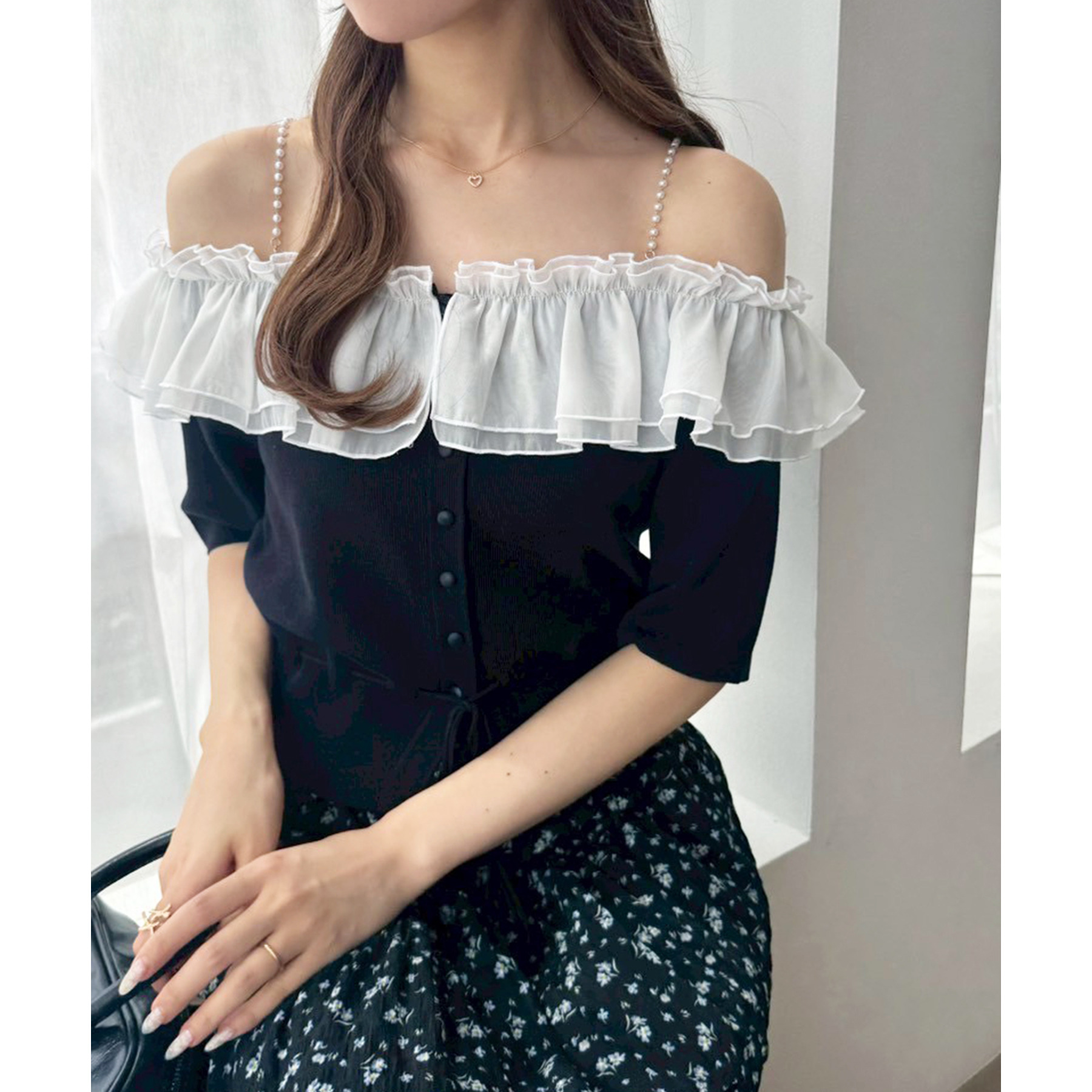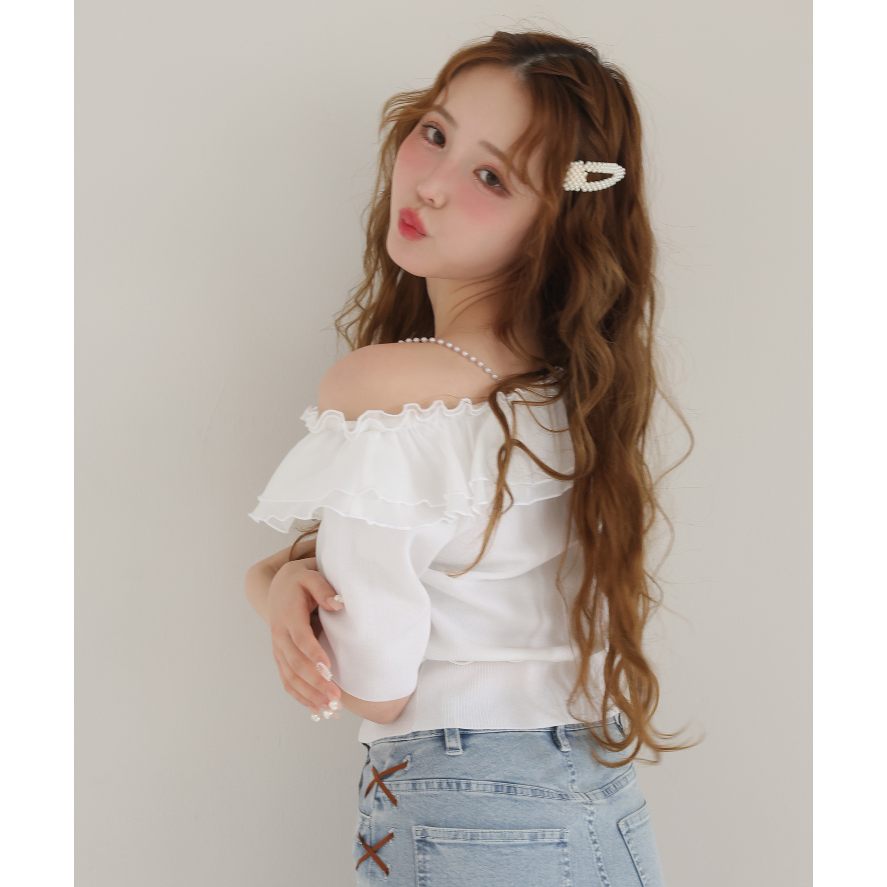 肩紐にパールをあしらった、大人フェミニンなフリルオフショルニット。