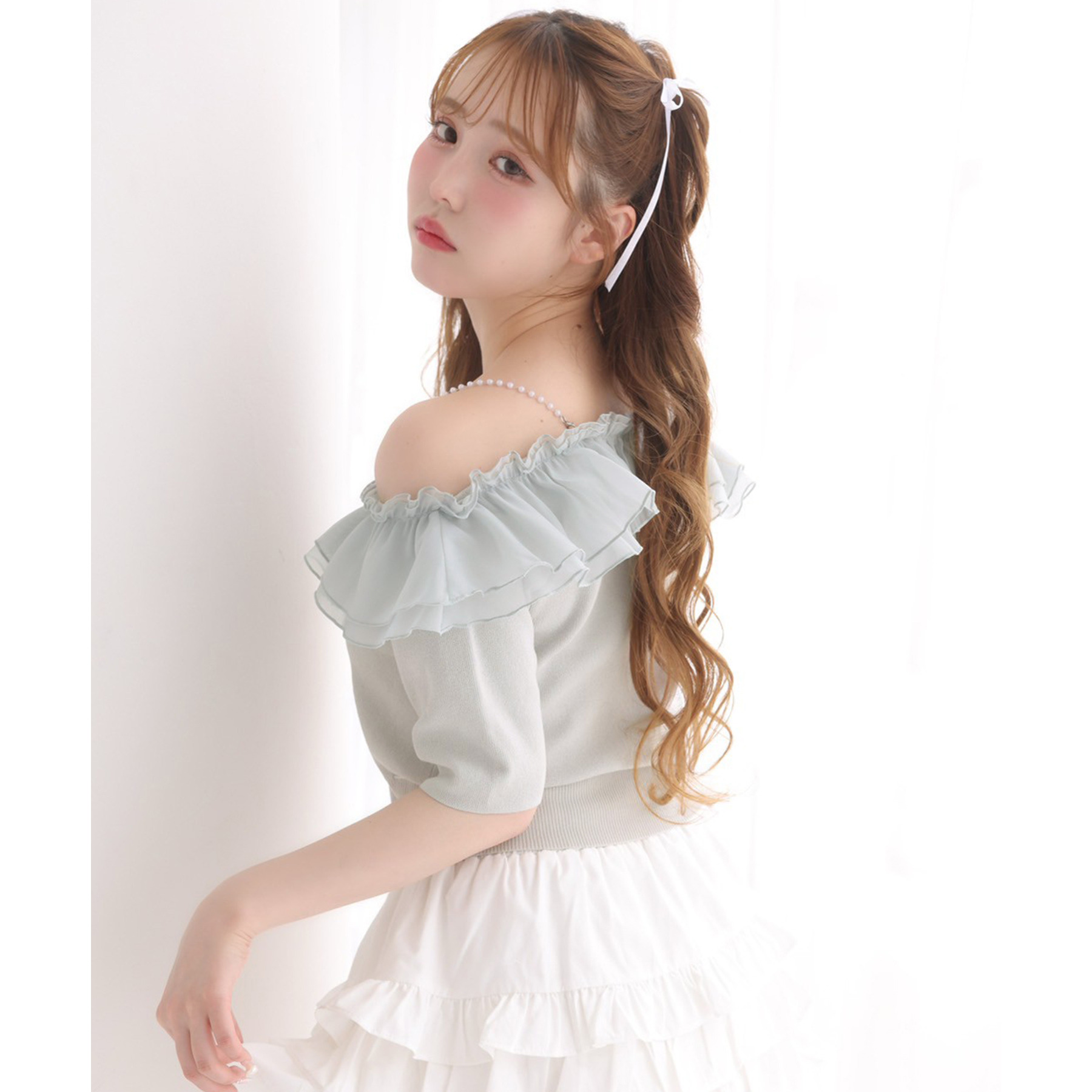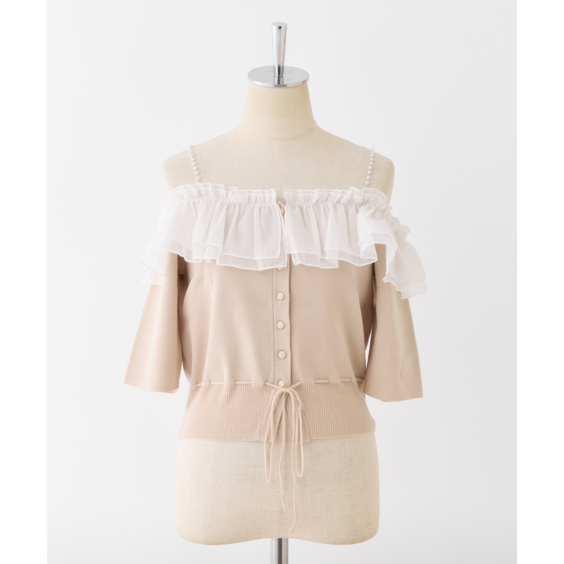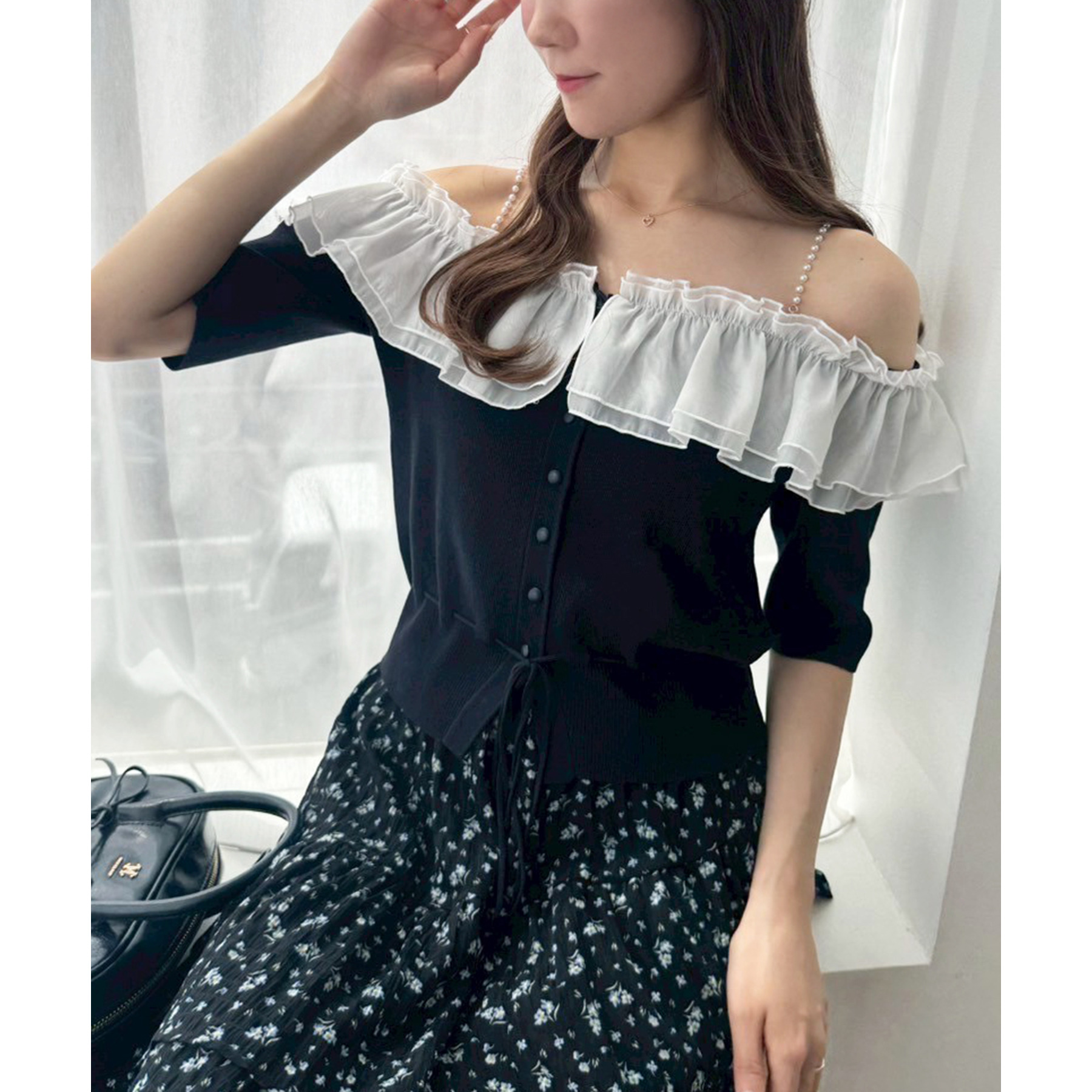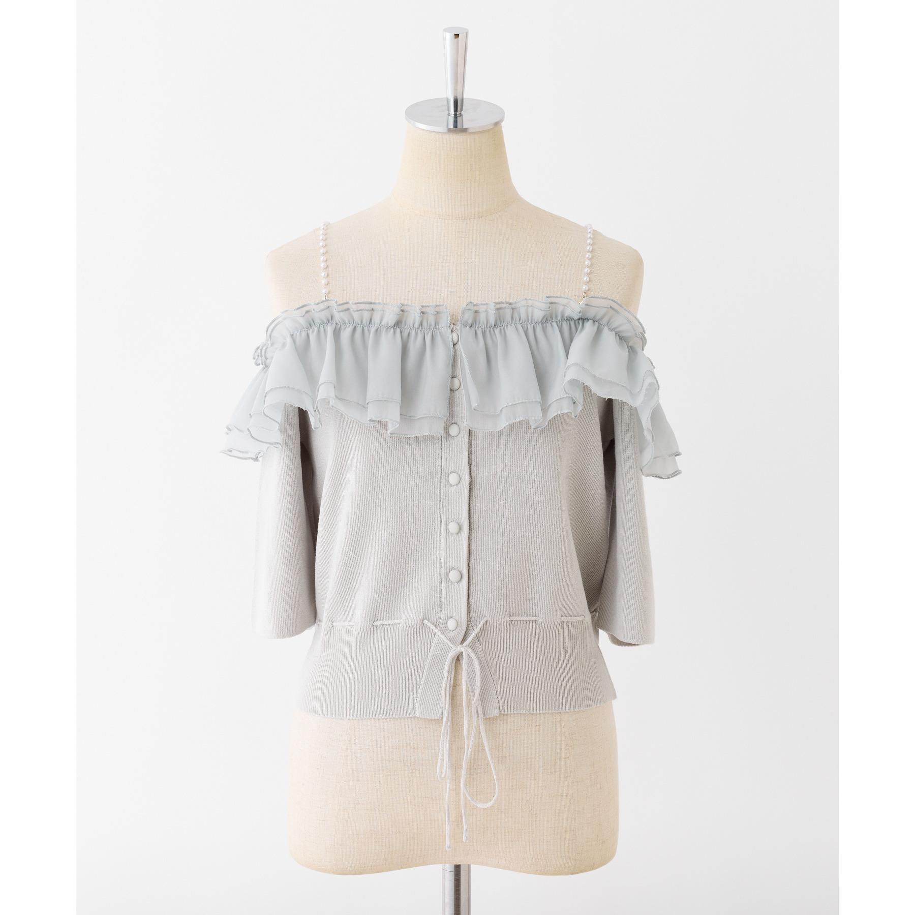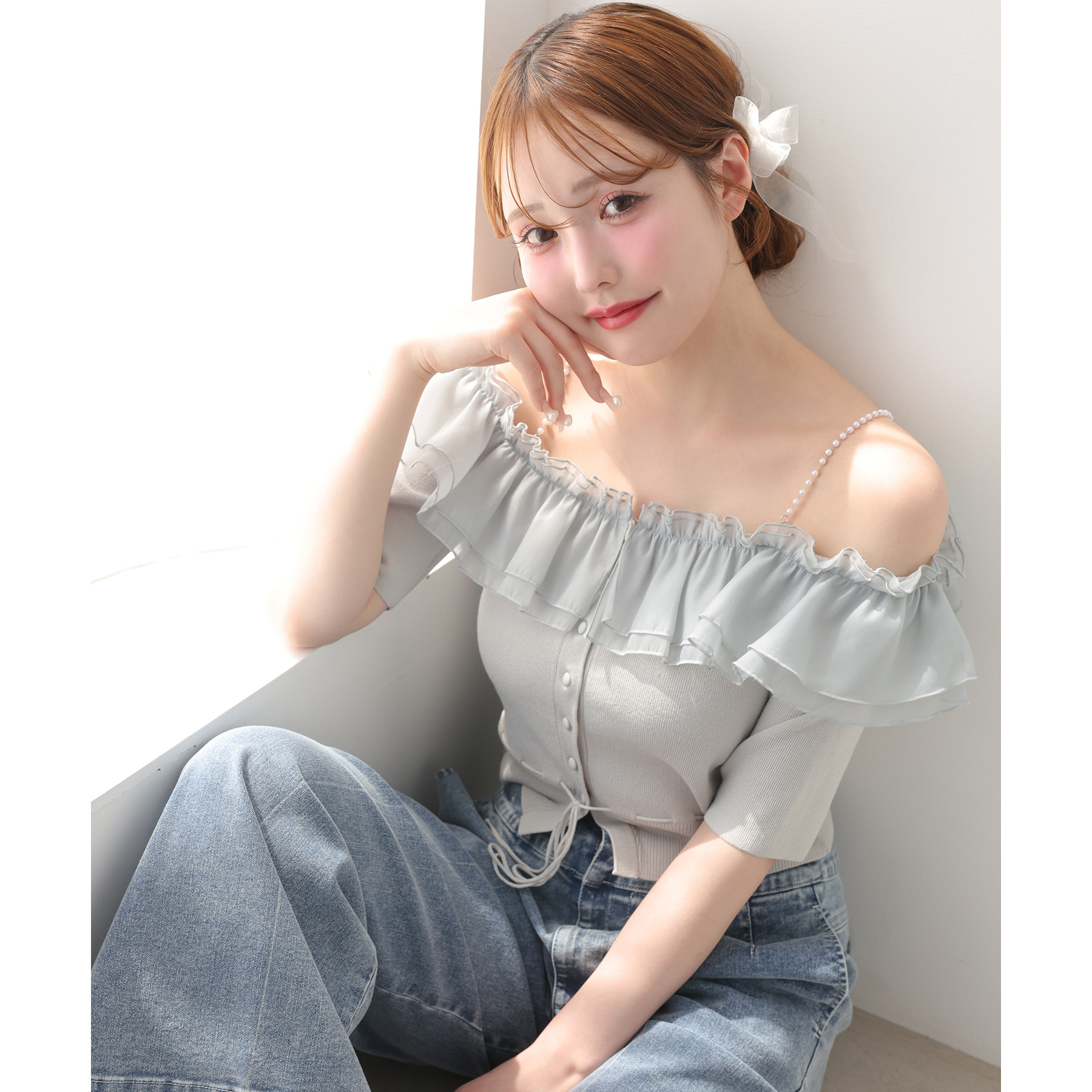 肩紐にパールをあしらった、大人フェミニンなフリルオフショルニット。
