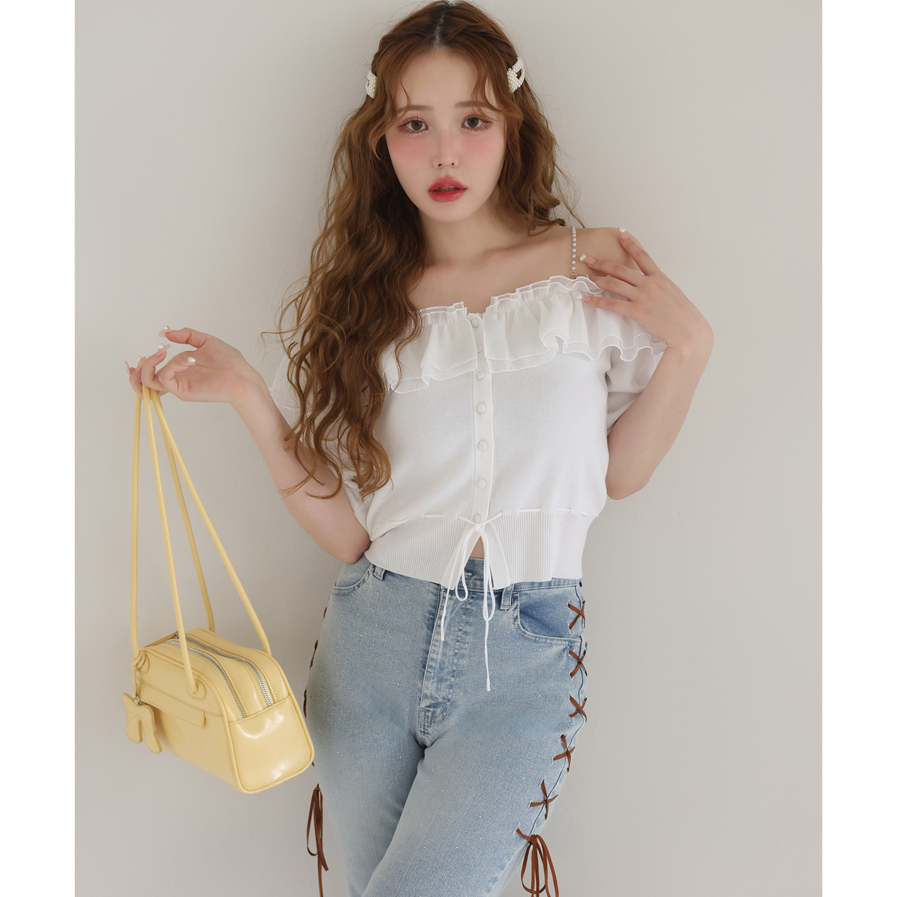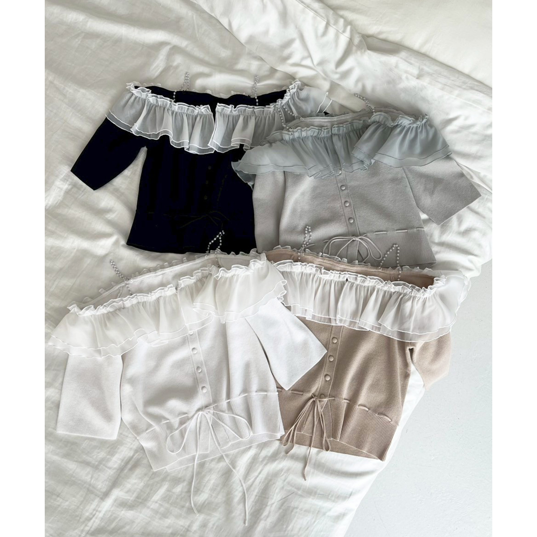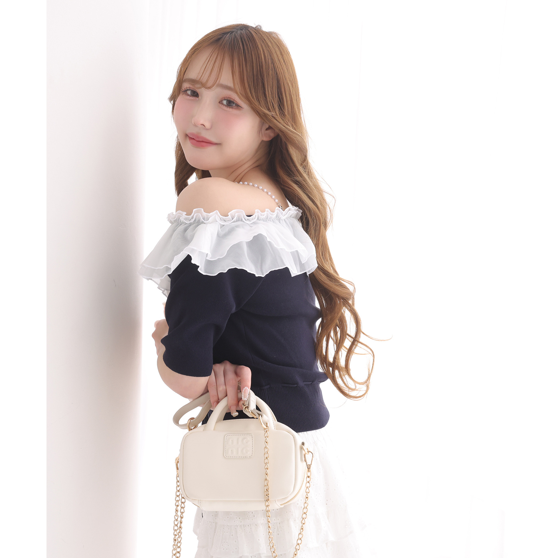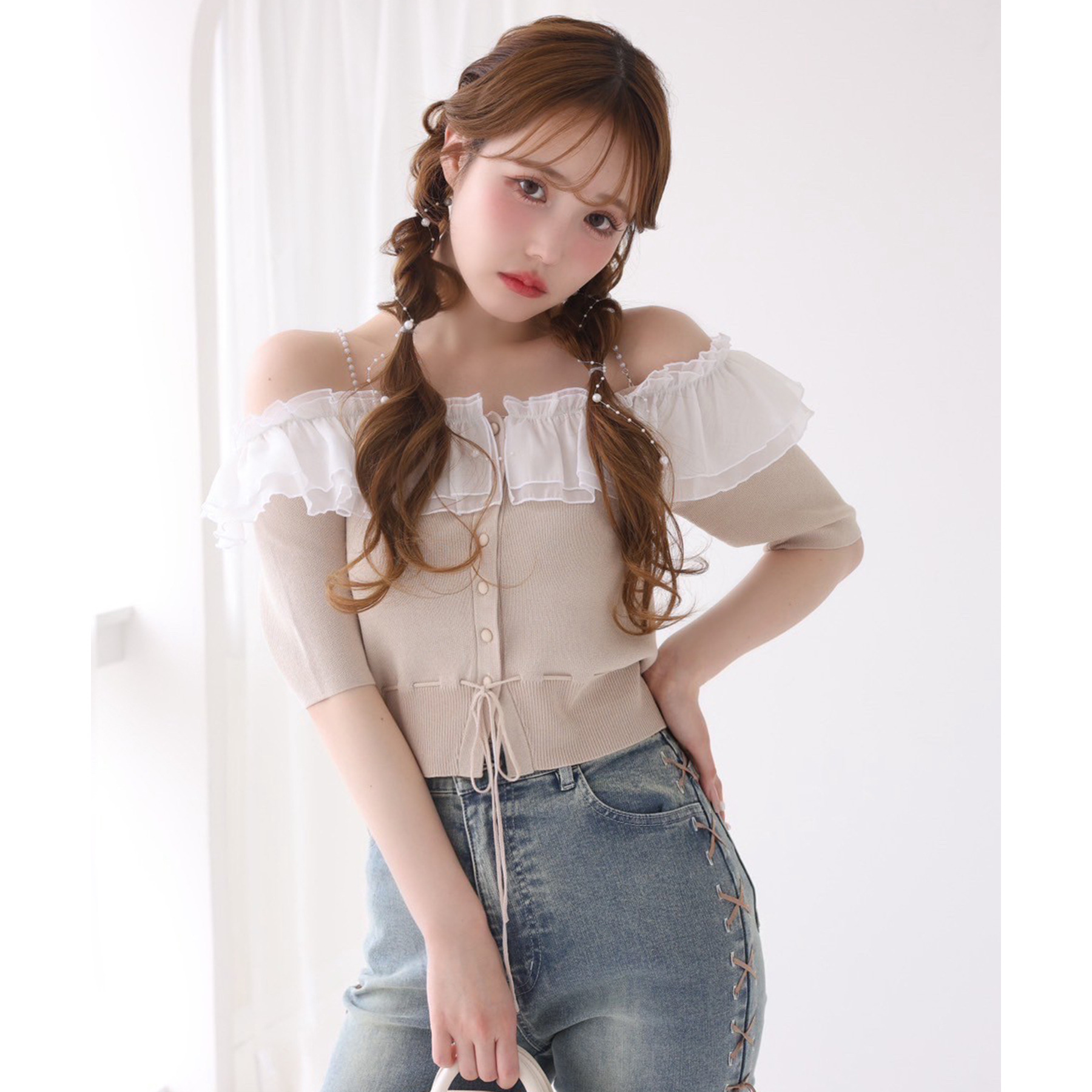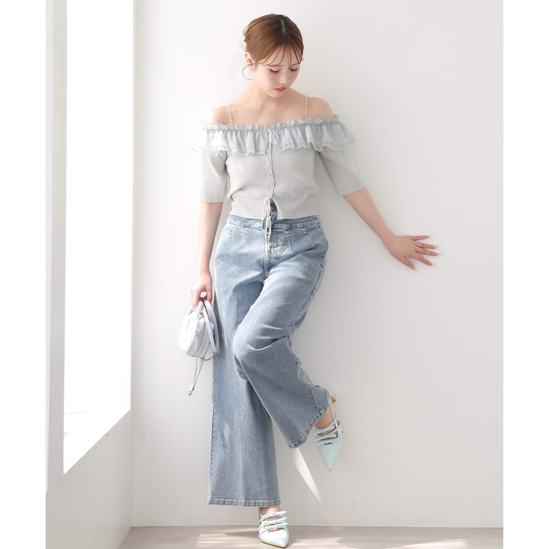 肩紐にパールをあしらった、大人フェミニンなフリルオフショルニット。