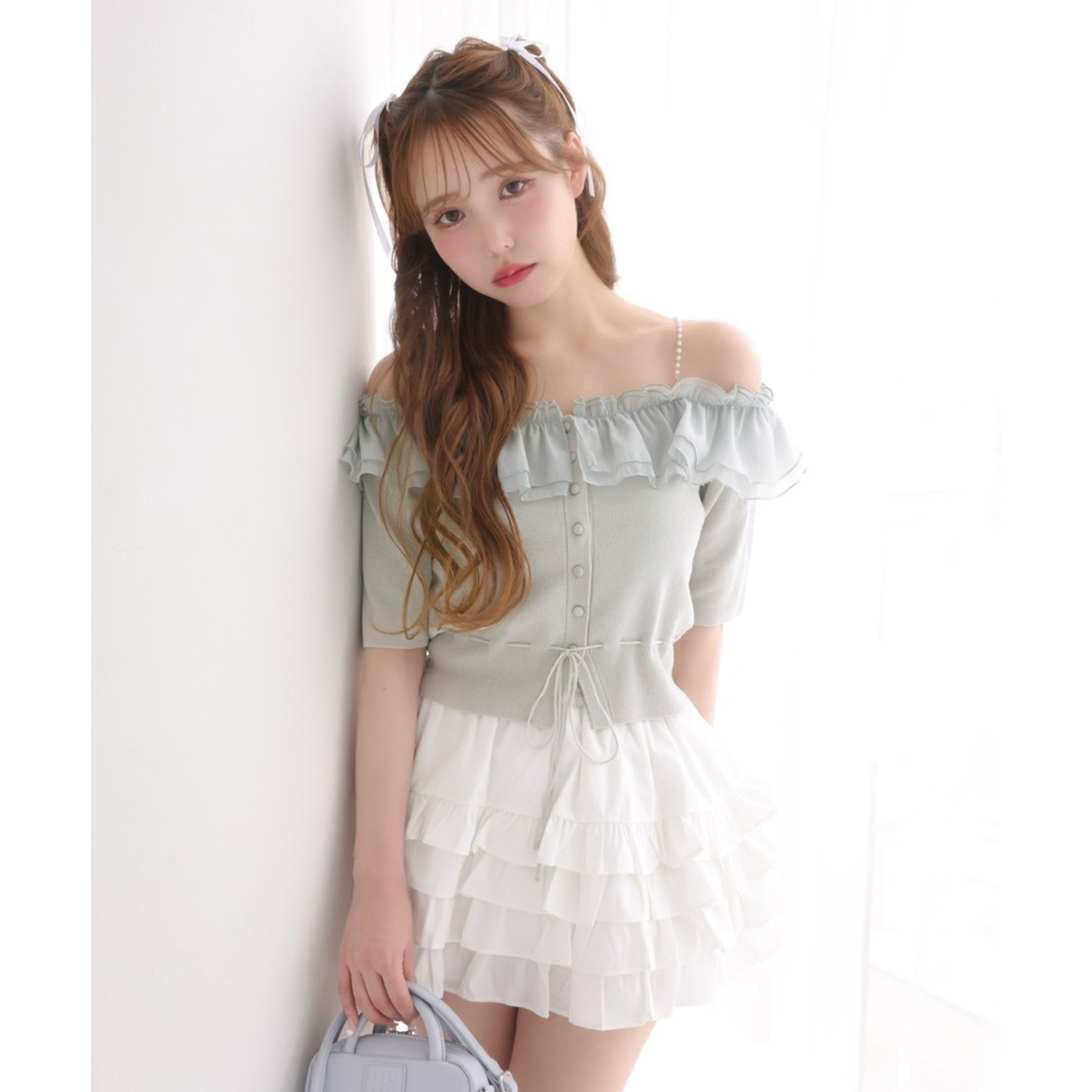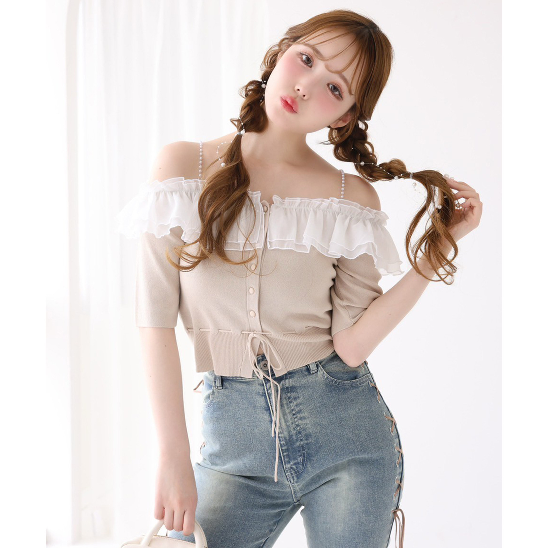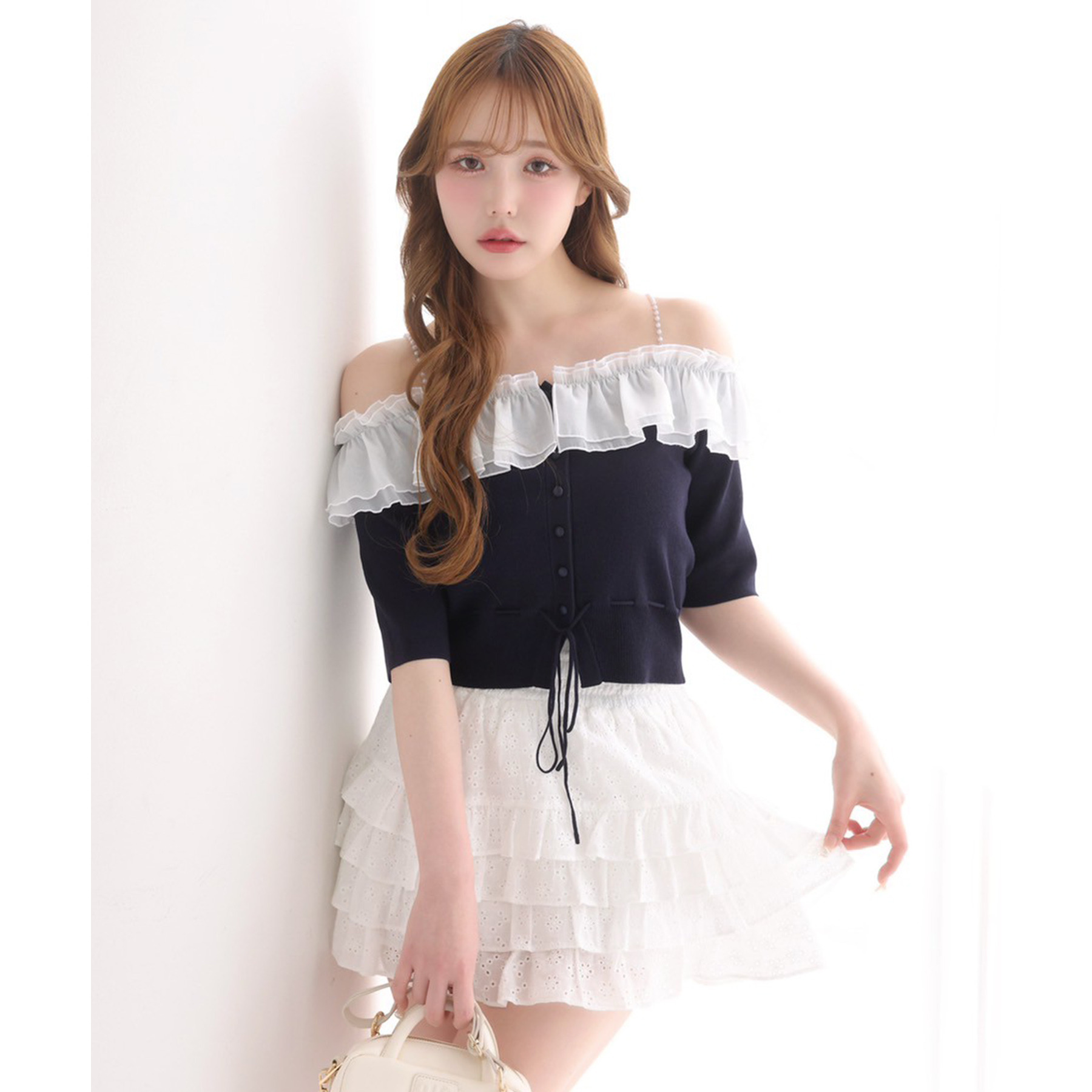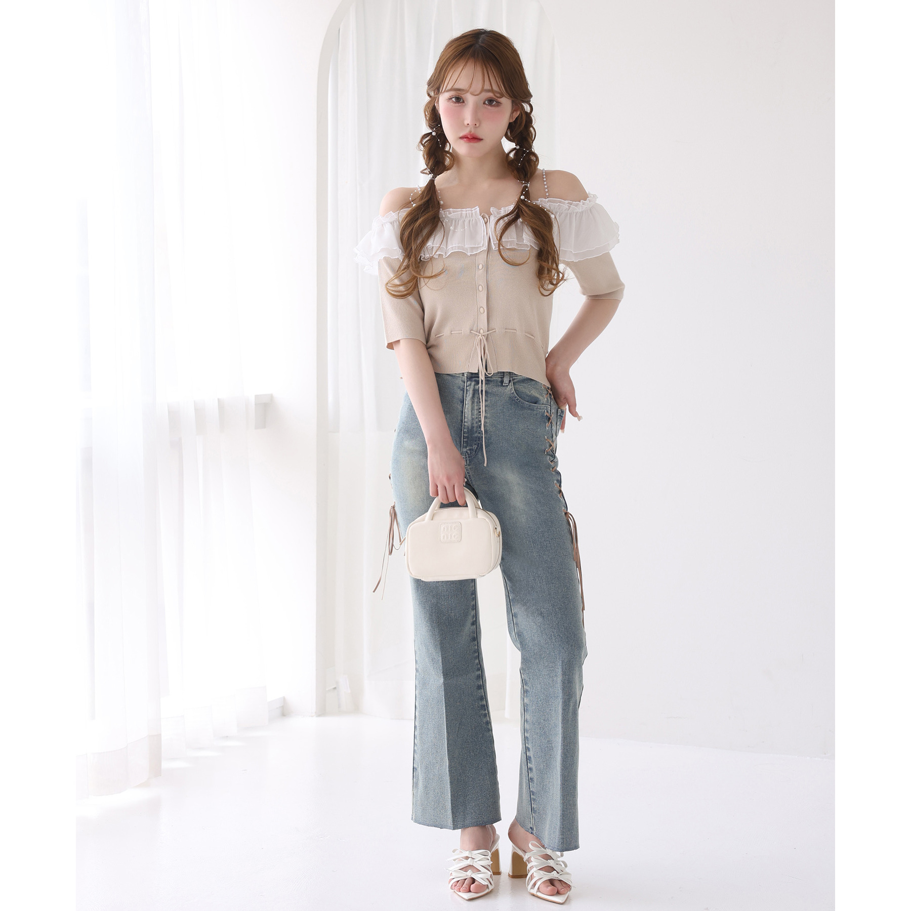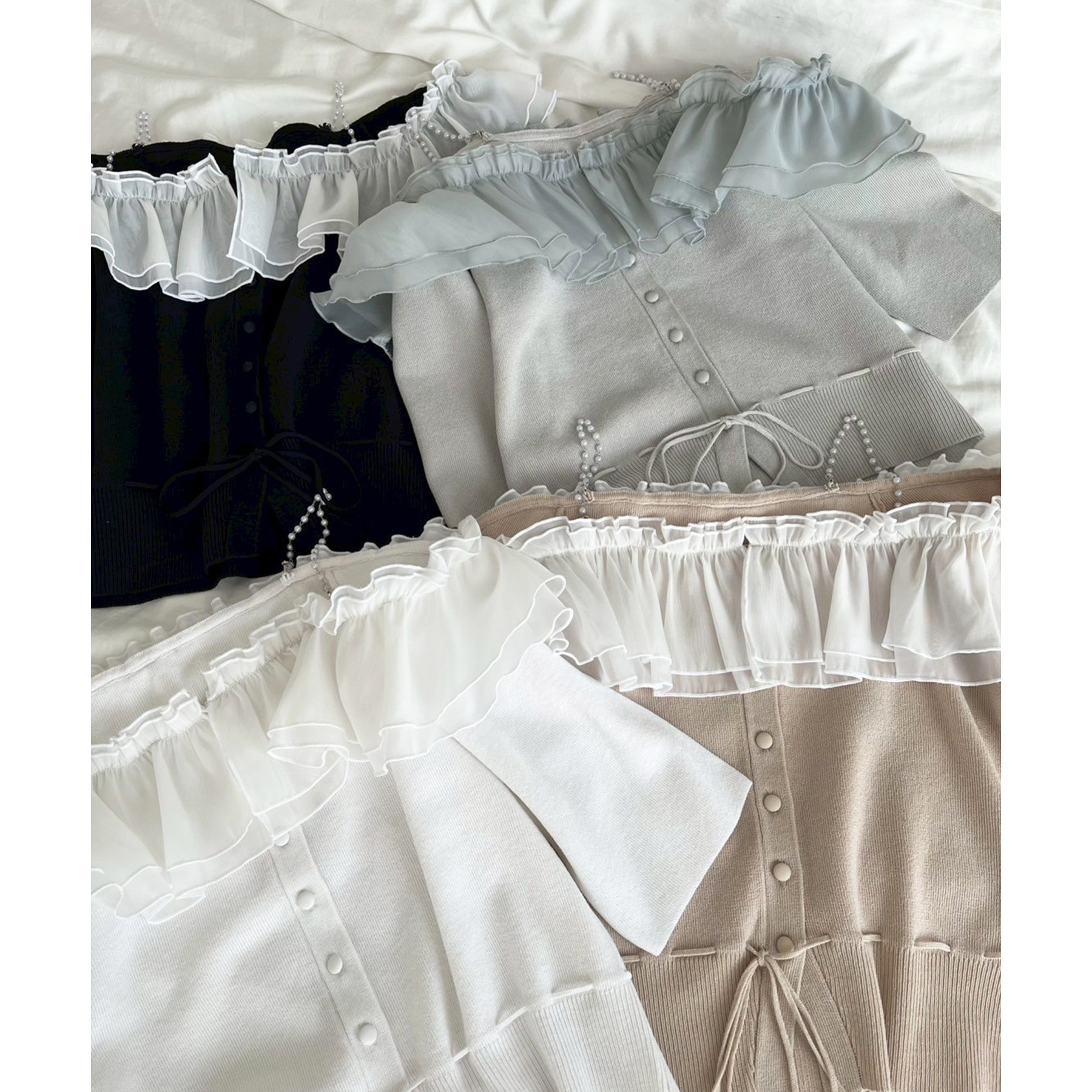 肩紐にパールをあしらった、大人フェミニンなフリルオフショルニット。