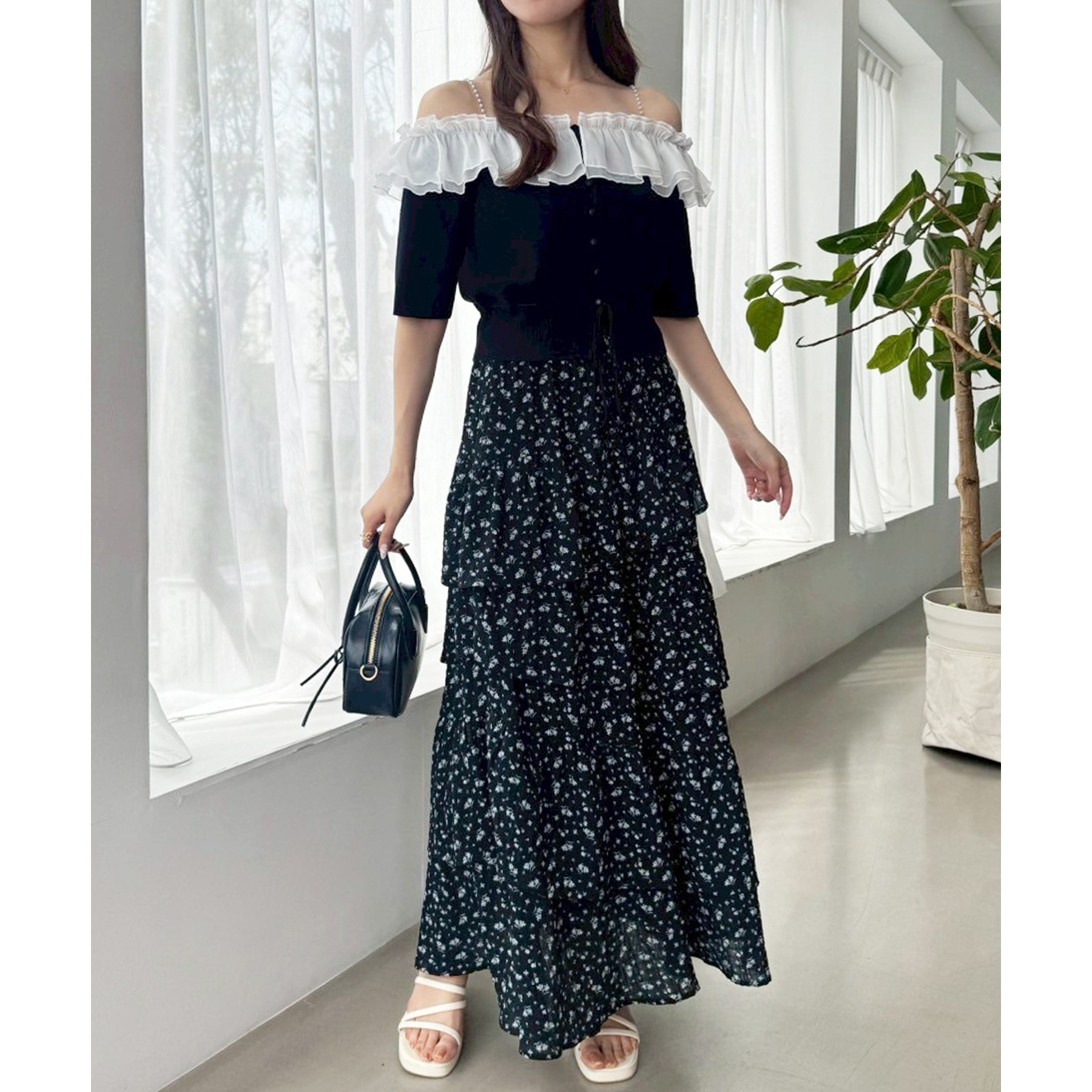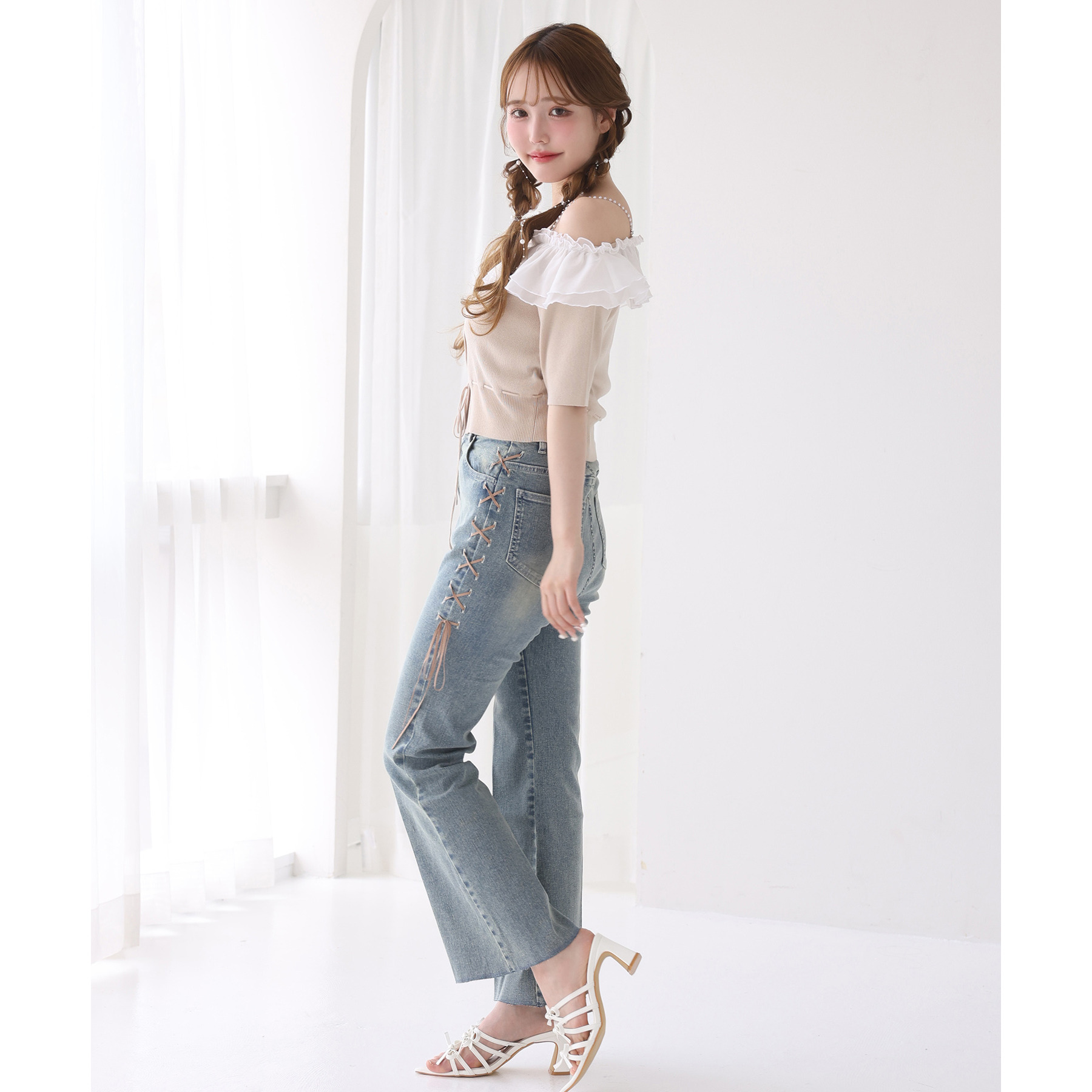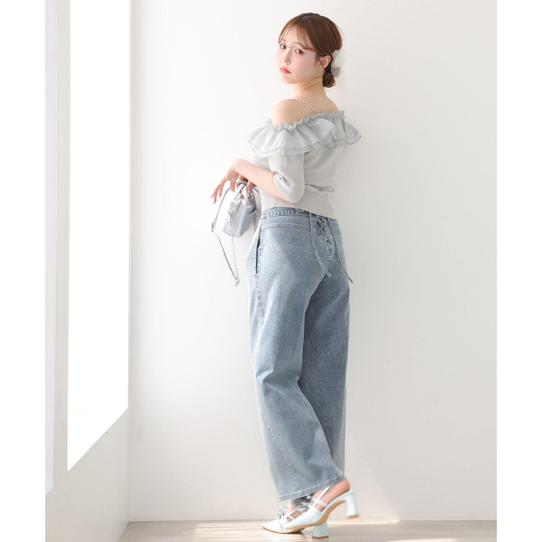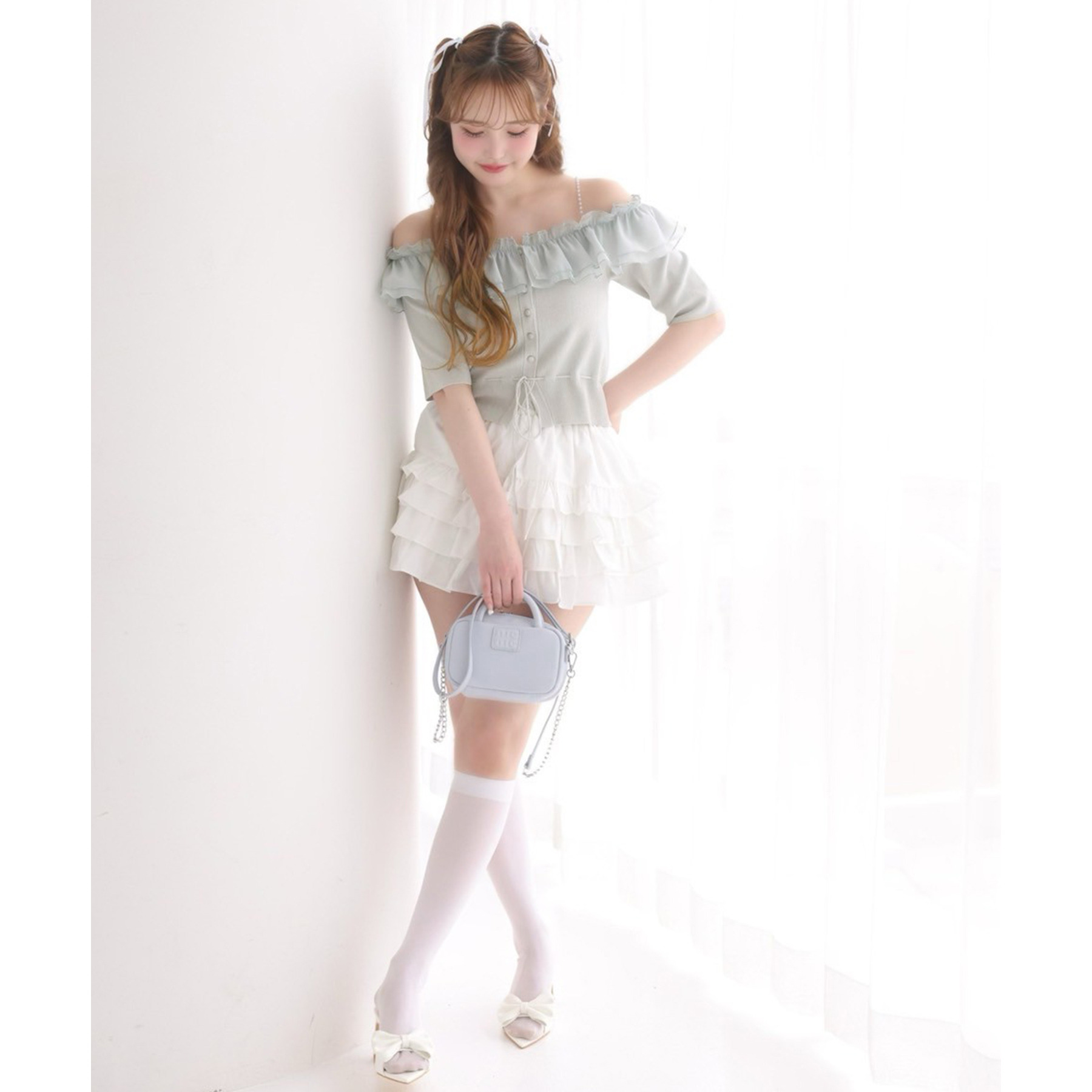 肩紐にパールをあしらった、大人フェミニンなフリルオフショルニット。