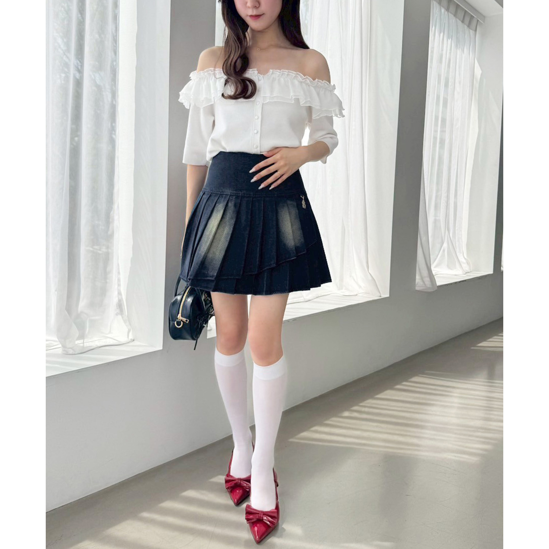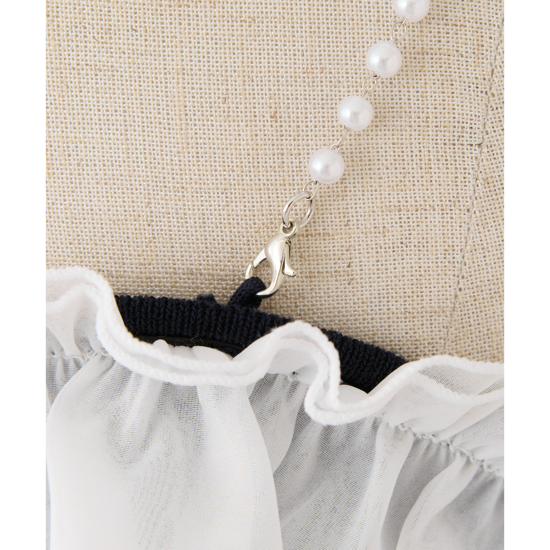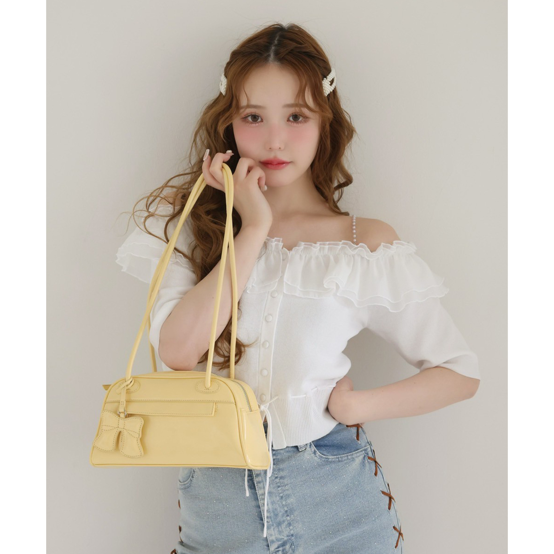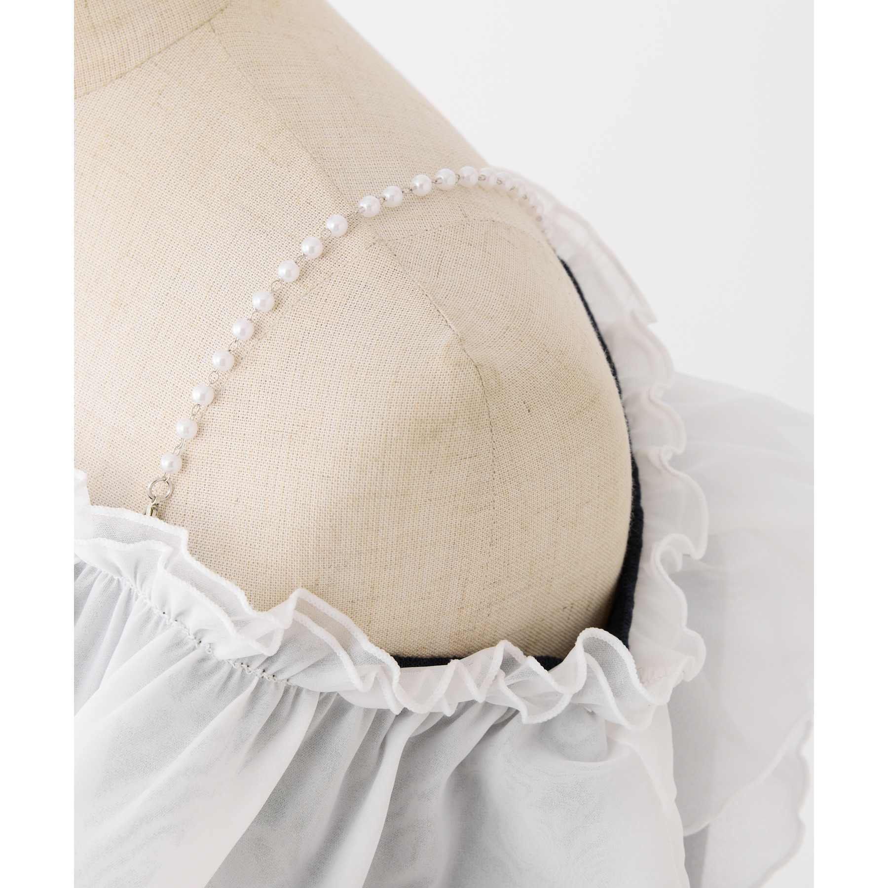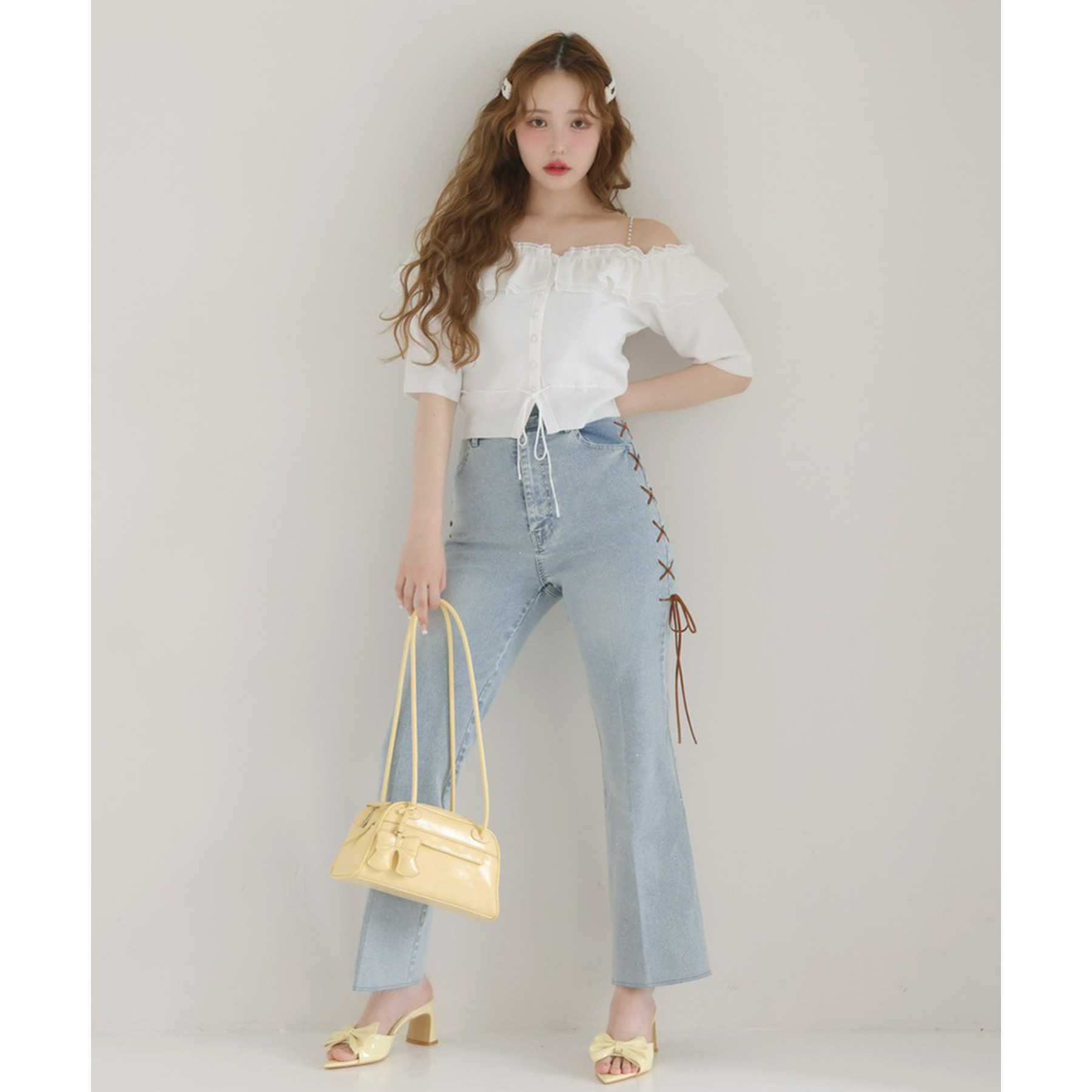 肩紐にパールをあしらった、大人フェミニンなフリルオフショルニット。