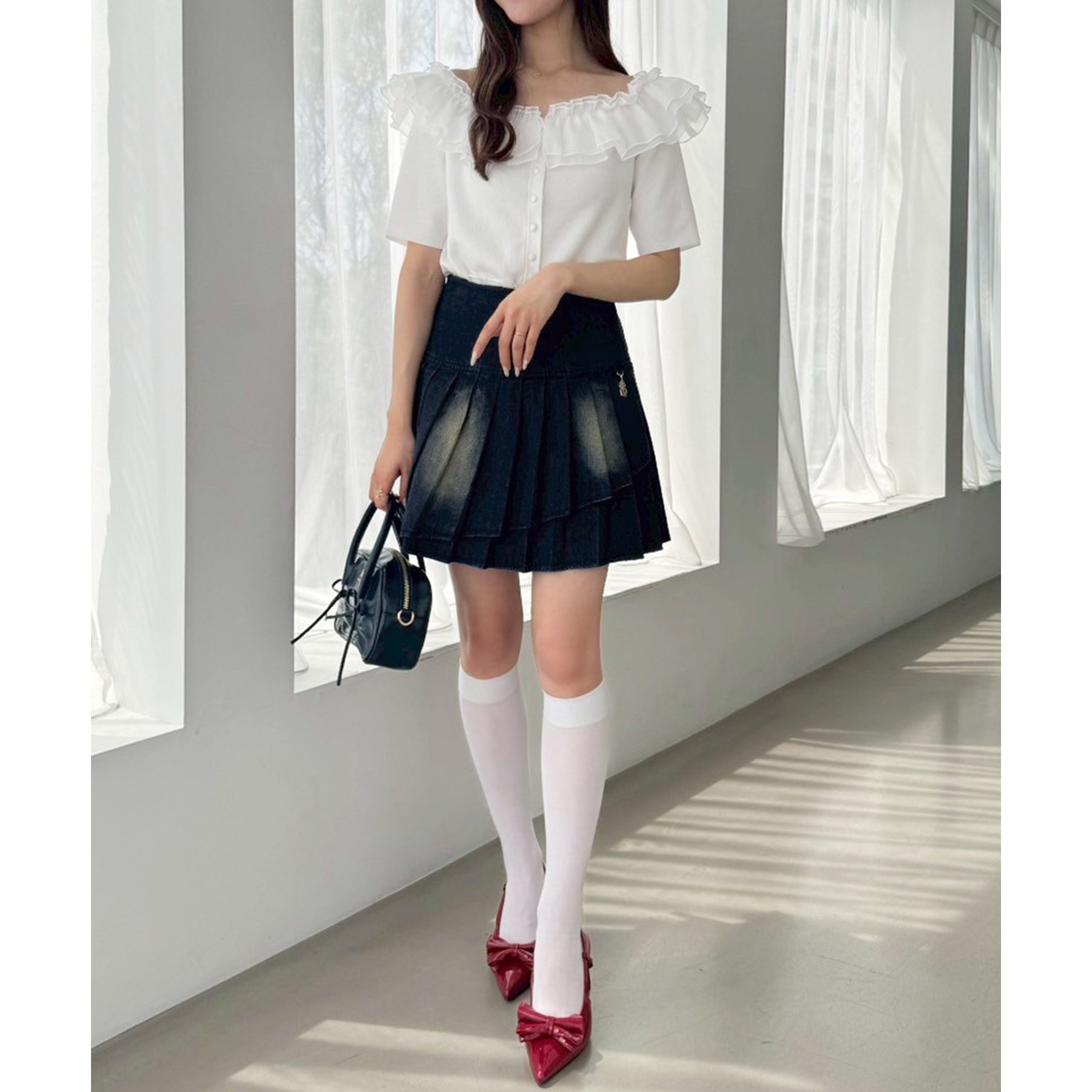 フリルが顔まわりを華やかに演出し、上品で高見えする一枚に。