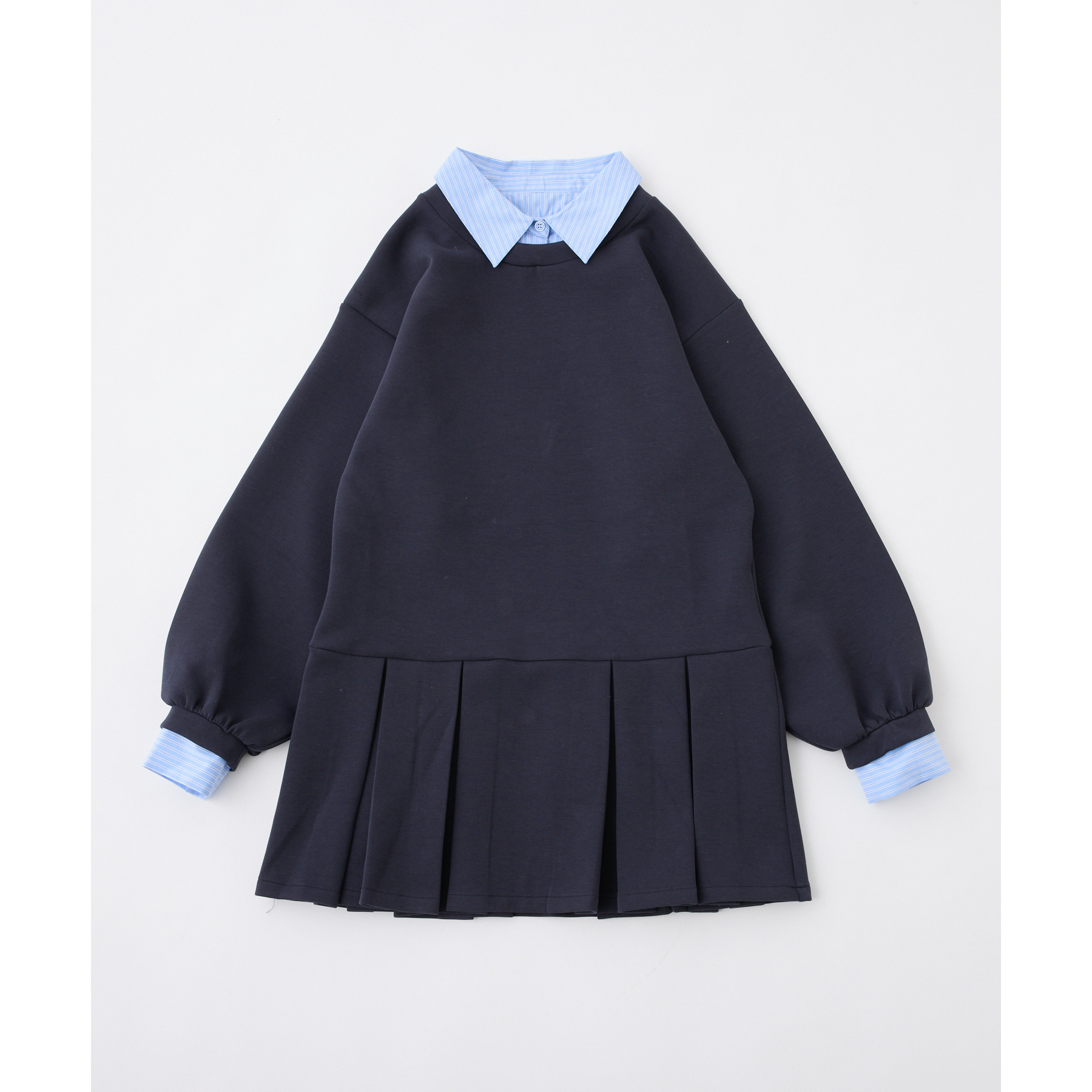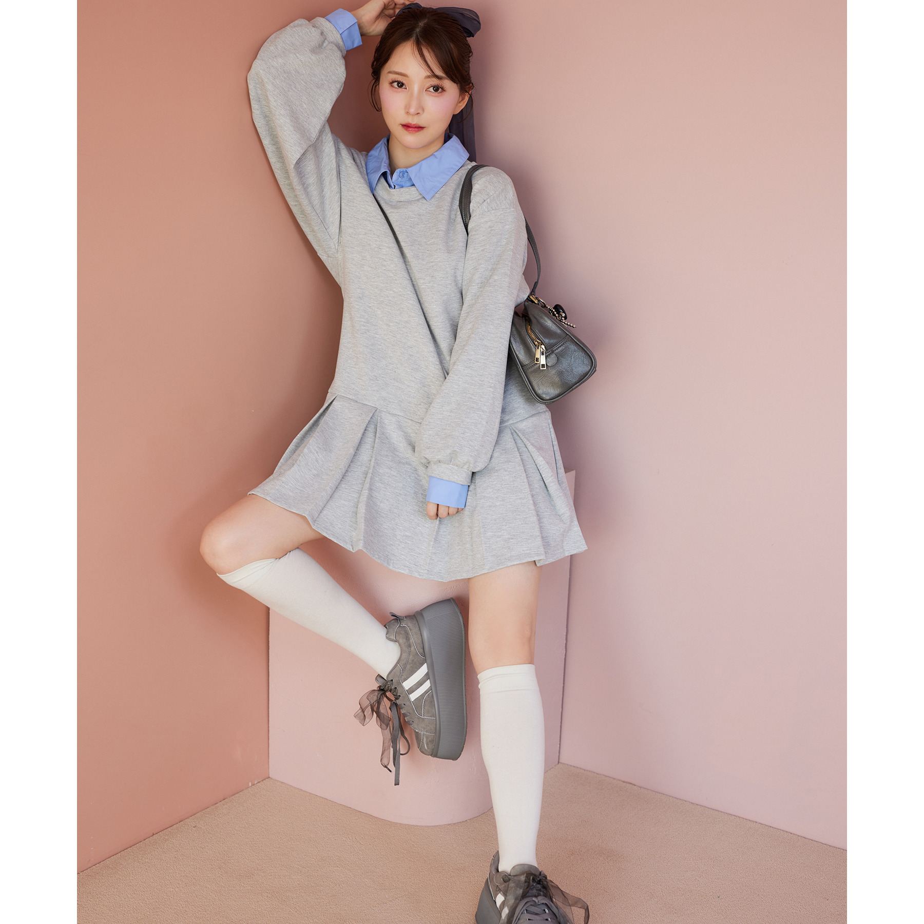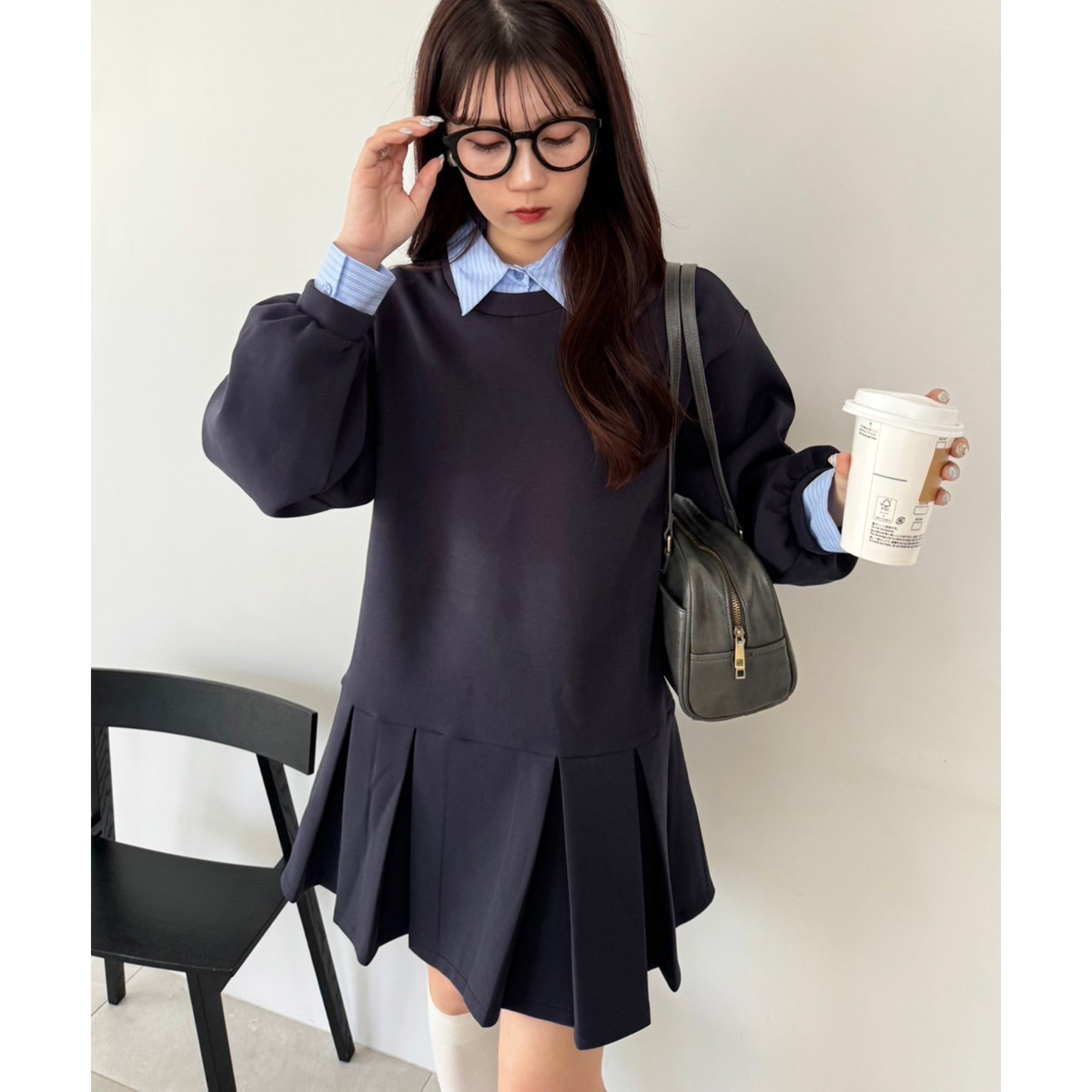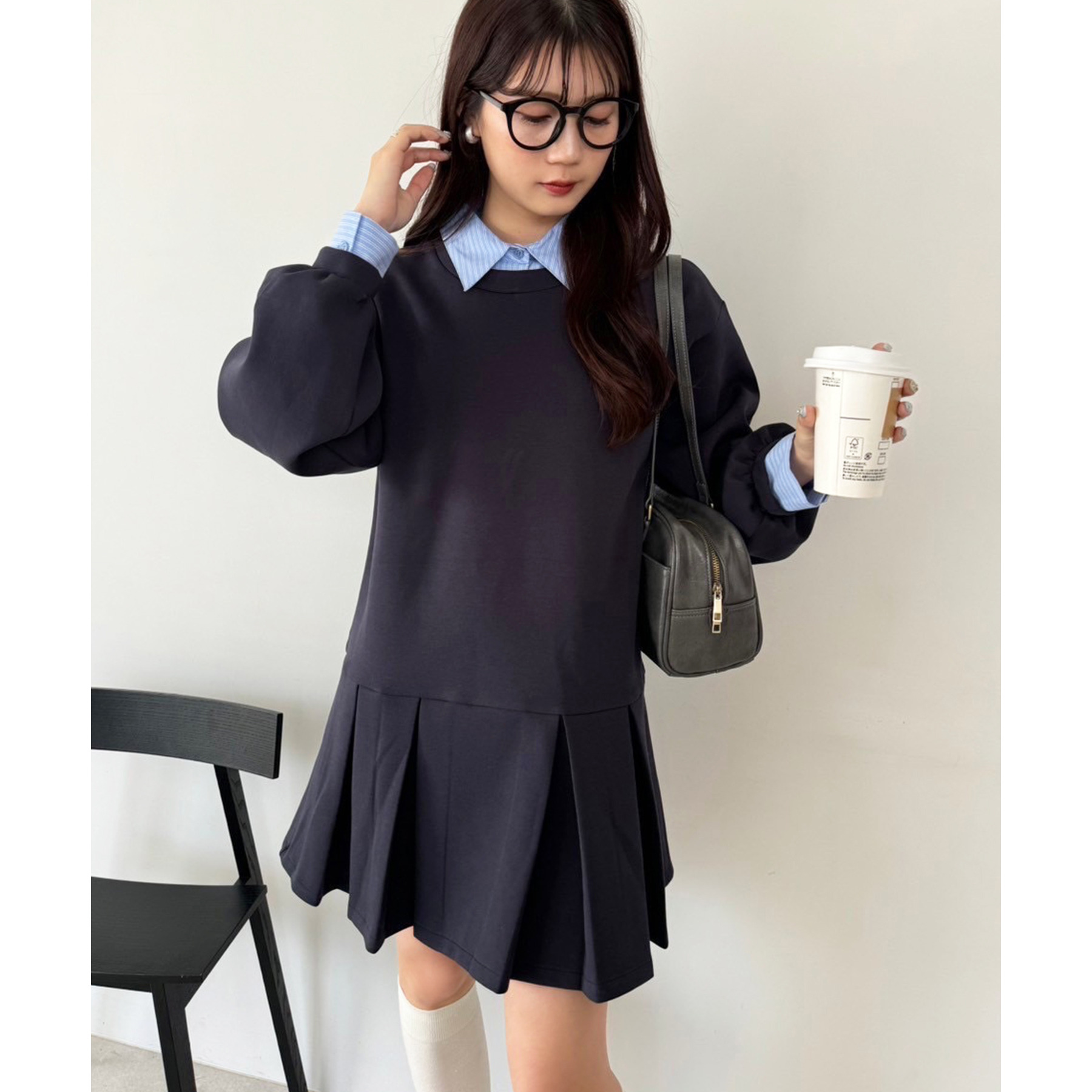 ビッグスウェットとシャツをレイヤードしたようなデザインのワンピース。