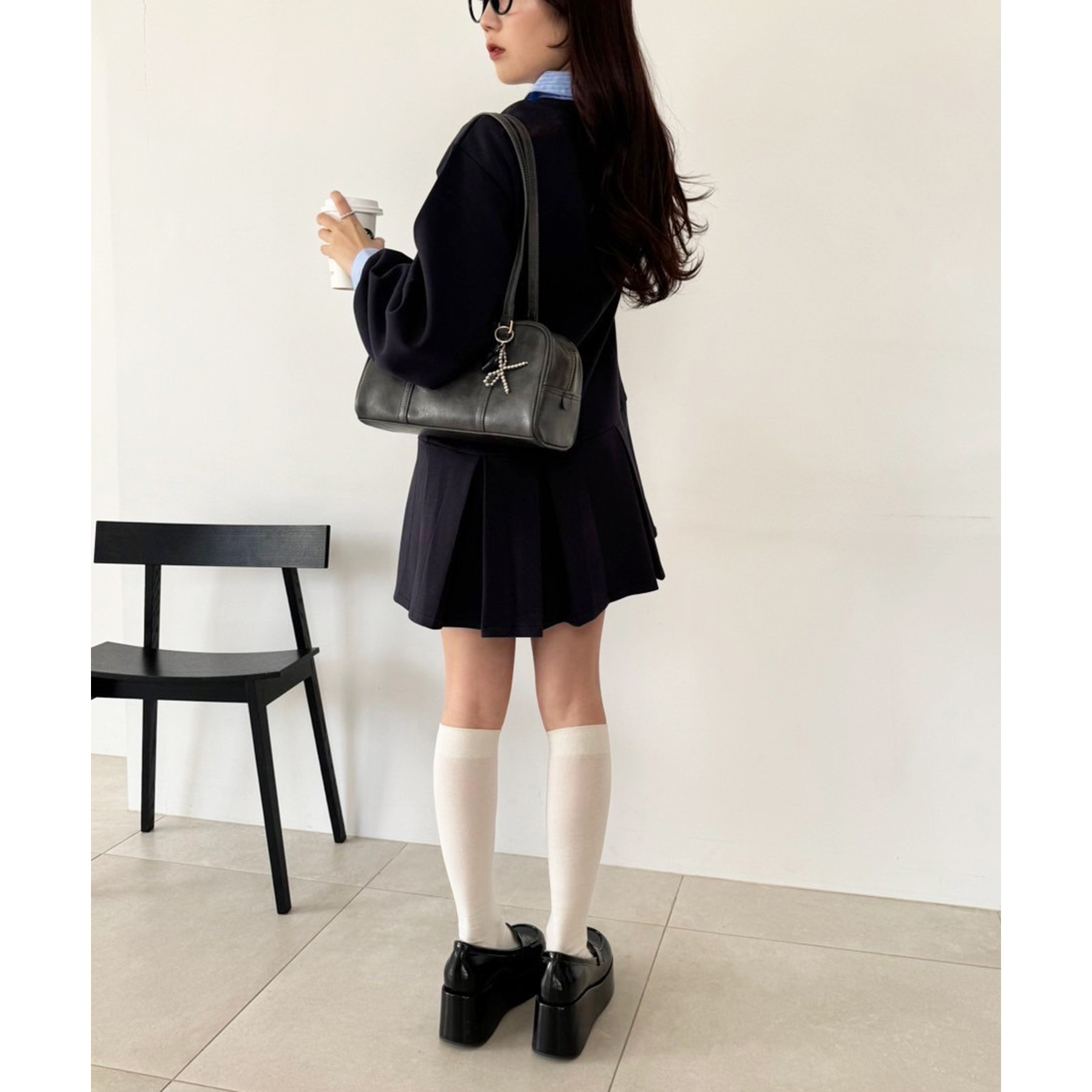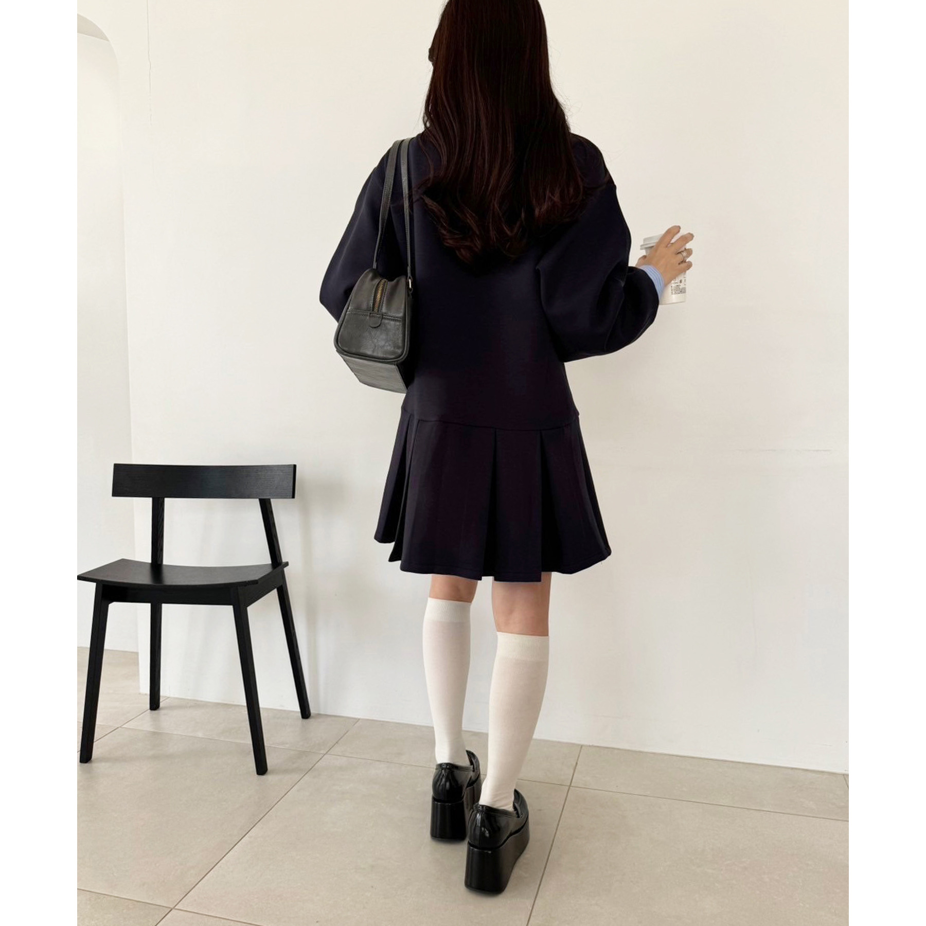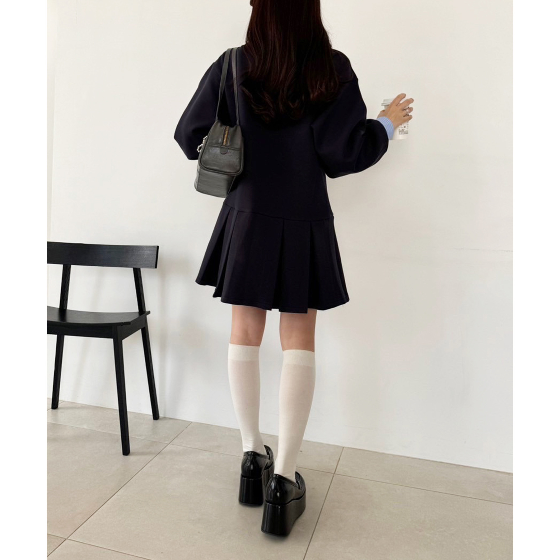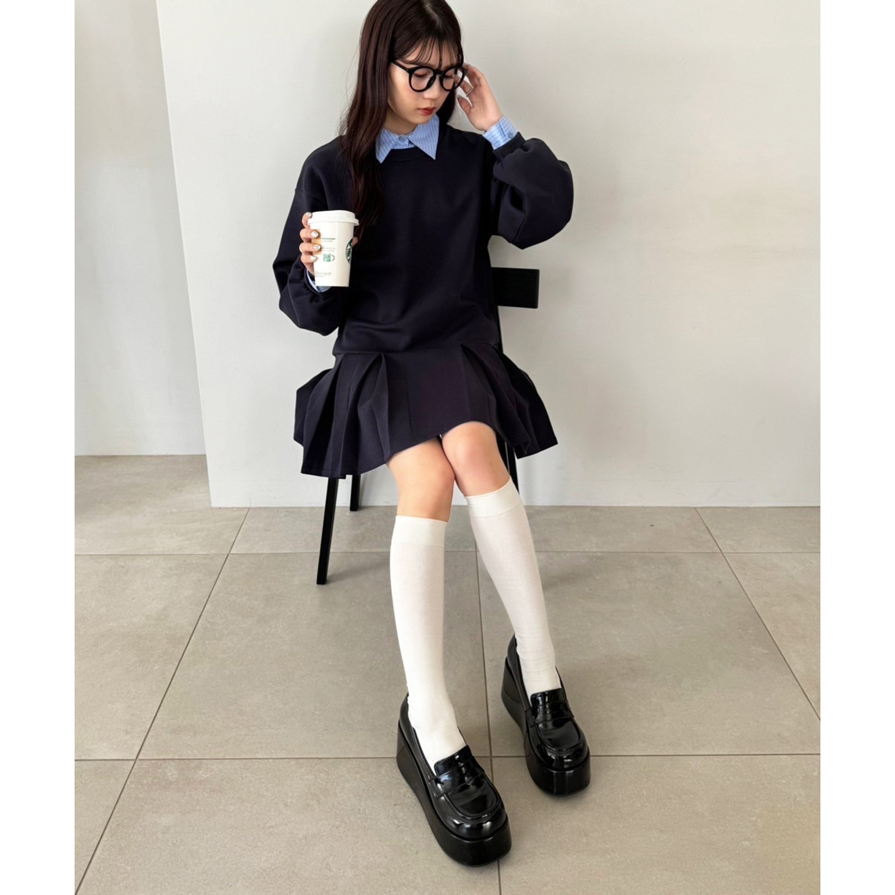 足元はハイソックス×スニーカーで、よりトレンドライクなスタイルを楽しめます。