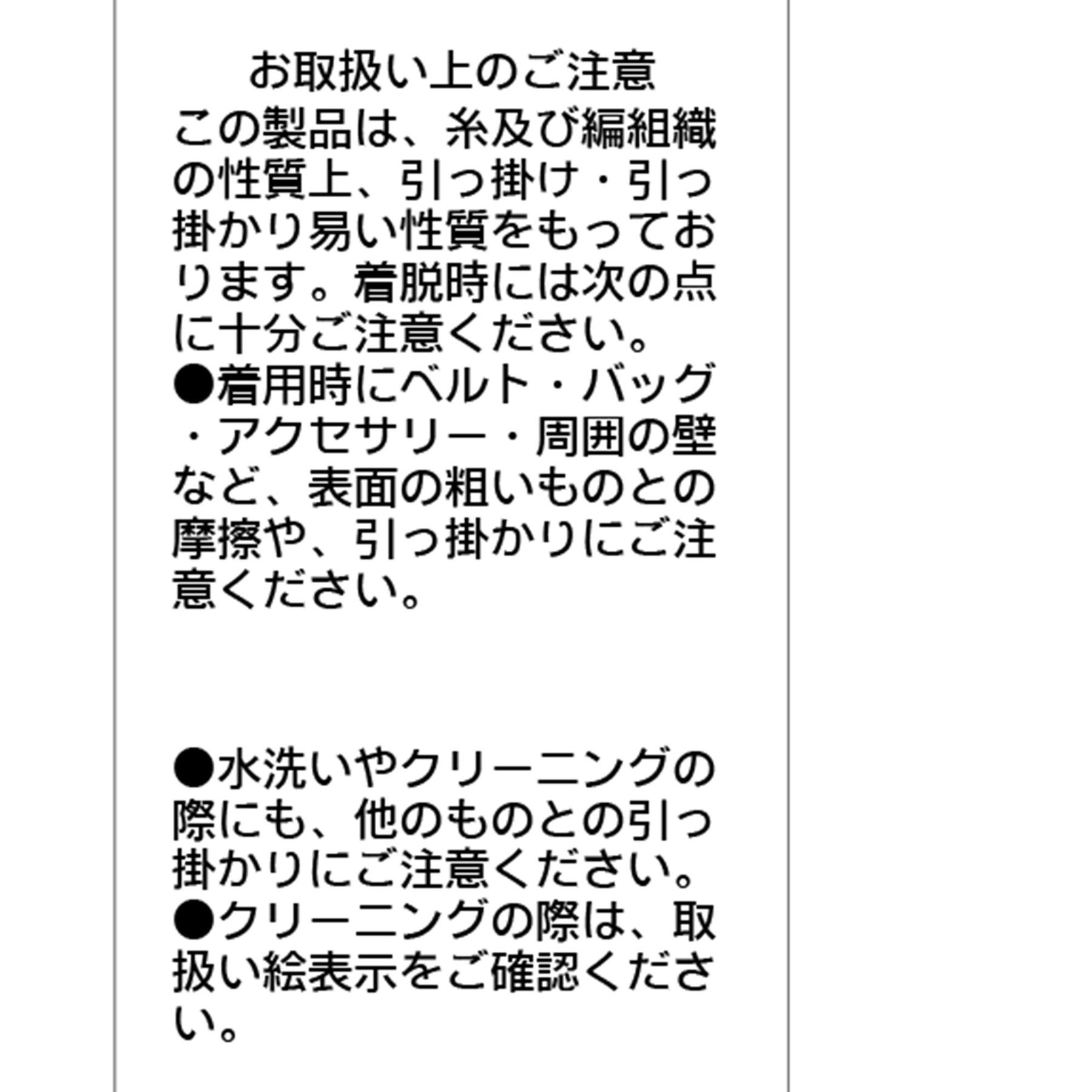 ・水洗いやクリーニングの際にも、他のものとの引っ掛かりにご注意ください。