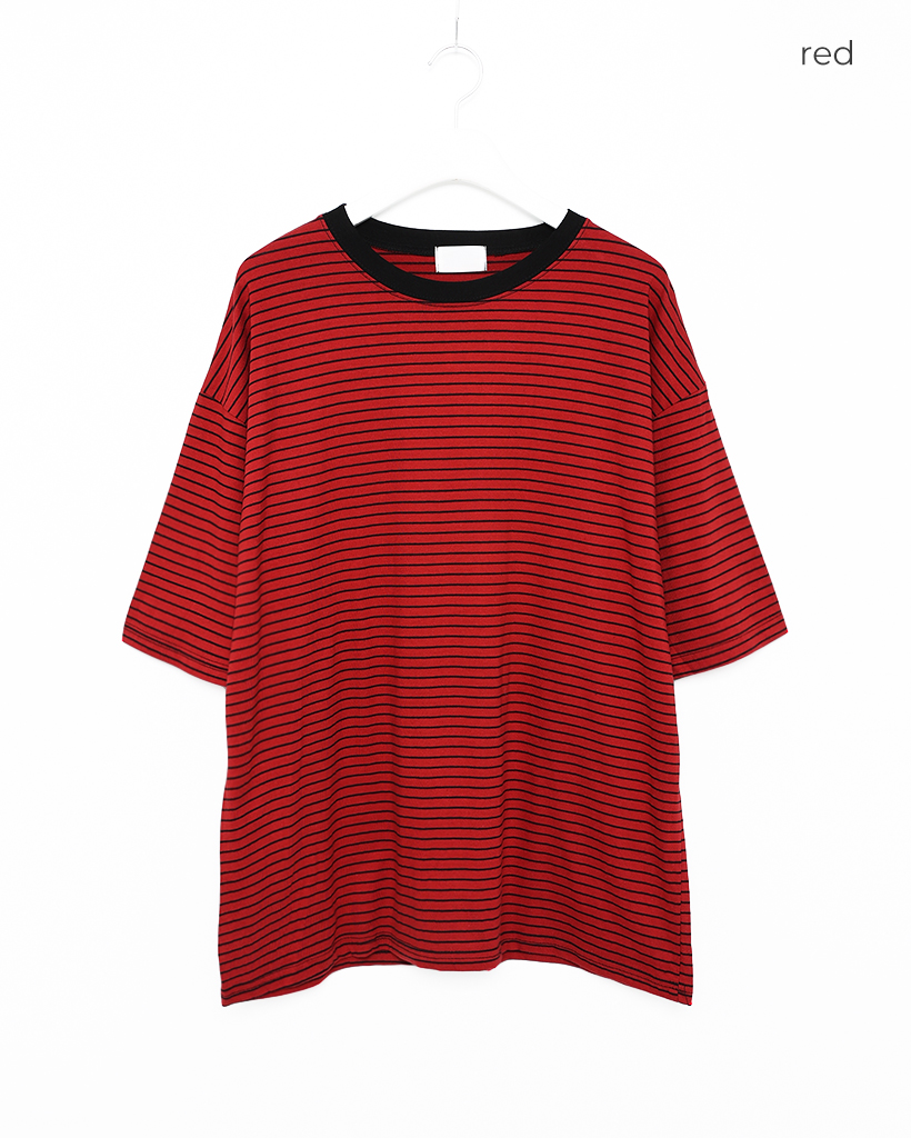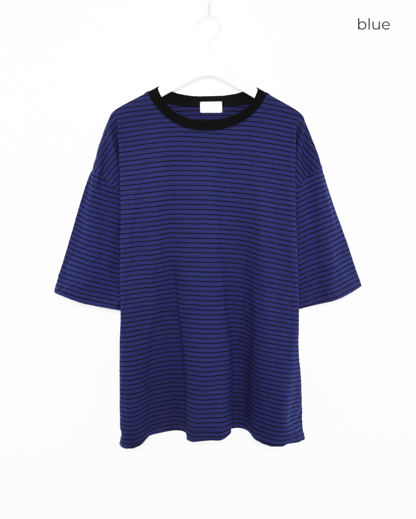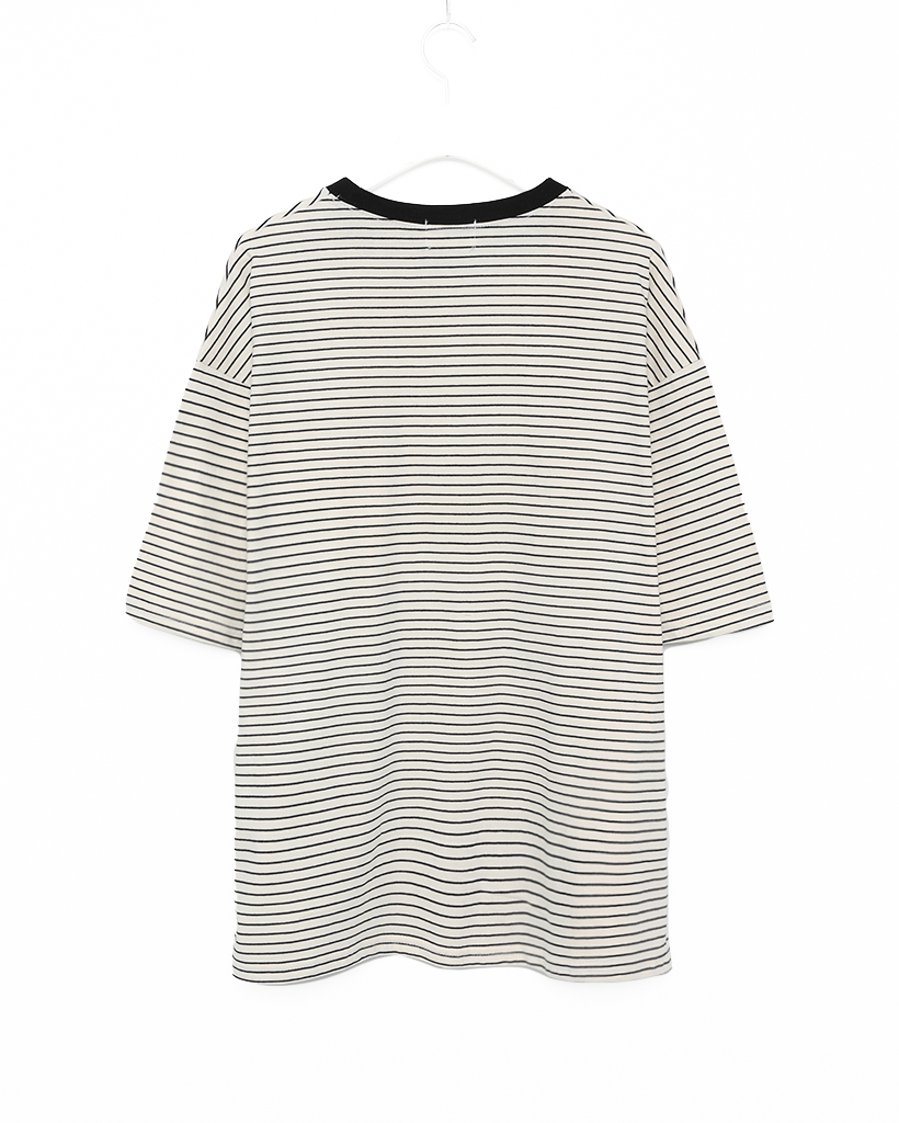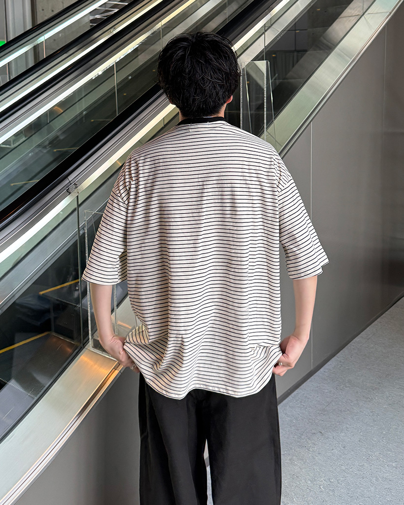 (ユニセックス)ボーダーリンガーネックハーフスリーブT