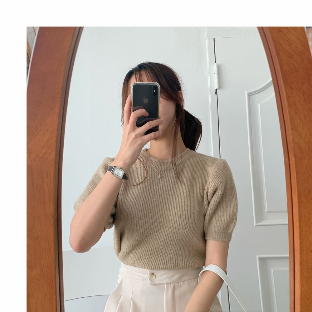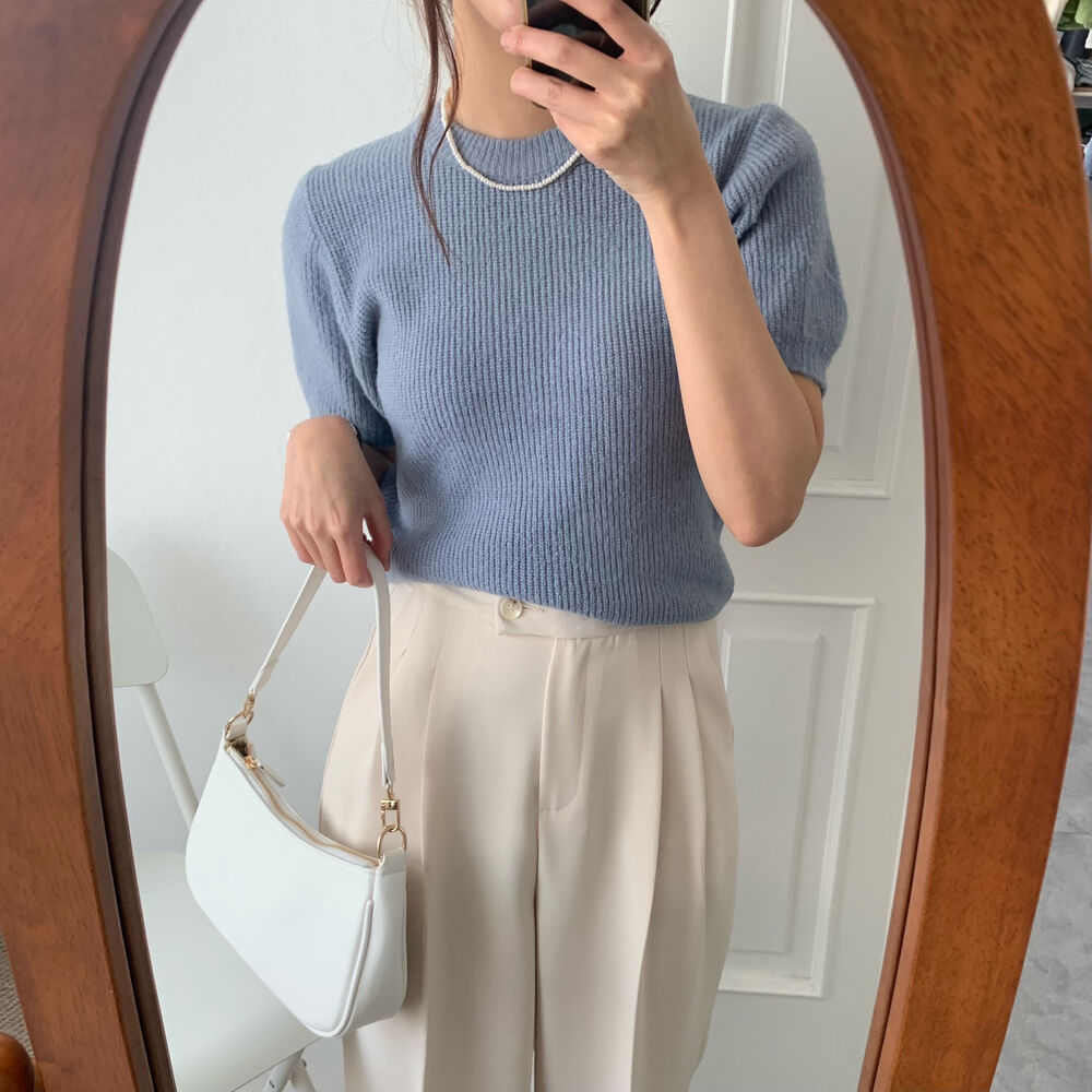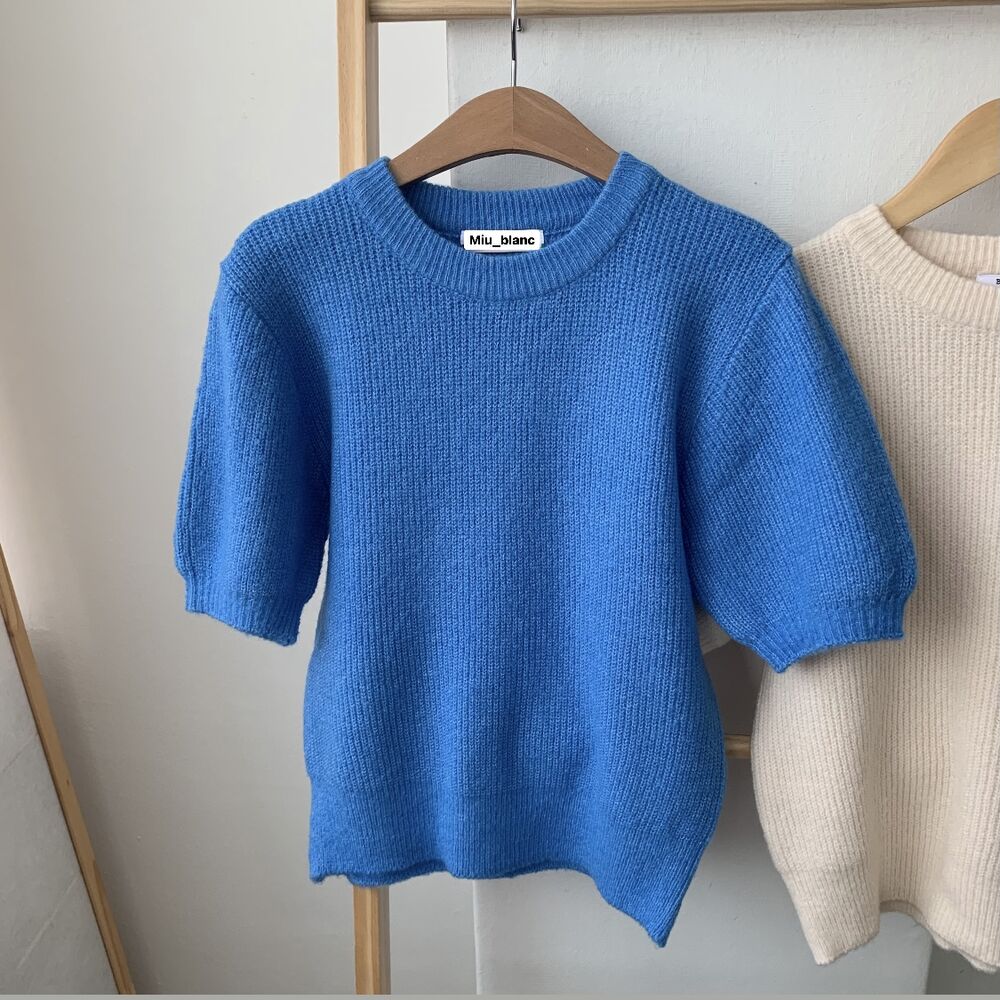 [やわらかい気心地/韓国生産] ローリング パフ ラウンド 半袖 ニット