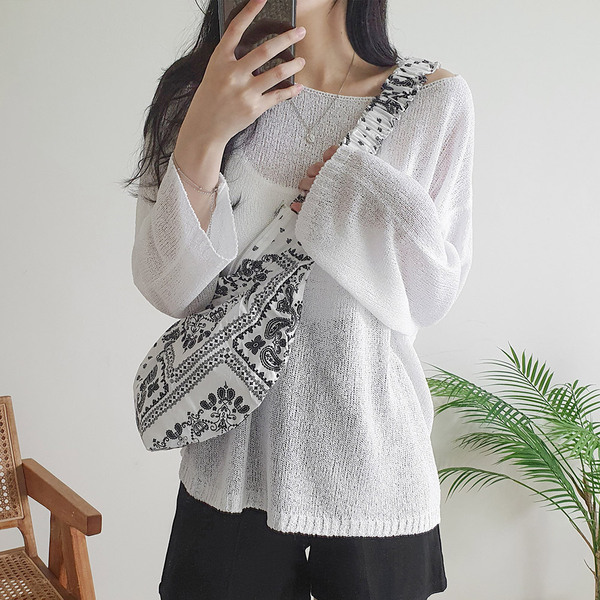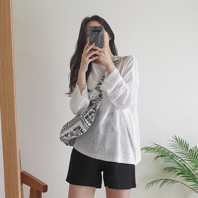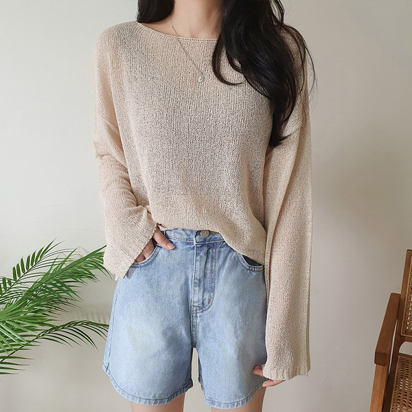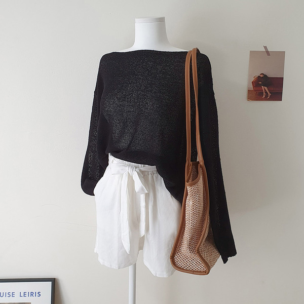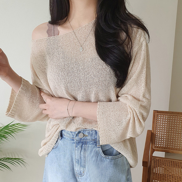 ボートネックブークレ長袖ネットセーター5color