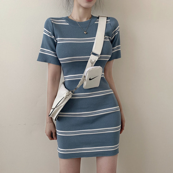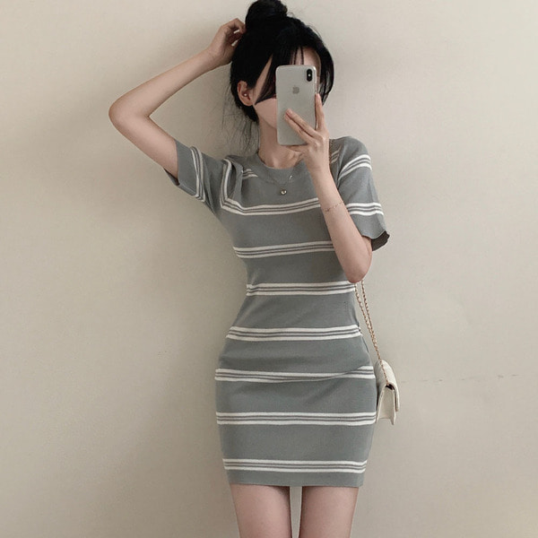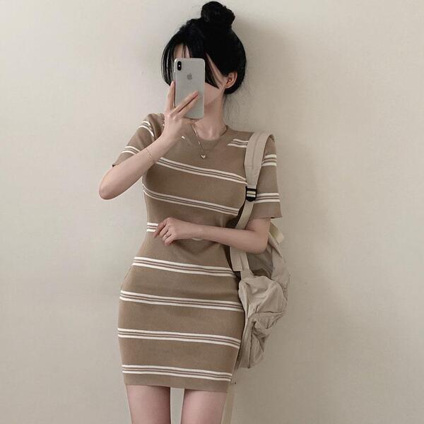 Women's/ラウンドショートスリーブ ニット Hライン ミニドレス