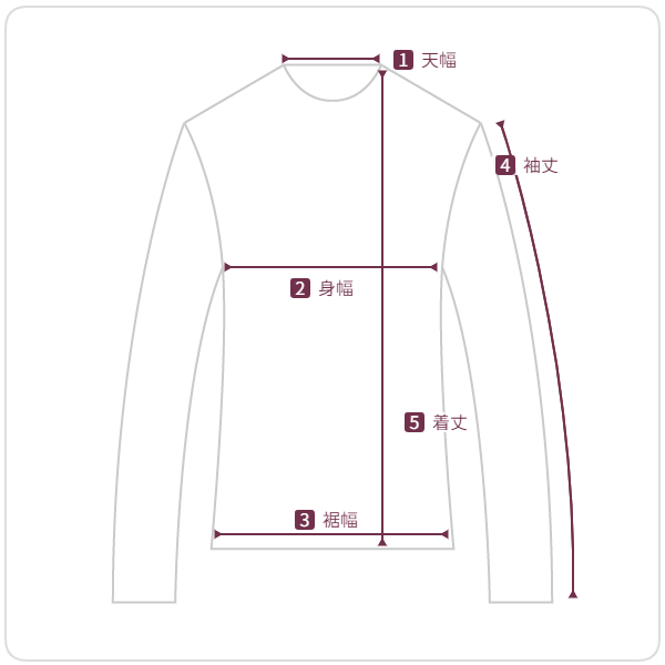 5 着丈 | 43 17 | 45 17.5 | 47 18.5 |