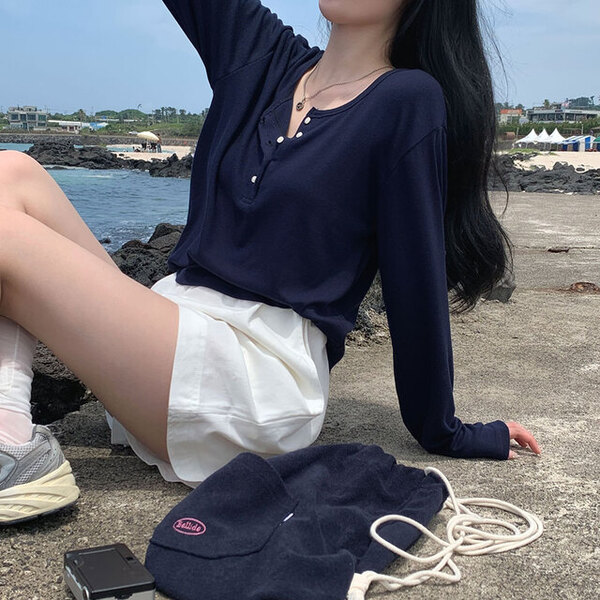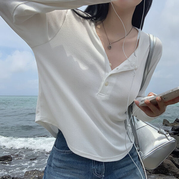 (ORIGINAL) ひらひら、リブオープンボタンTシャツ