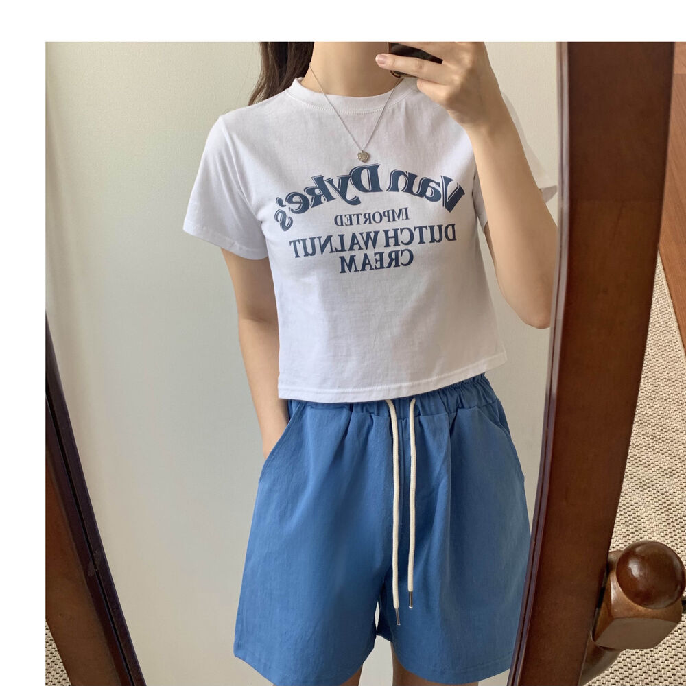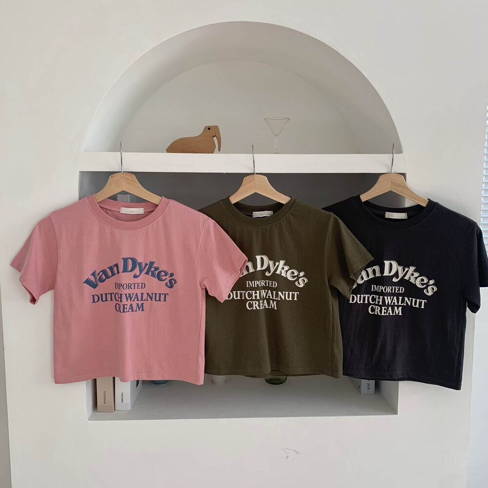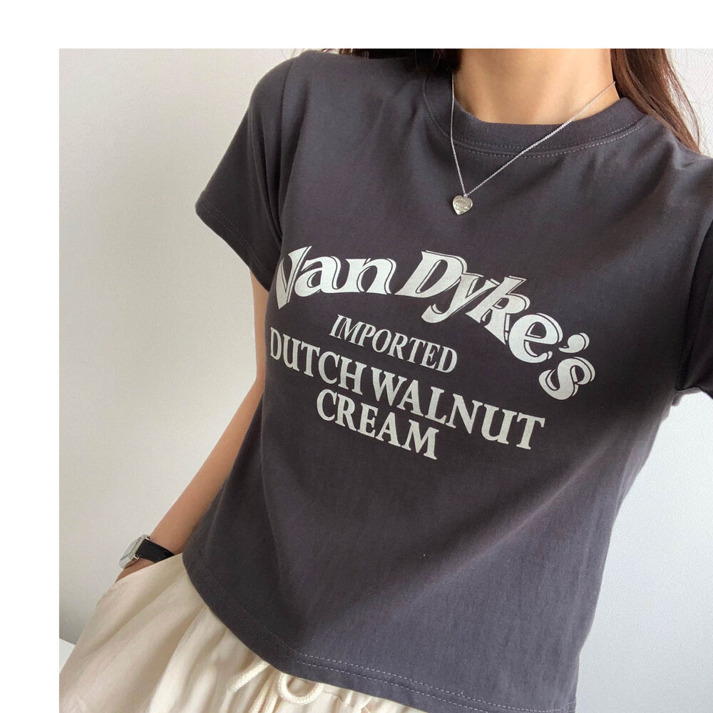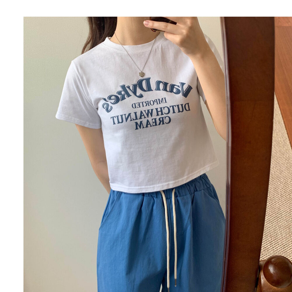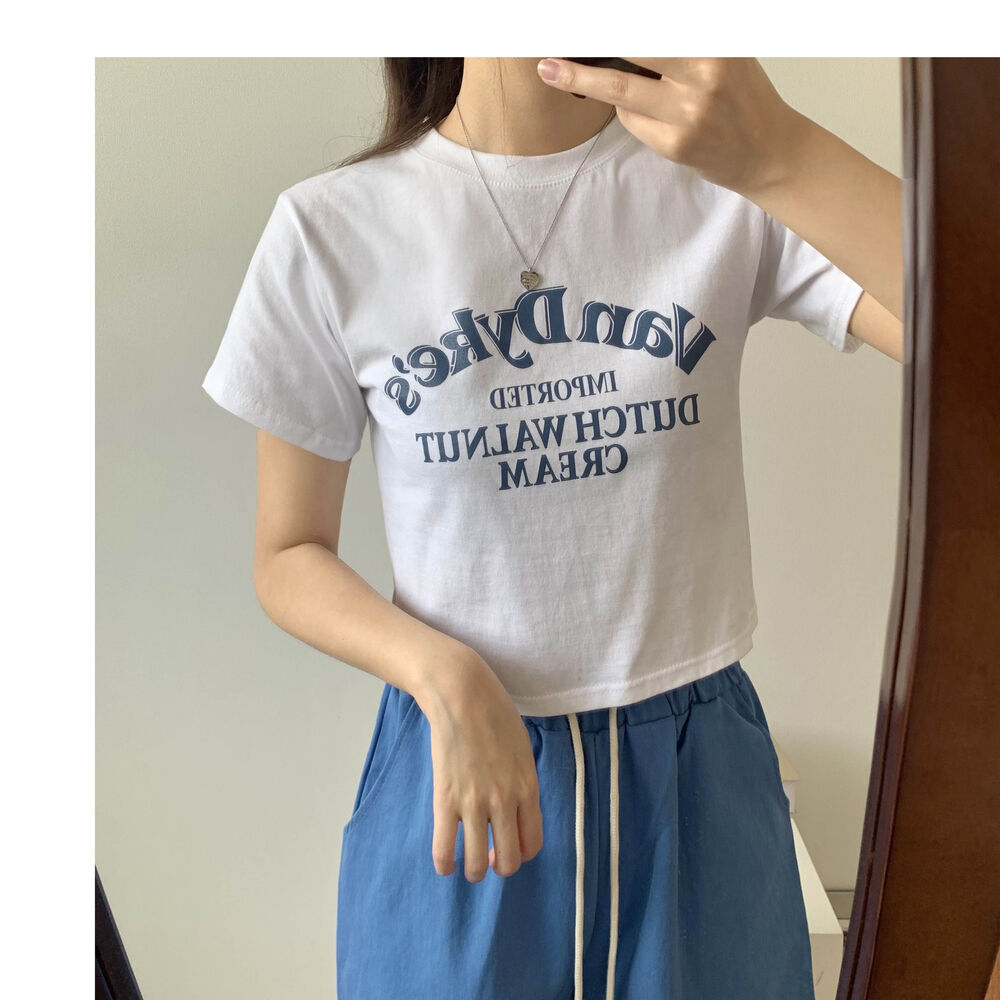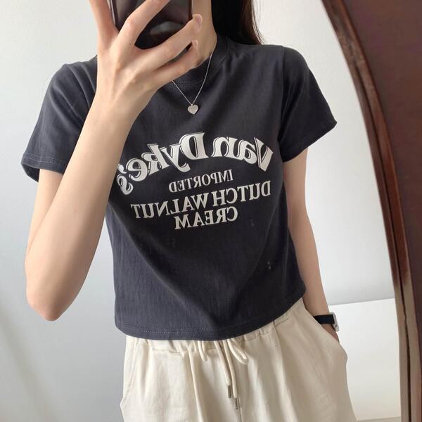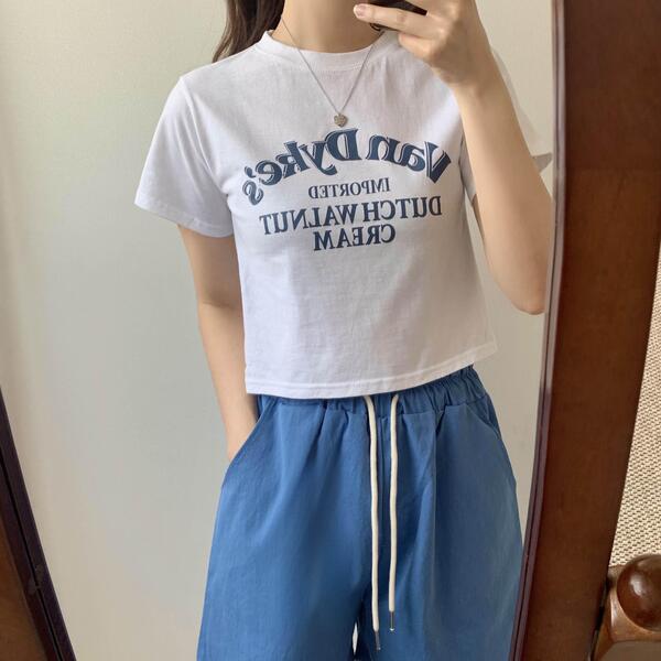 Y2Kクロップドレタリングクリーム半袖Tシャツ