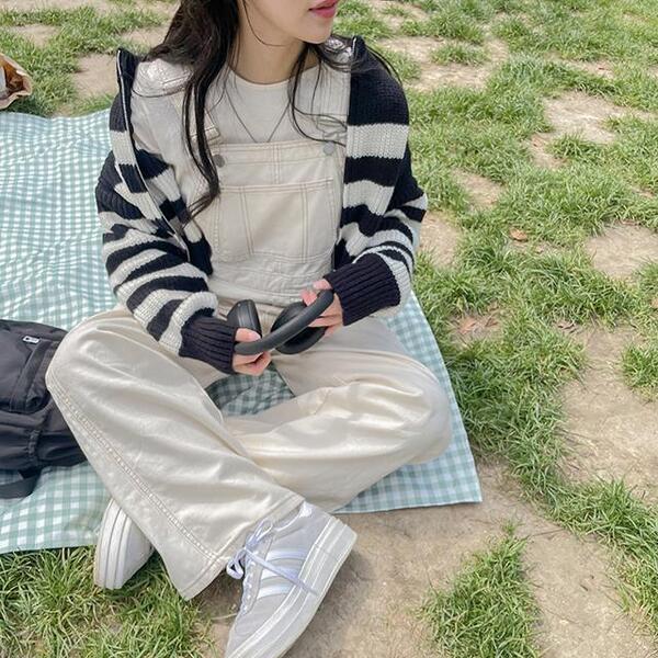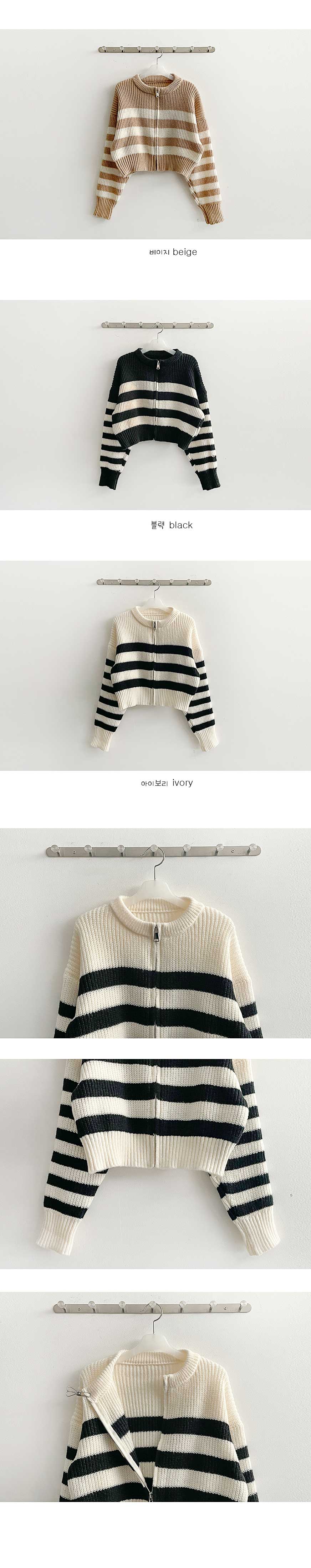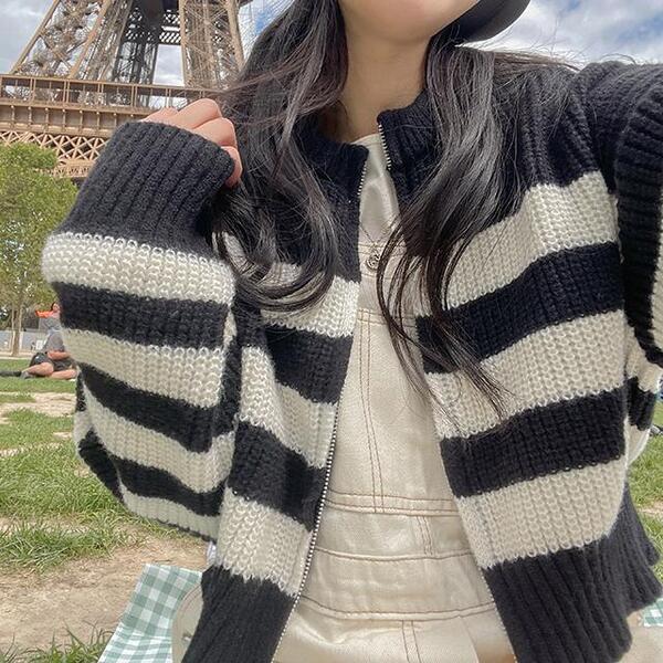 Qninストライプボーダー柄ニットジップアップカーディガン