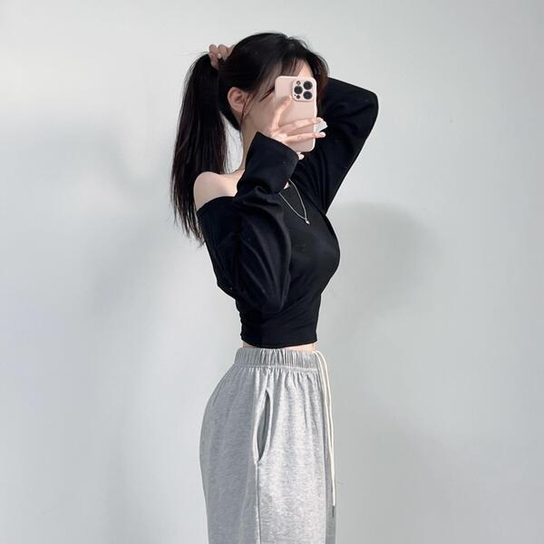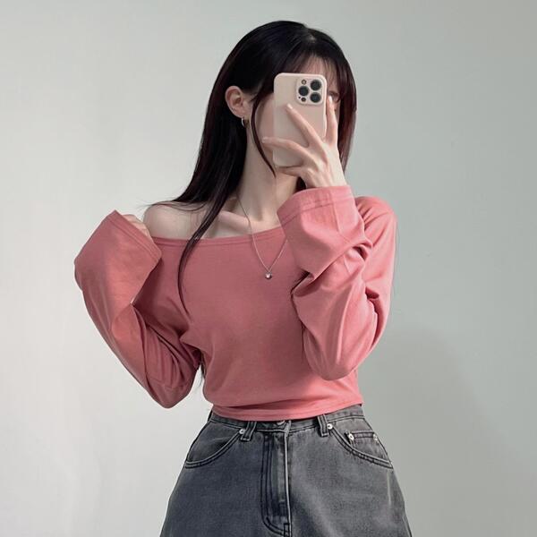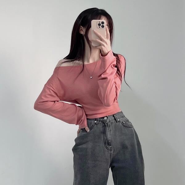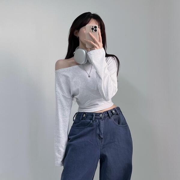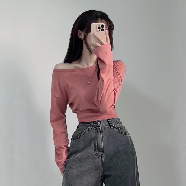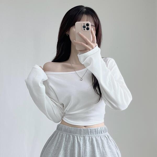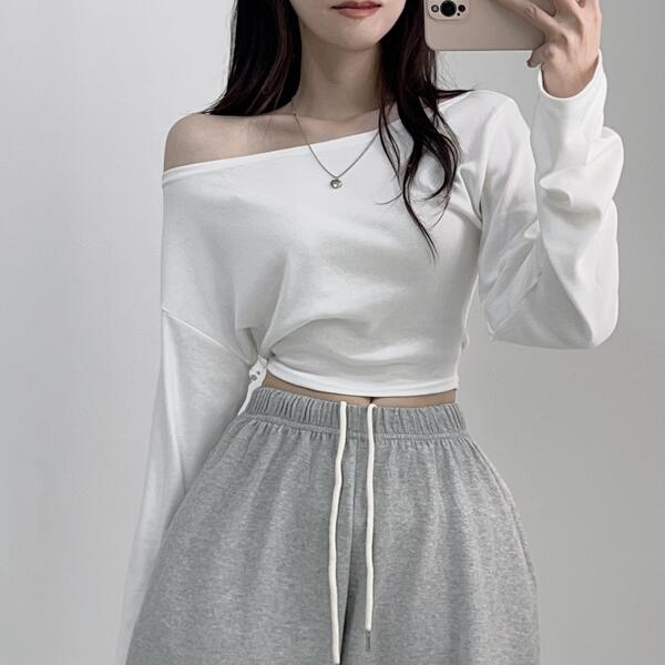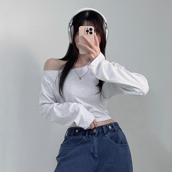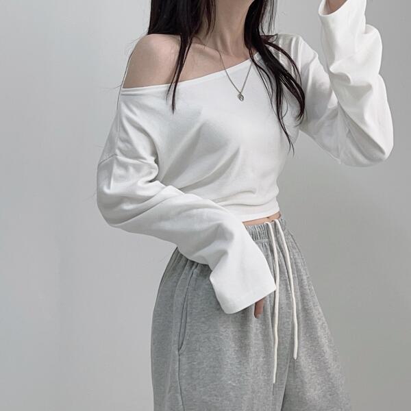 アンバランス斜めクロップドオフショルダー長袖Tシャツ(7 color)