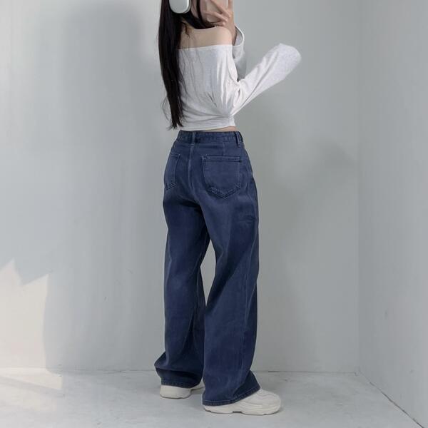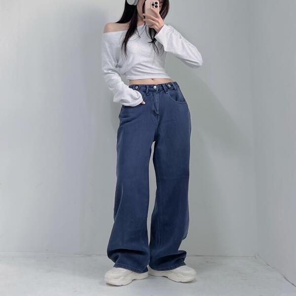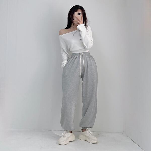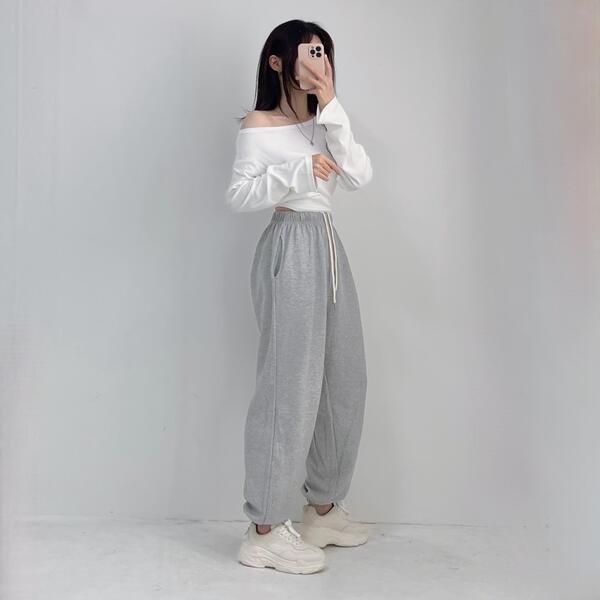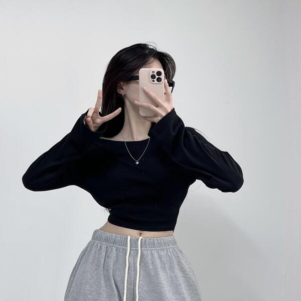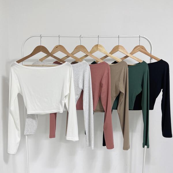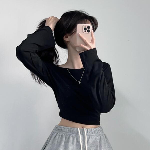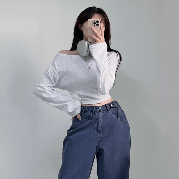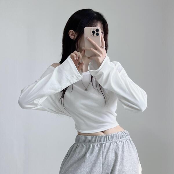 アンバランス斜めクロップドオフショルダー長袖Tシャツ(7 color)