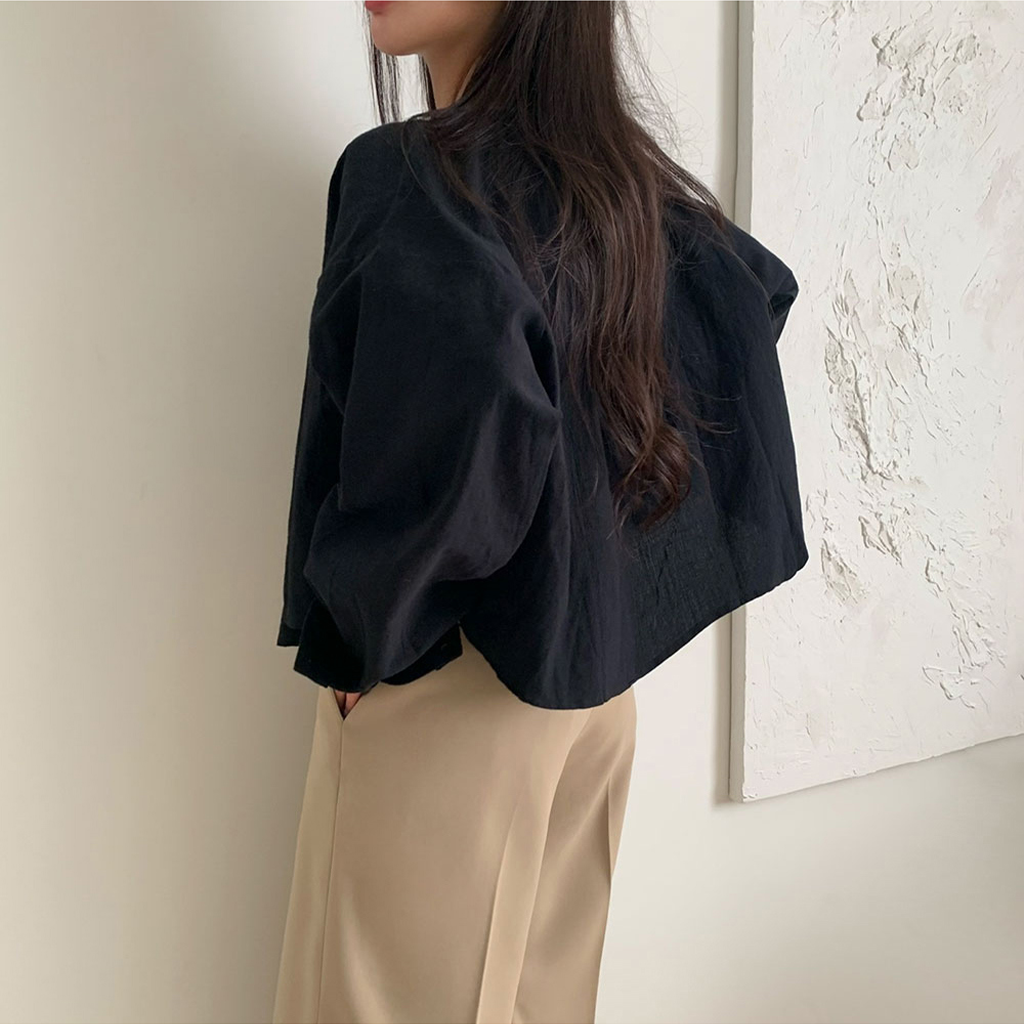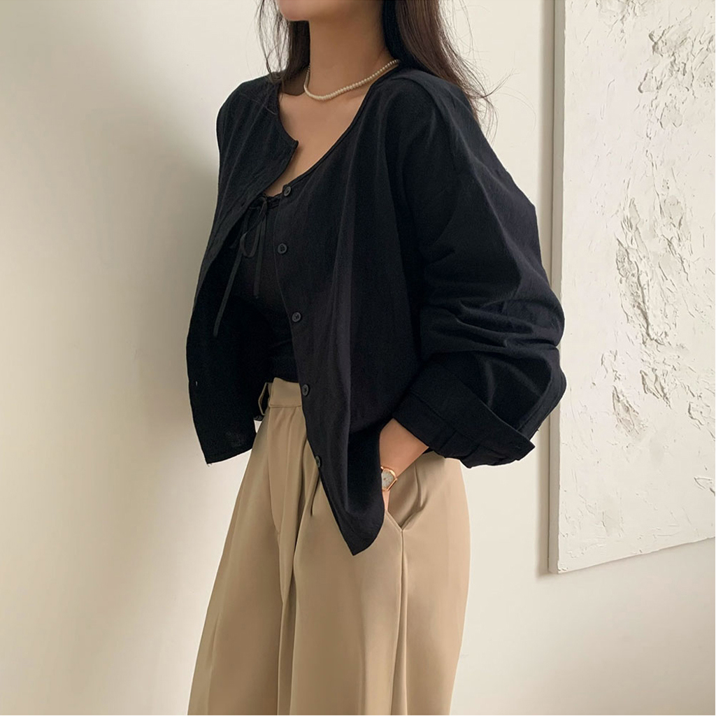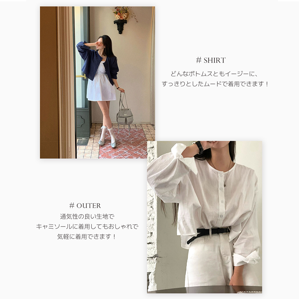 - カラーのないすっきりとしたノーカラーデザインでカーディガンのように薄いアウターで着やすいです!