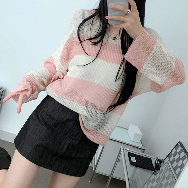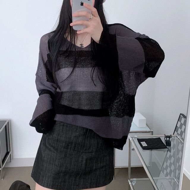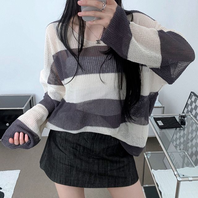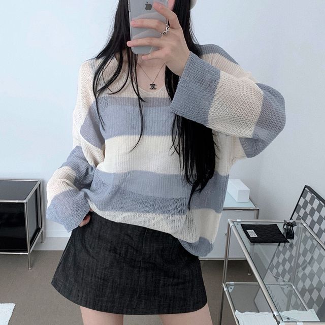ルーズフィットストライプVネックシースルーニット