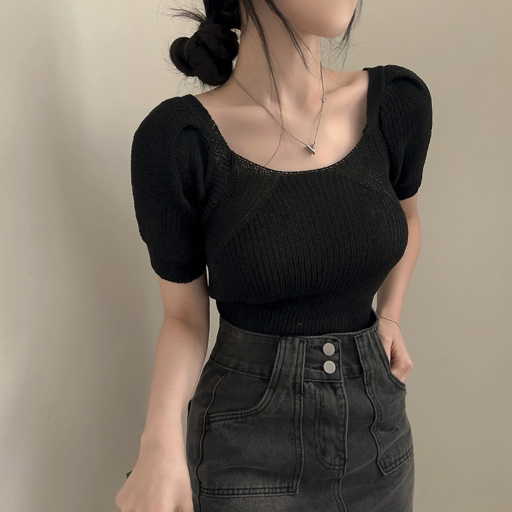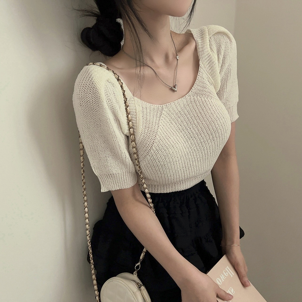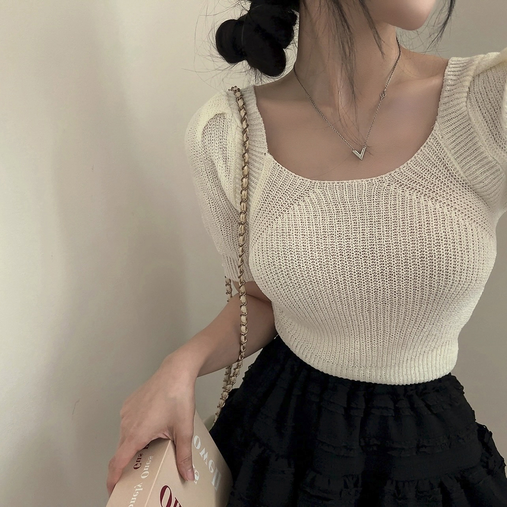 バッグリボンスリットスクエアネック半袖ニット