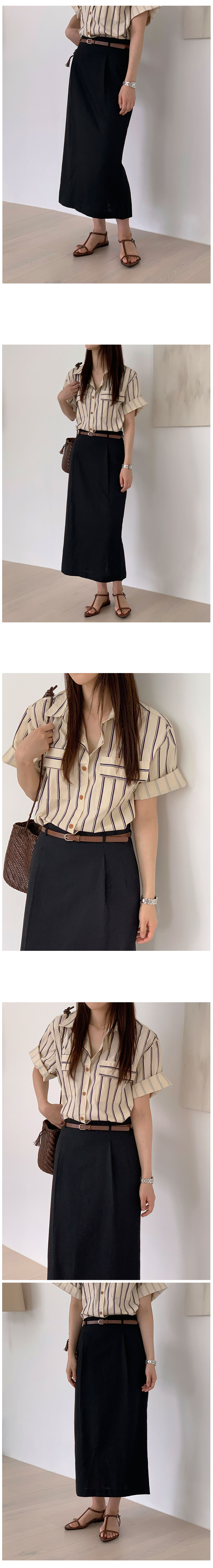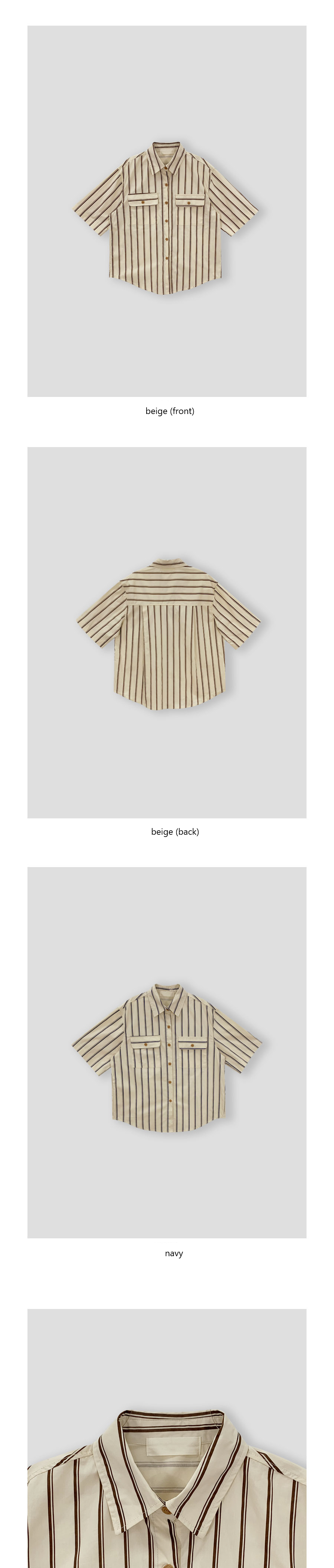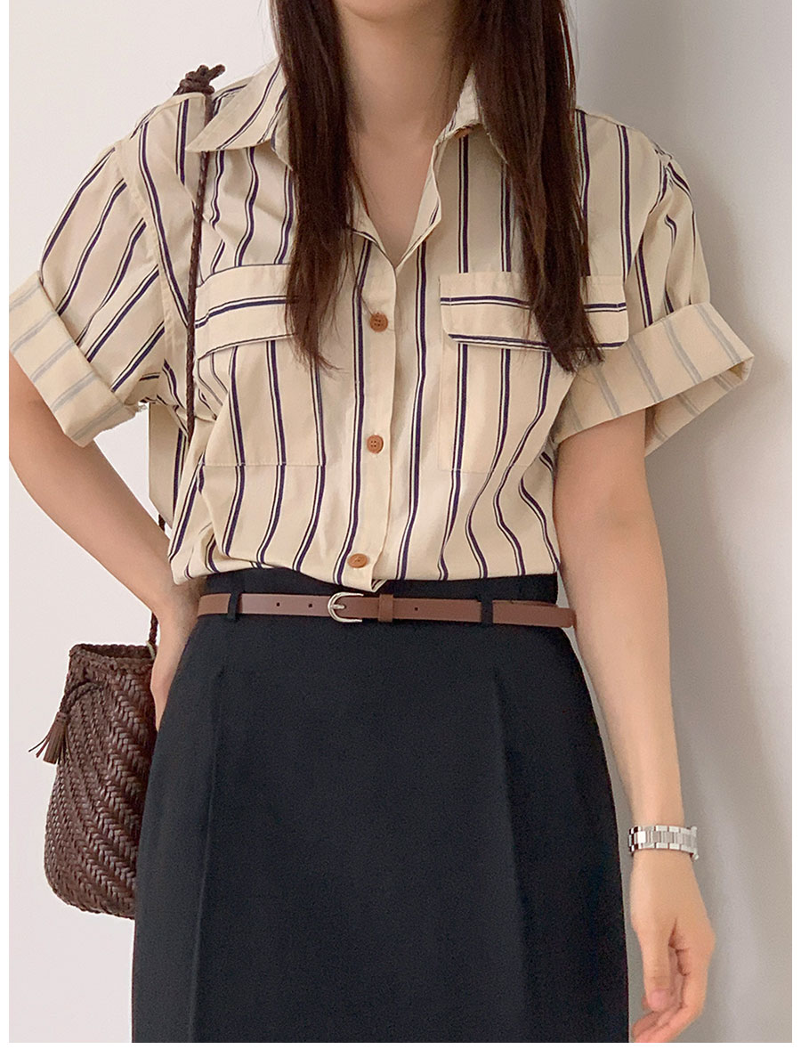 ルーズフィットストライプポケット夏半袖ロールアップシャツ2color