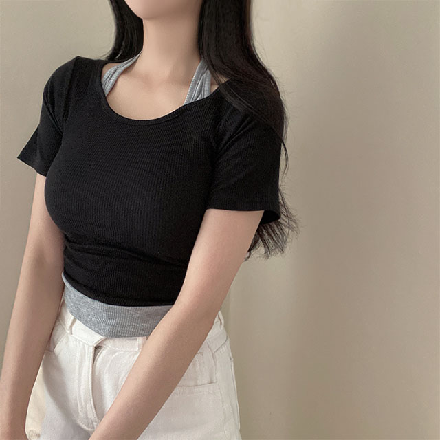 ホルターサイドシャーリングリブスリム半袖Tシャツ