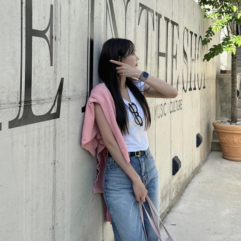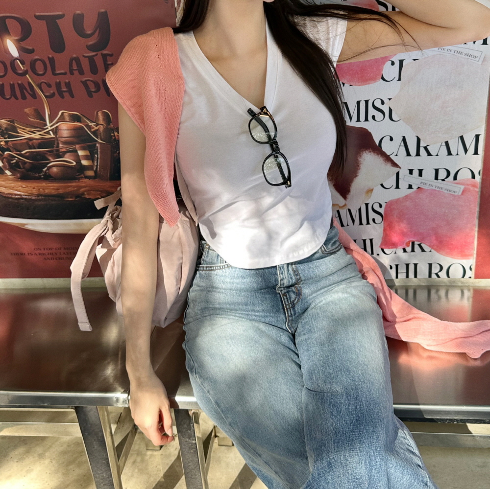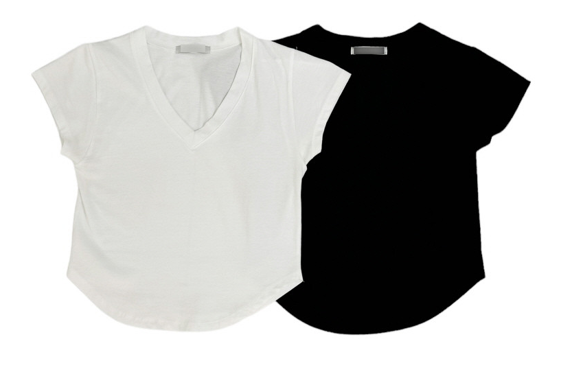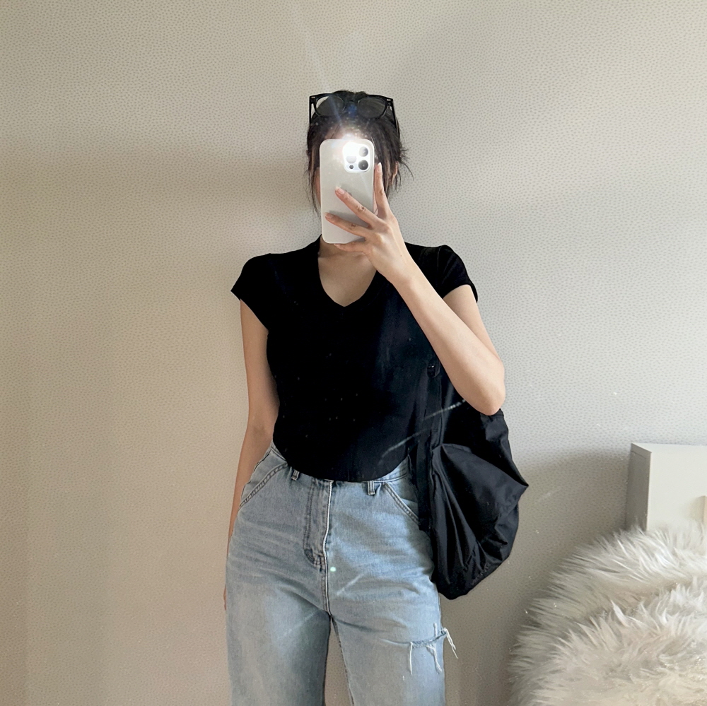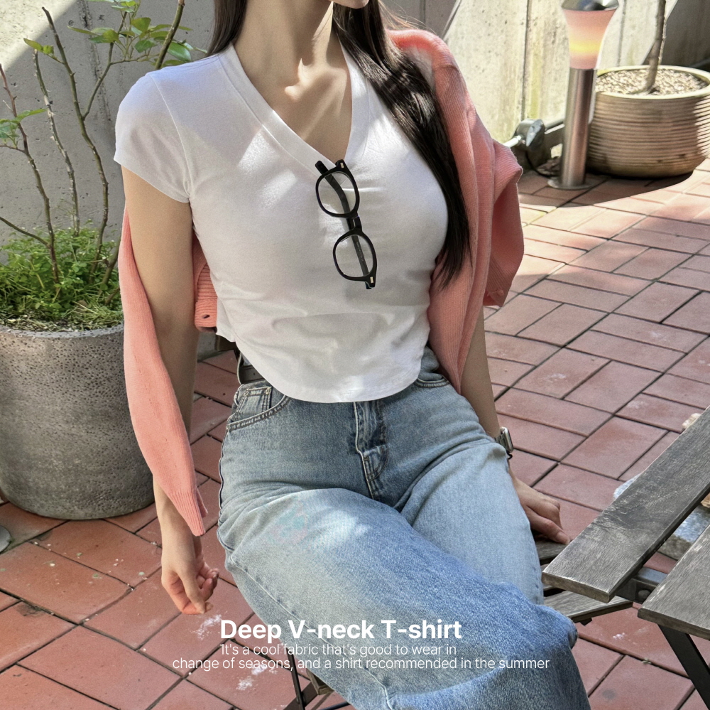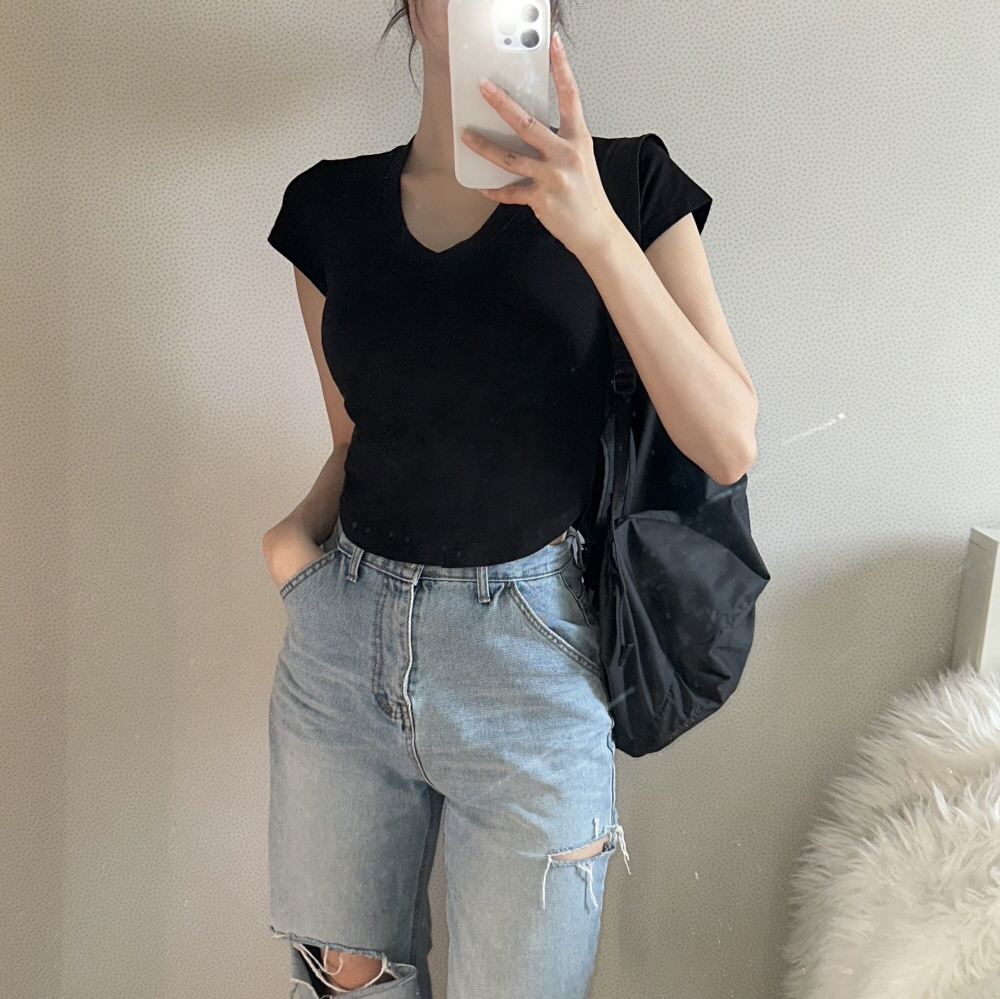 Vネックベーシックセミクロップド半袖Tシャツ2color