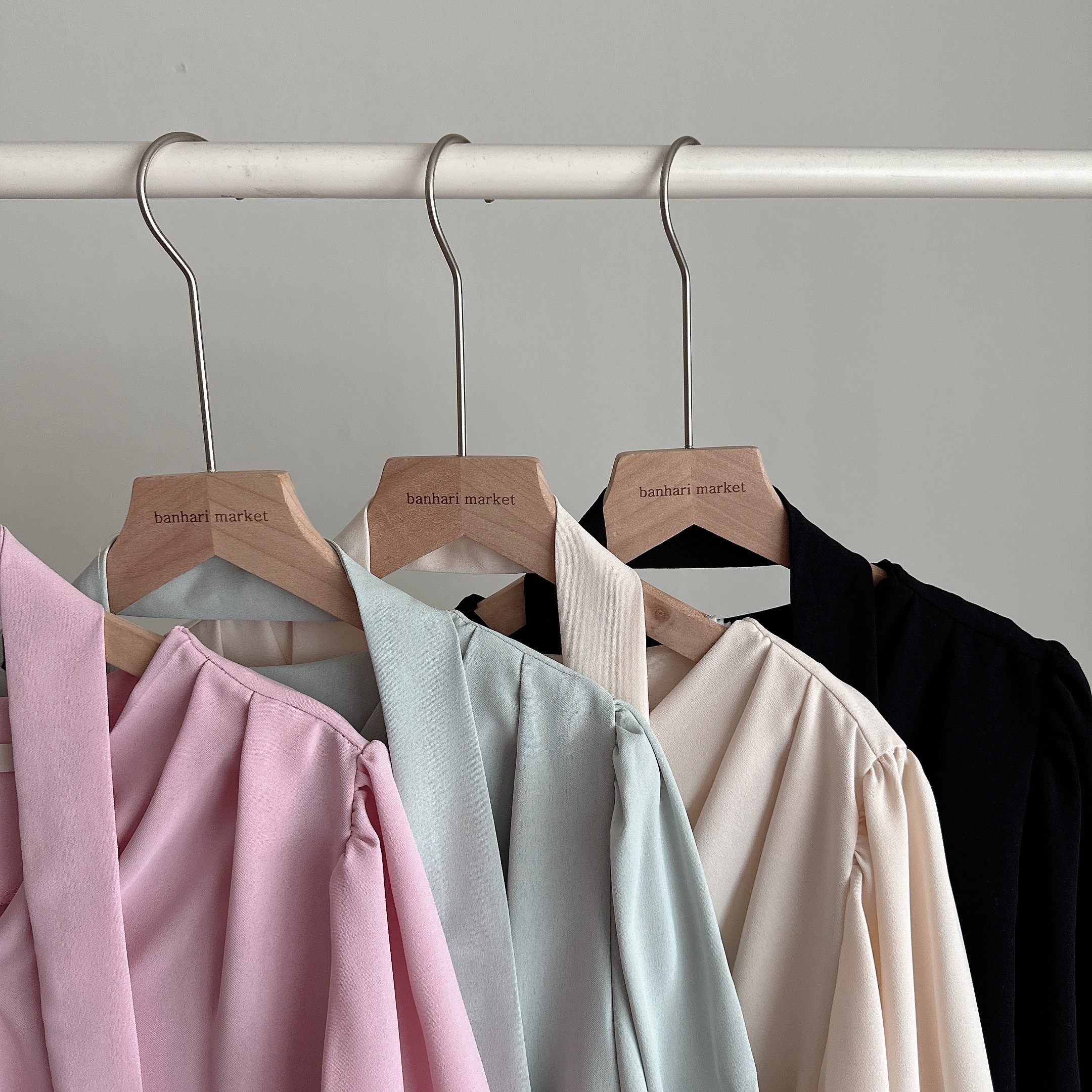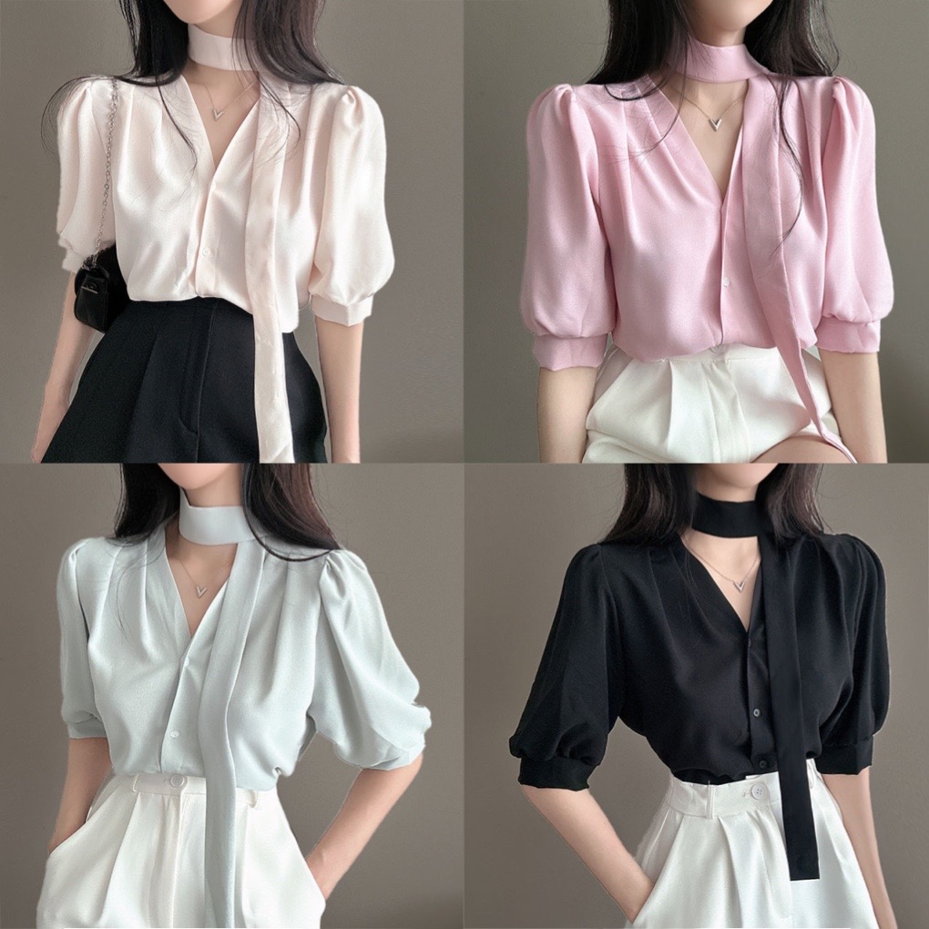 [タイセット] Vネックシャーリングパフ無地半袖ブラウス