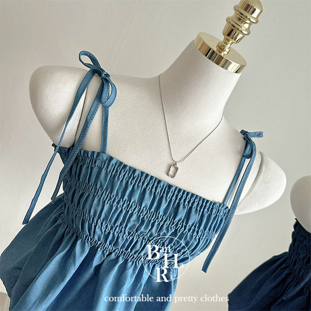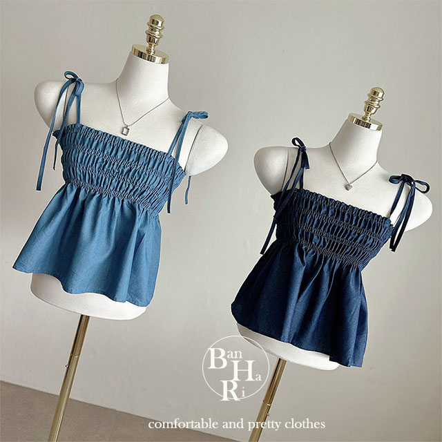 クロップドデニム肩リボンシャーリングゴムキャミソールブラウス