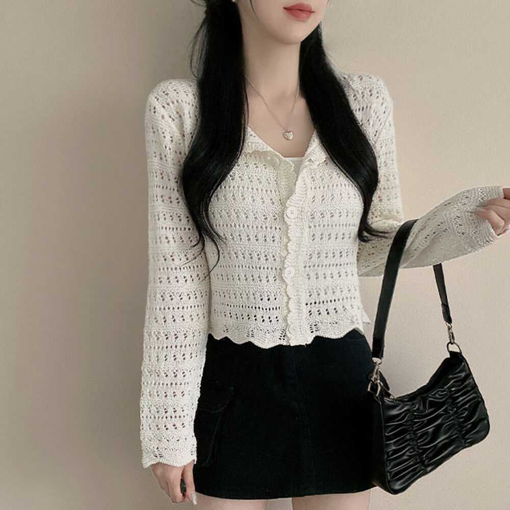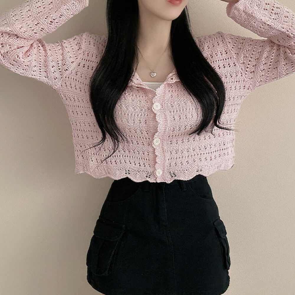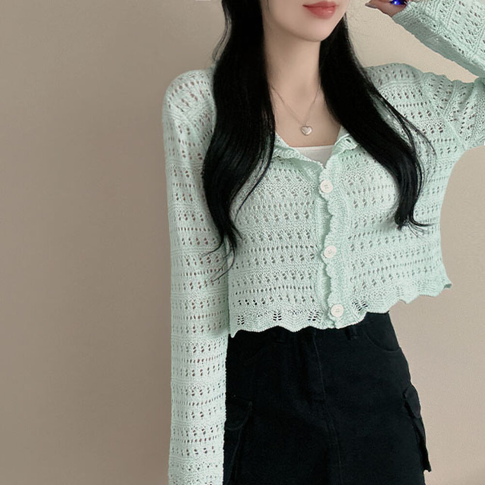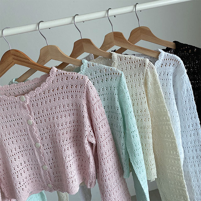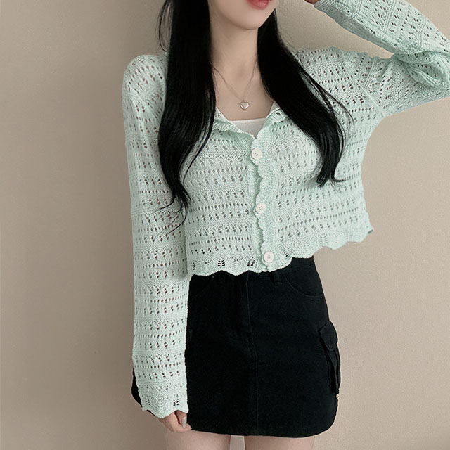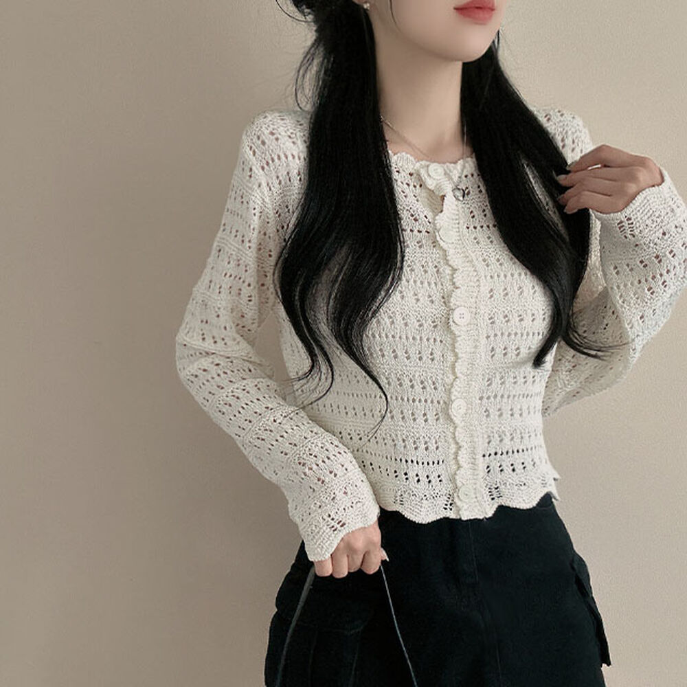 サマーウェーブラウンドクロップド長袖ニットカーディガン