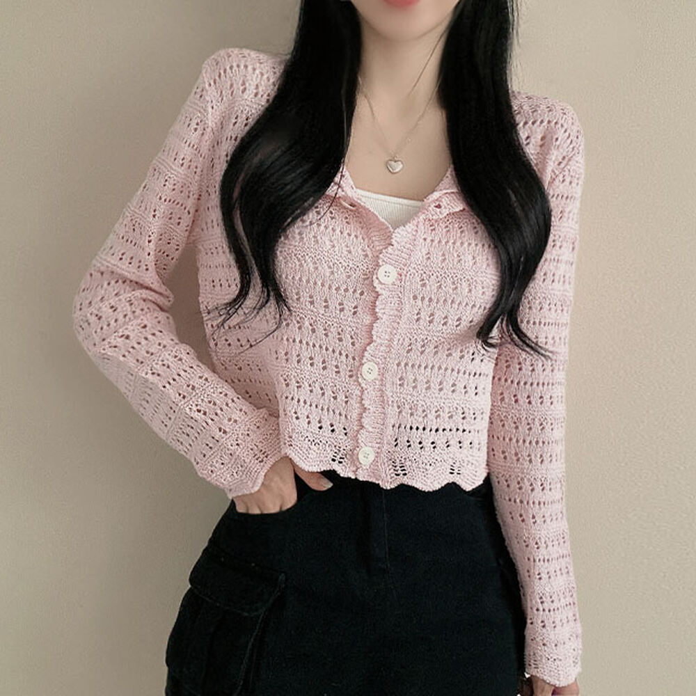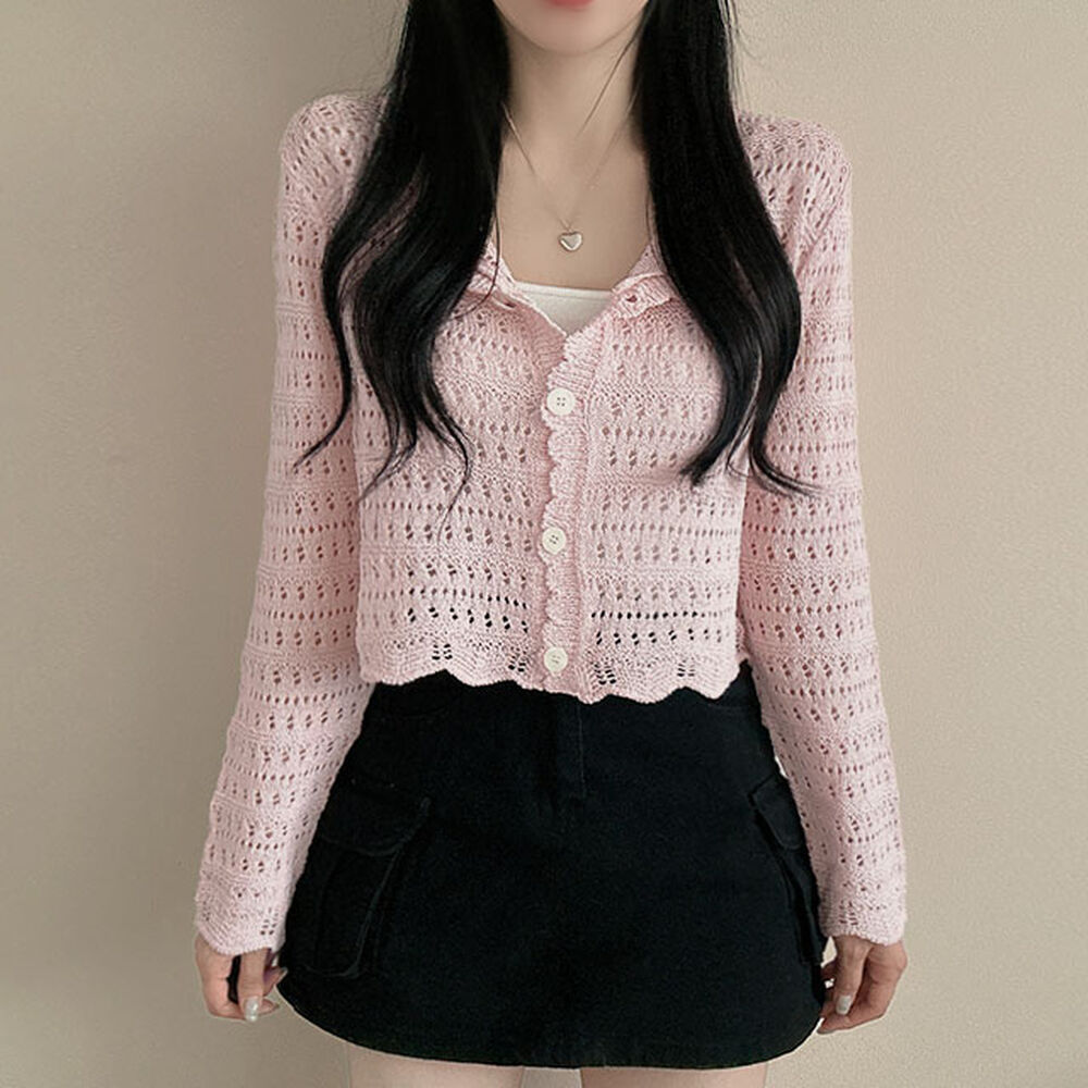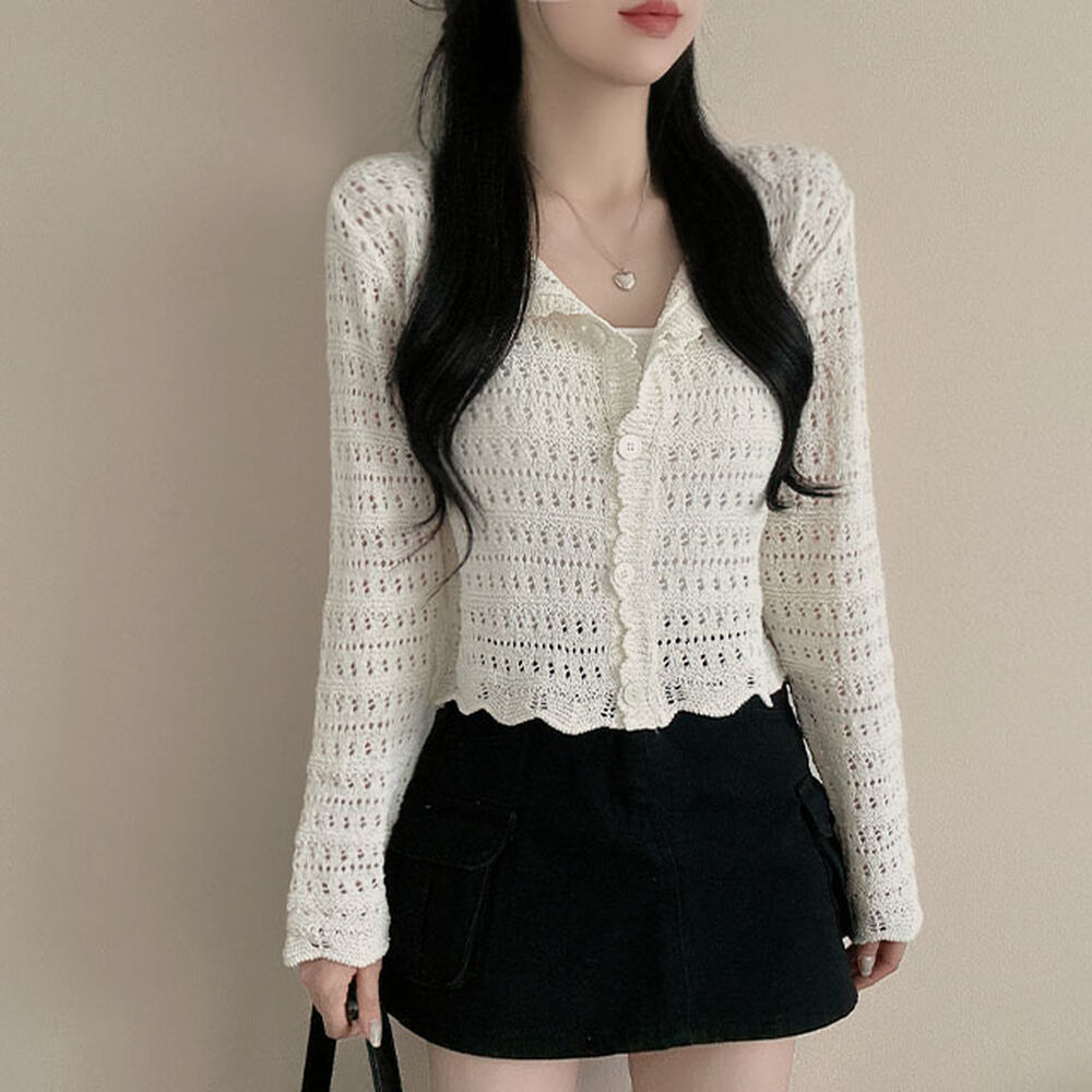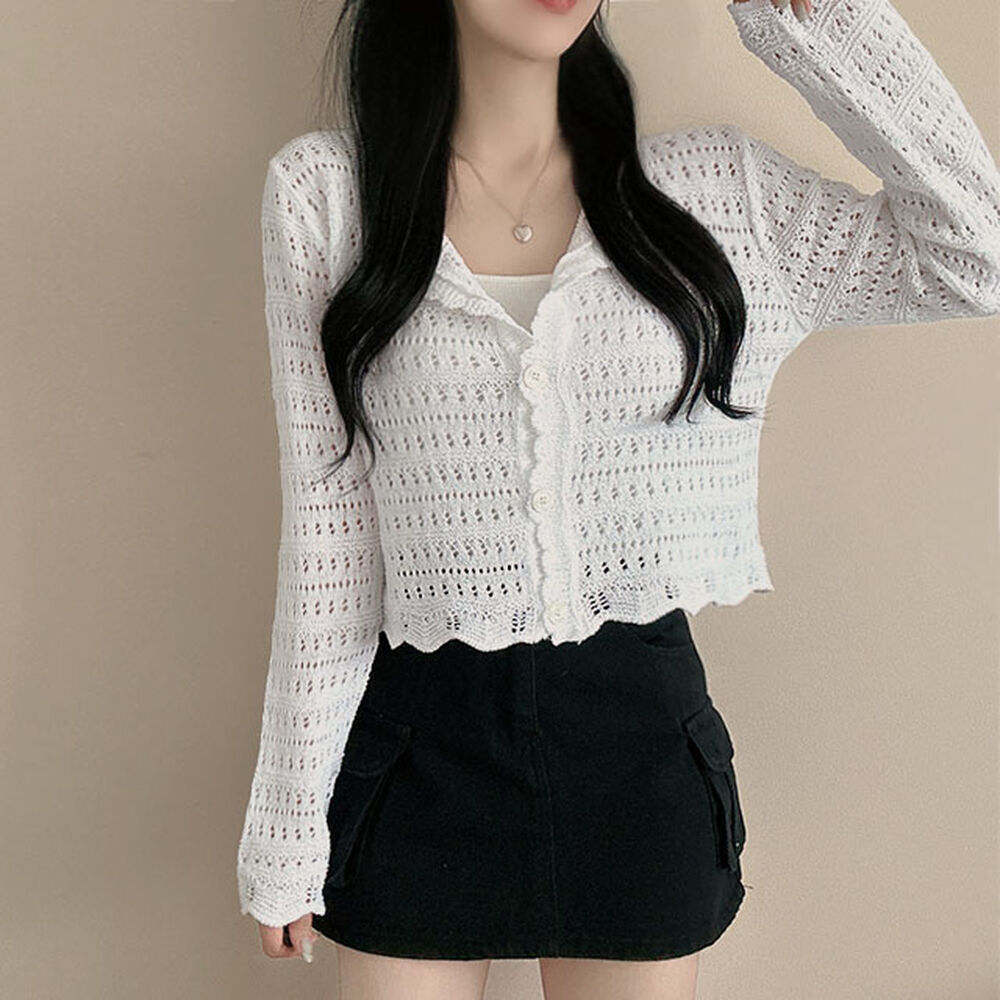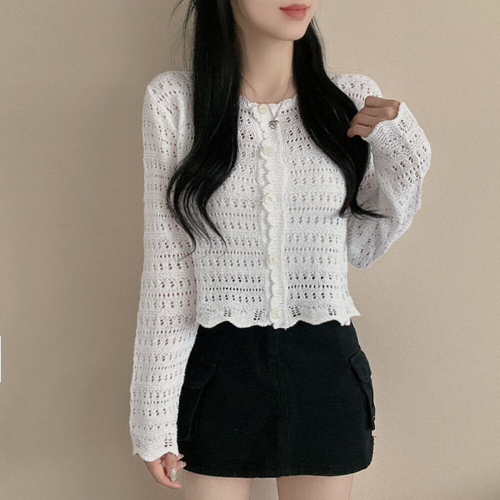 サマーウェーブラウンドクロップド長袖ニットカーディガン