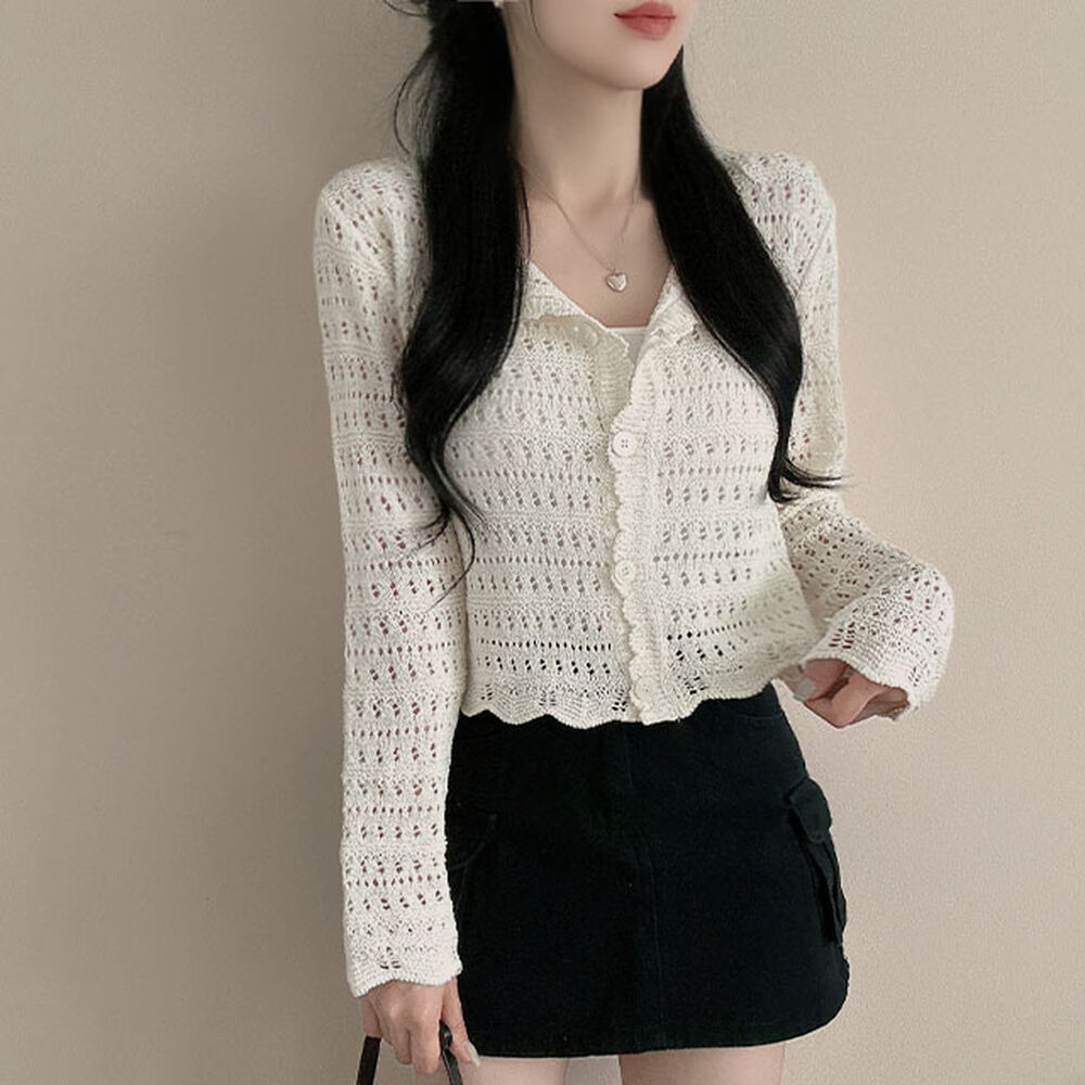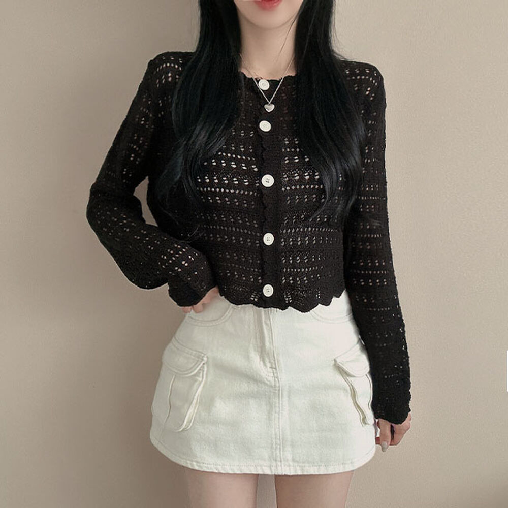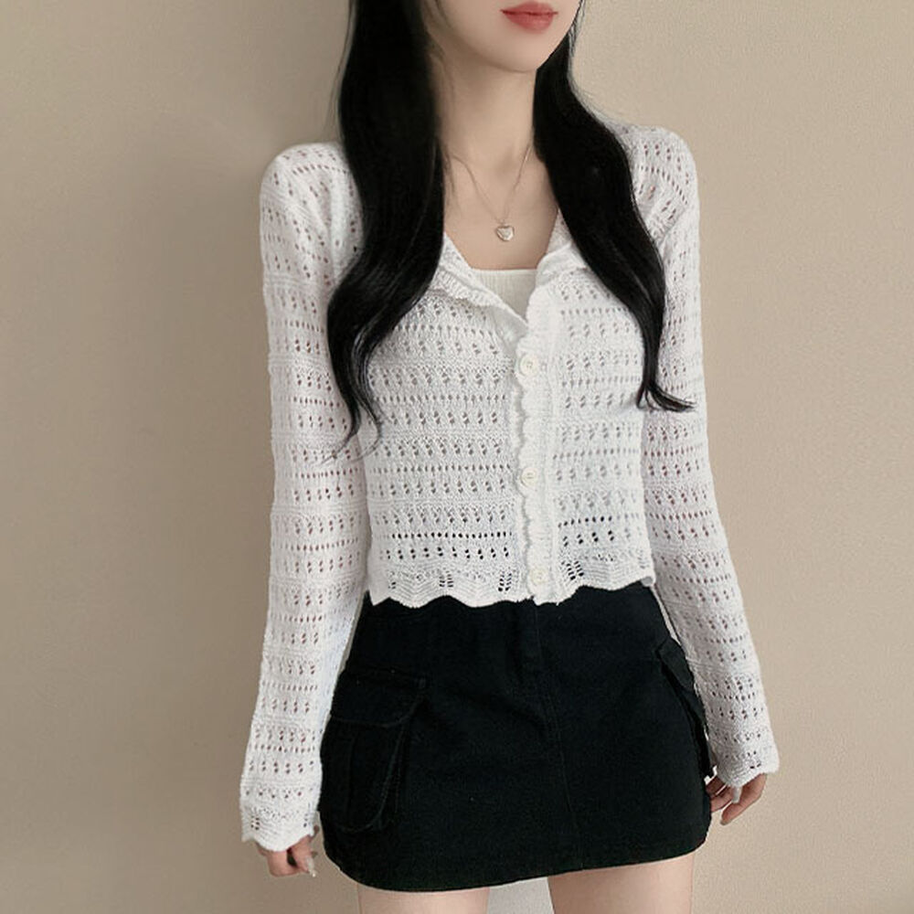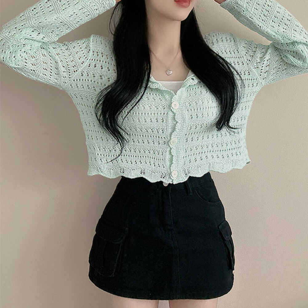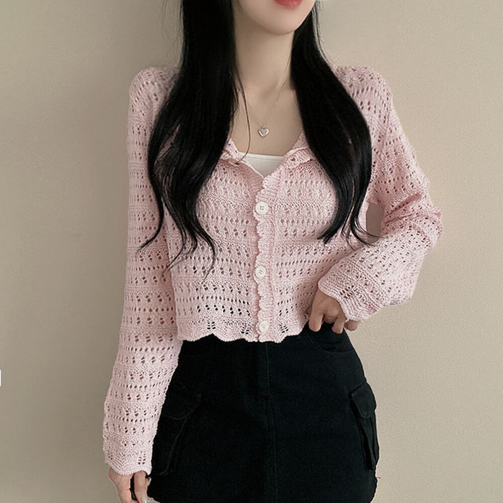 サマーウェーブラウンドクロップド長袖ニットカーディガン