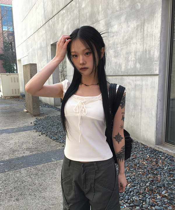 [コーデおすすめ] フレンチパフスリーブレイヤードホルターリボンTシャツ (3color)