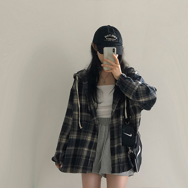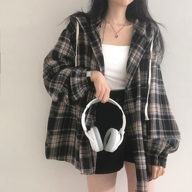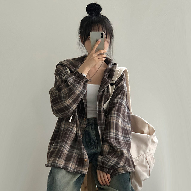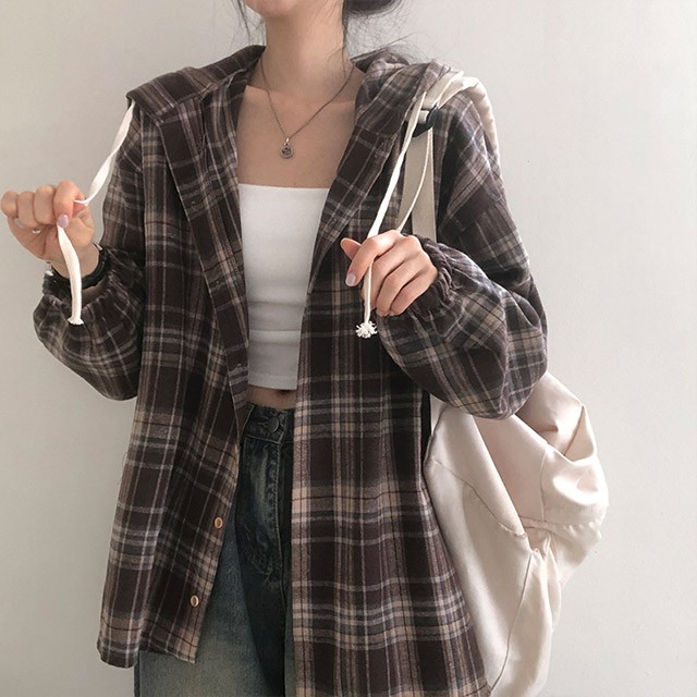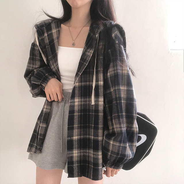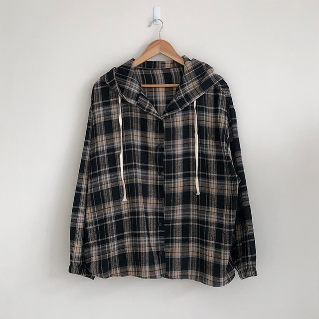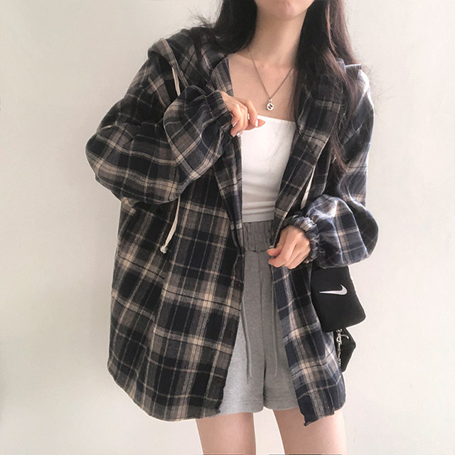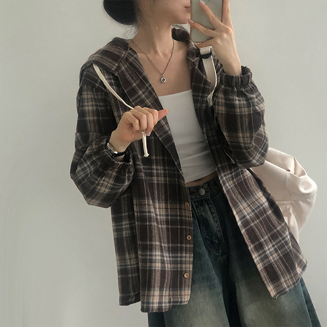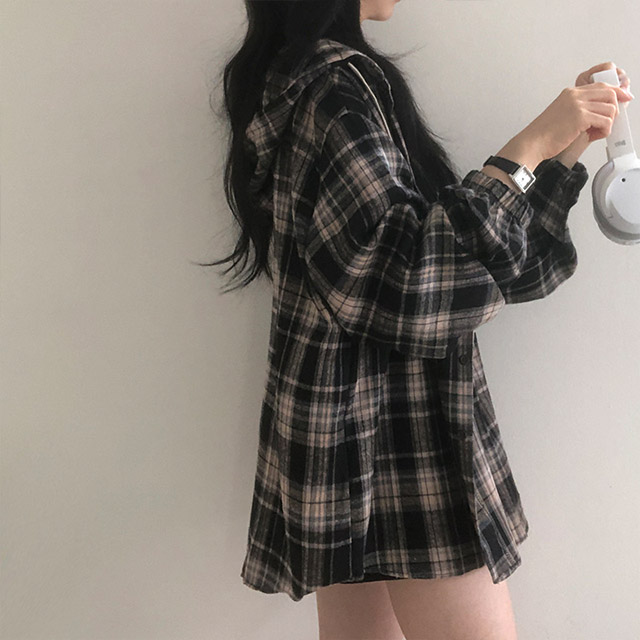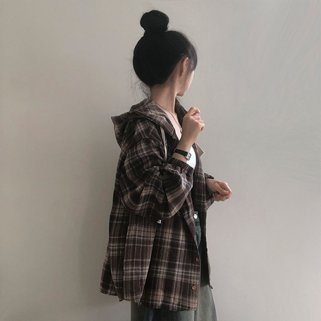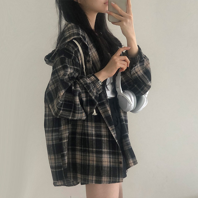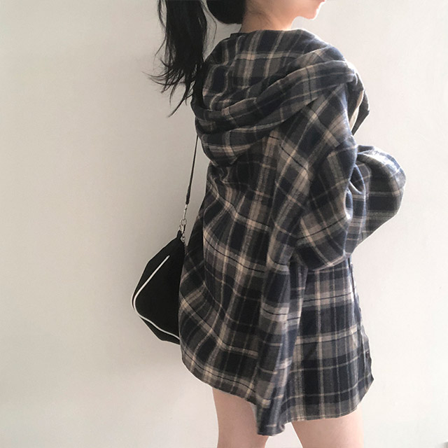 [3color]カジュアル秋ルーズチェックフード付きシャツ