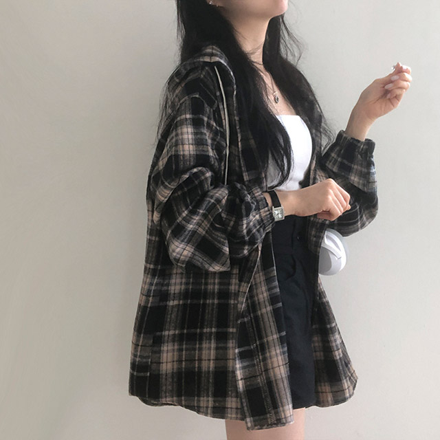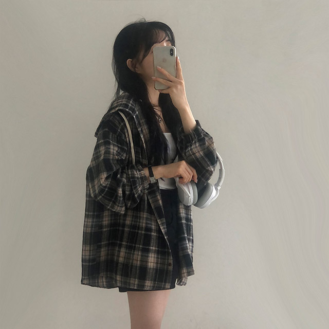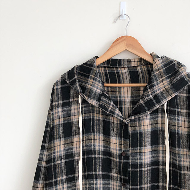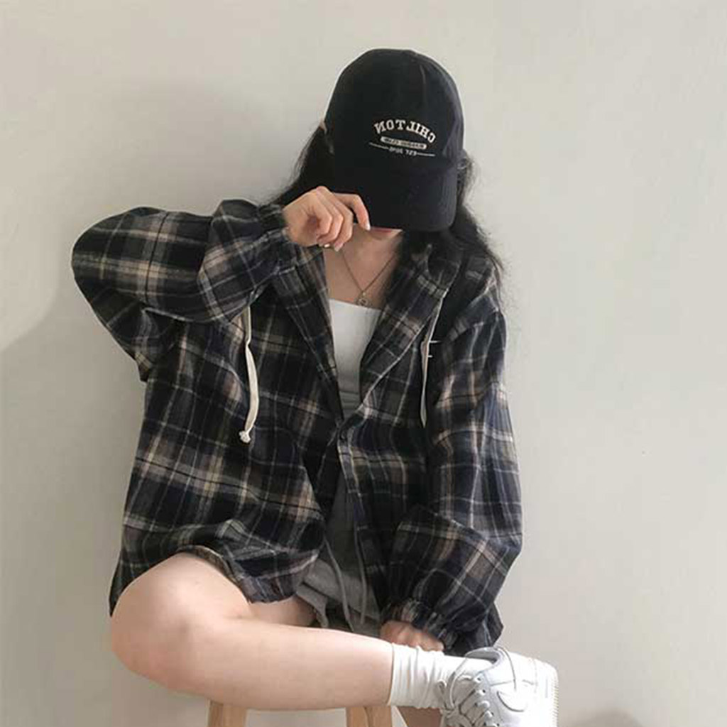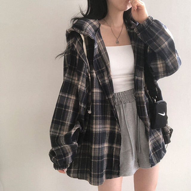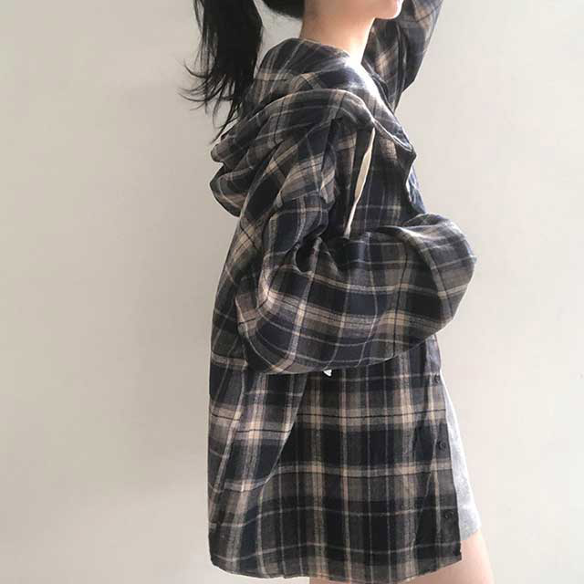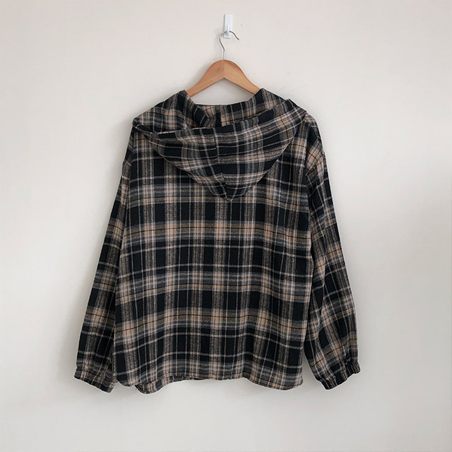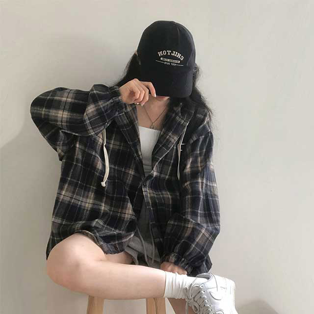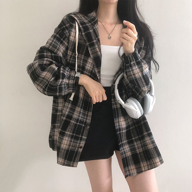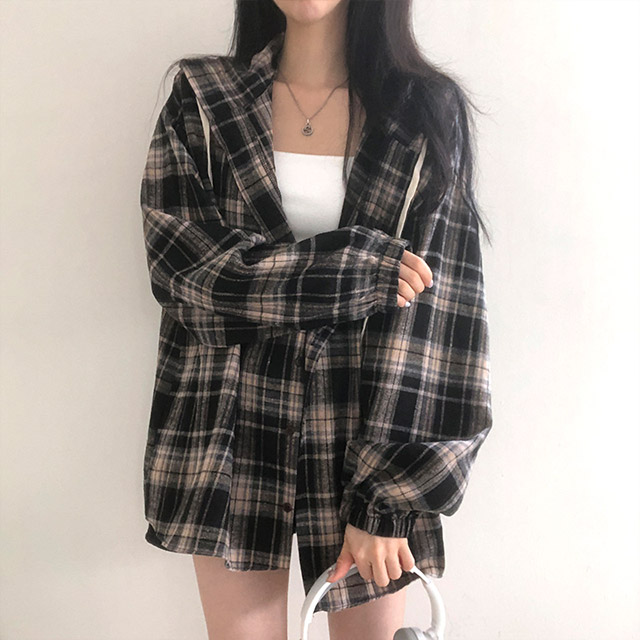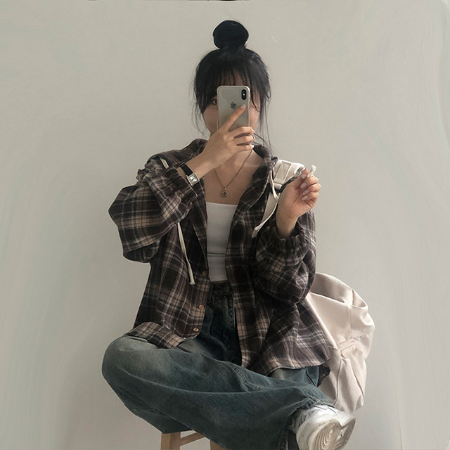 [3color]カジュアル秋ルーズチェックフード付きシャツ