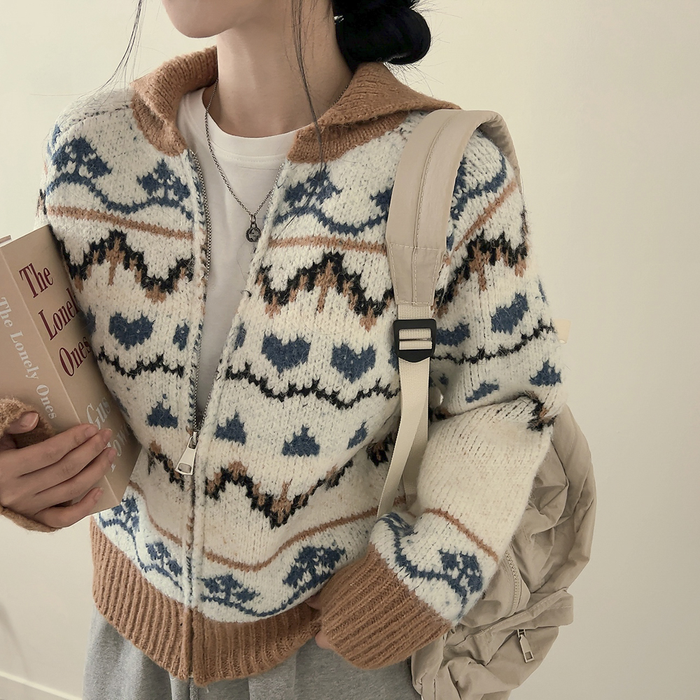 ハートバイカラーカラーニットジップアップカーディガン