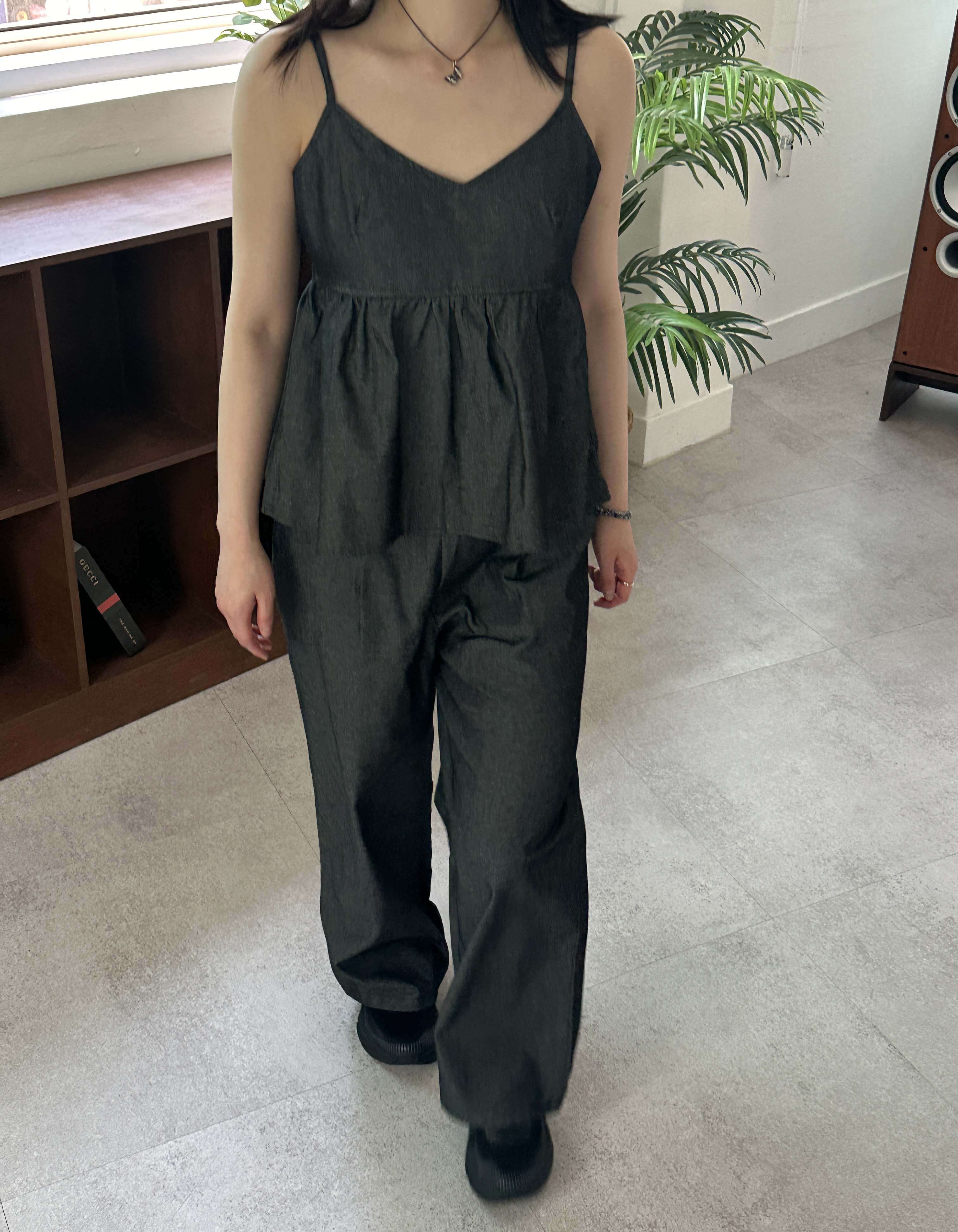 デニムノースリーブ+ゴムワイドパンツ2ピースセット[2color]