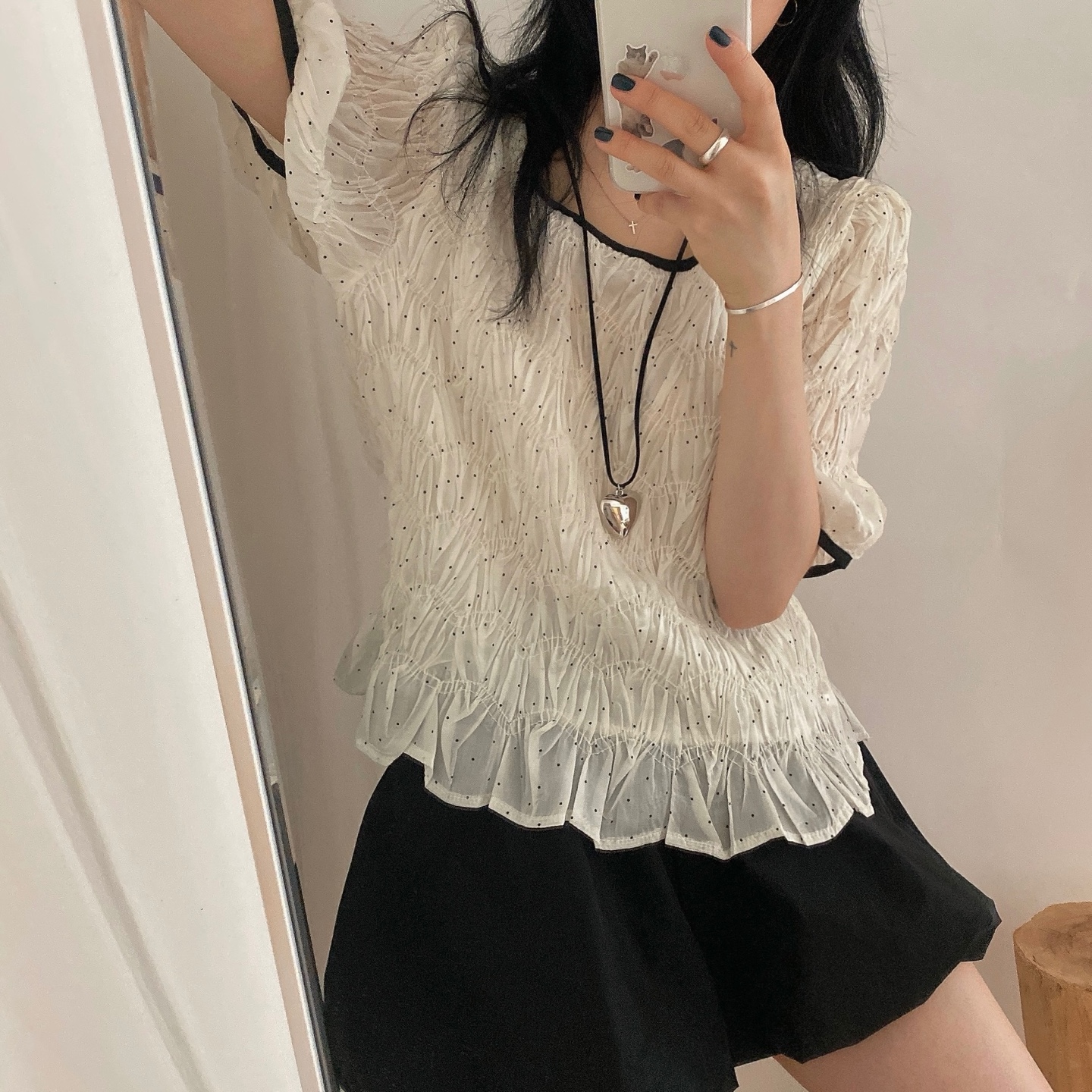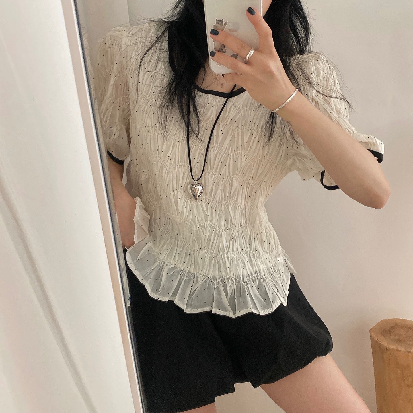 シフォンシャーリングリボンラウンドネックパフブラウス