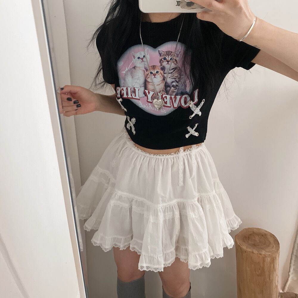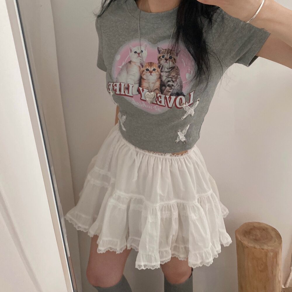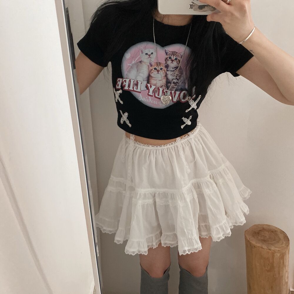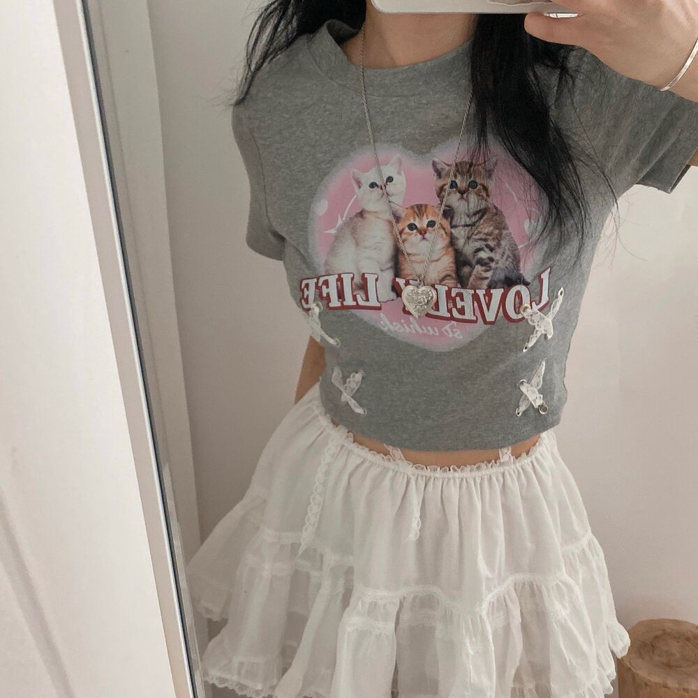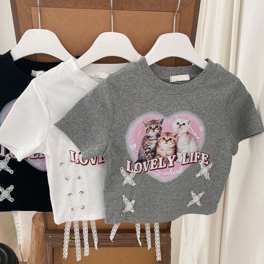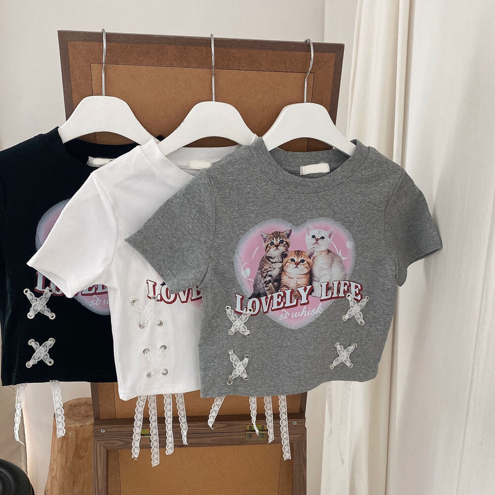 猫ハートプリントクロップドレース半袖Tシャツ
