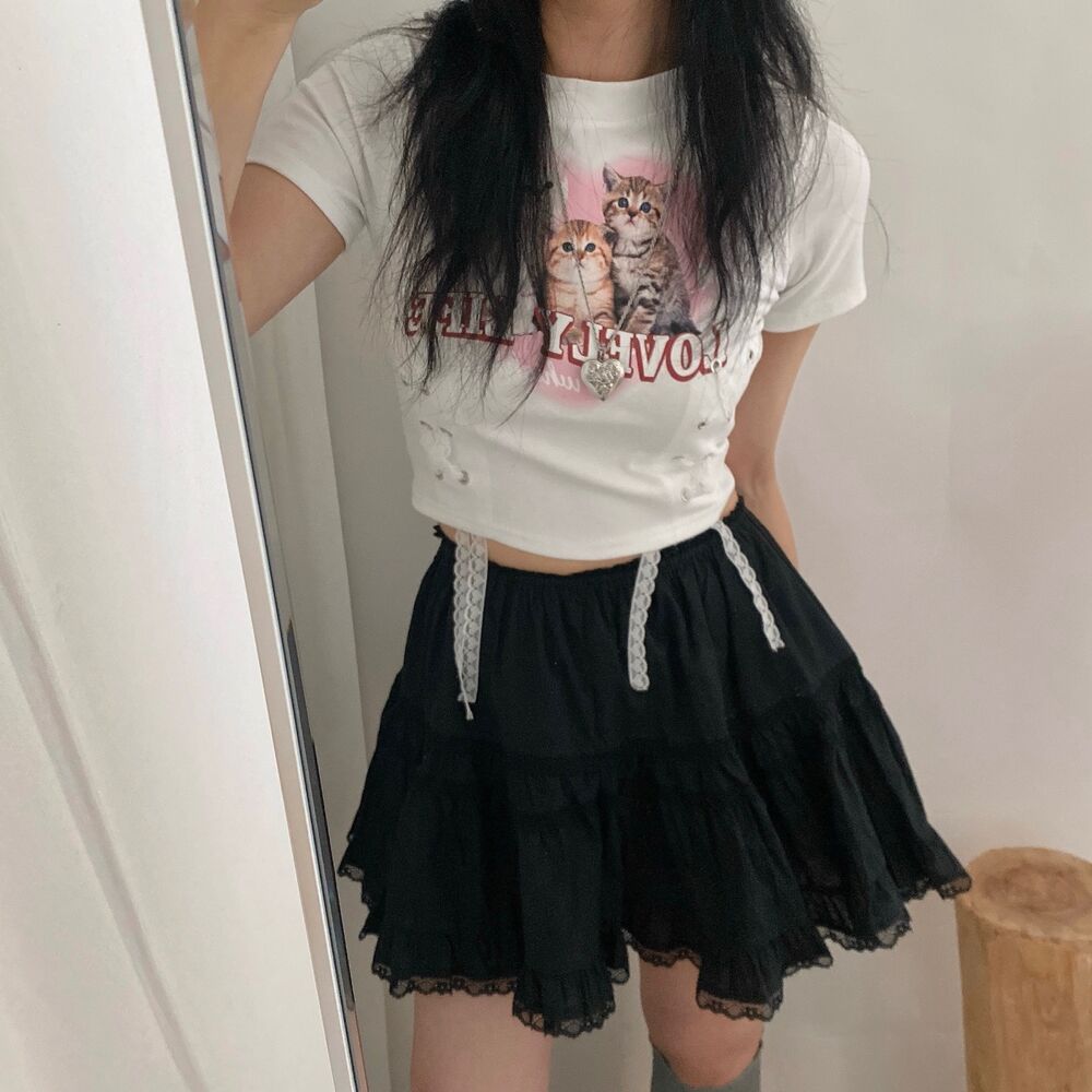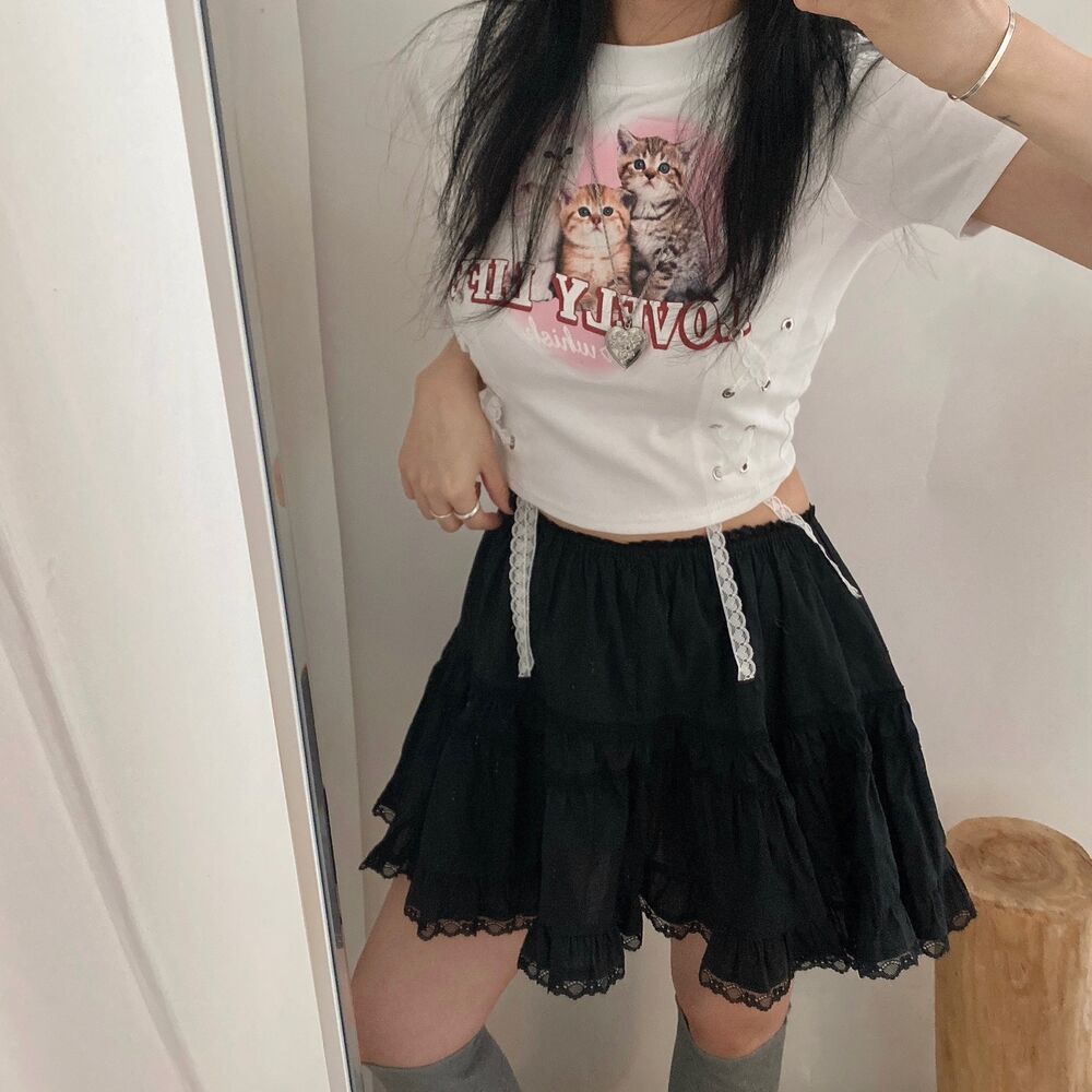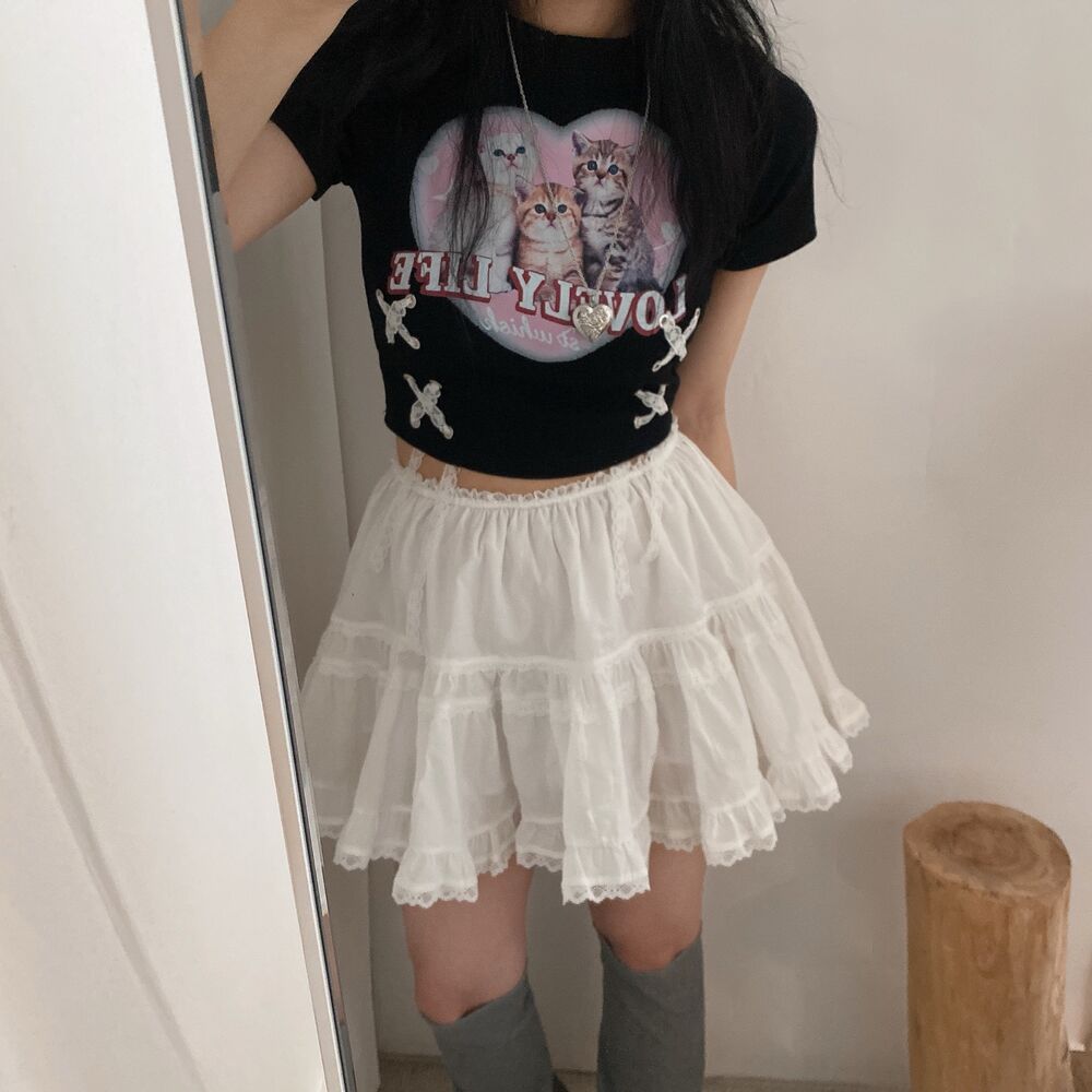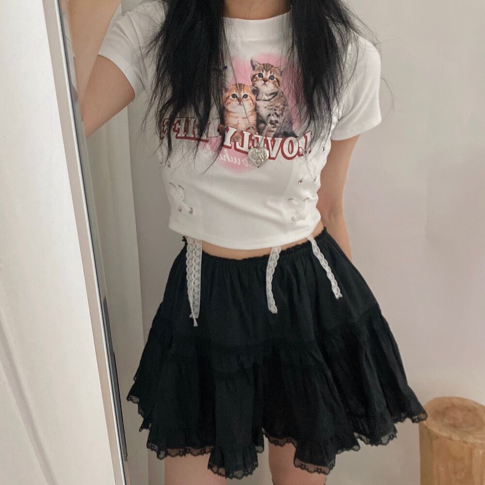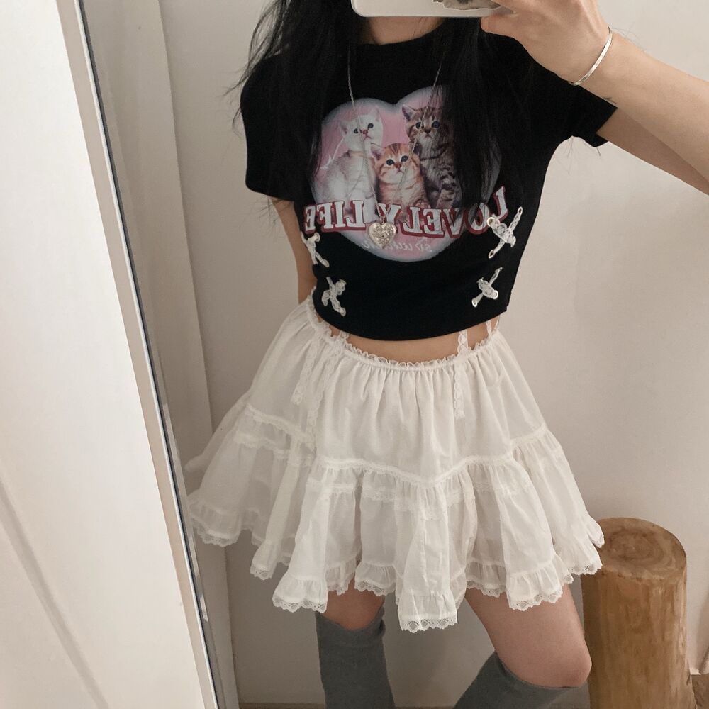 猫ハートプリントクロップドレース半袖Tシャツ